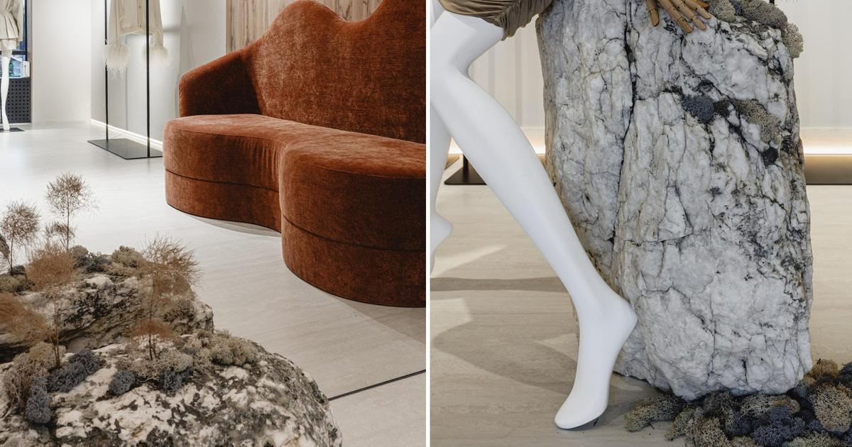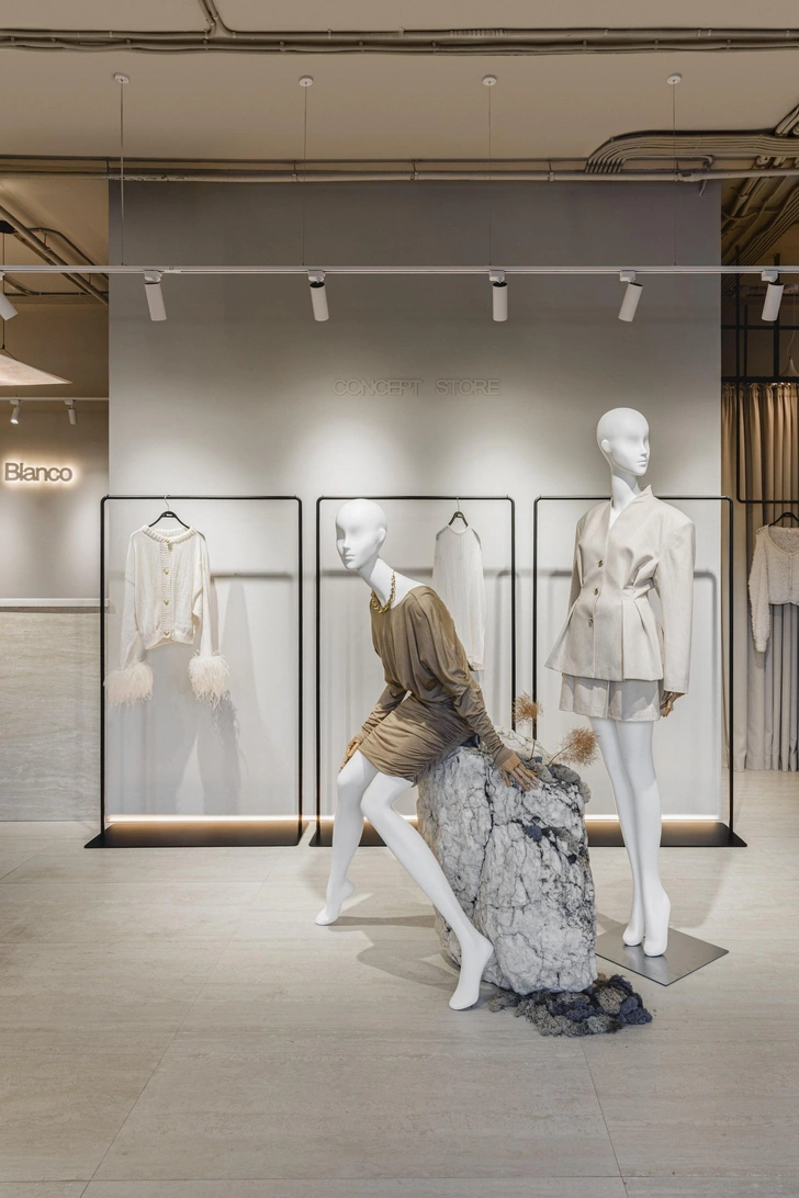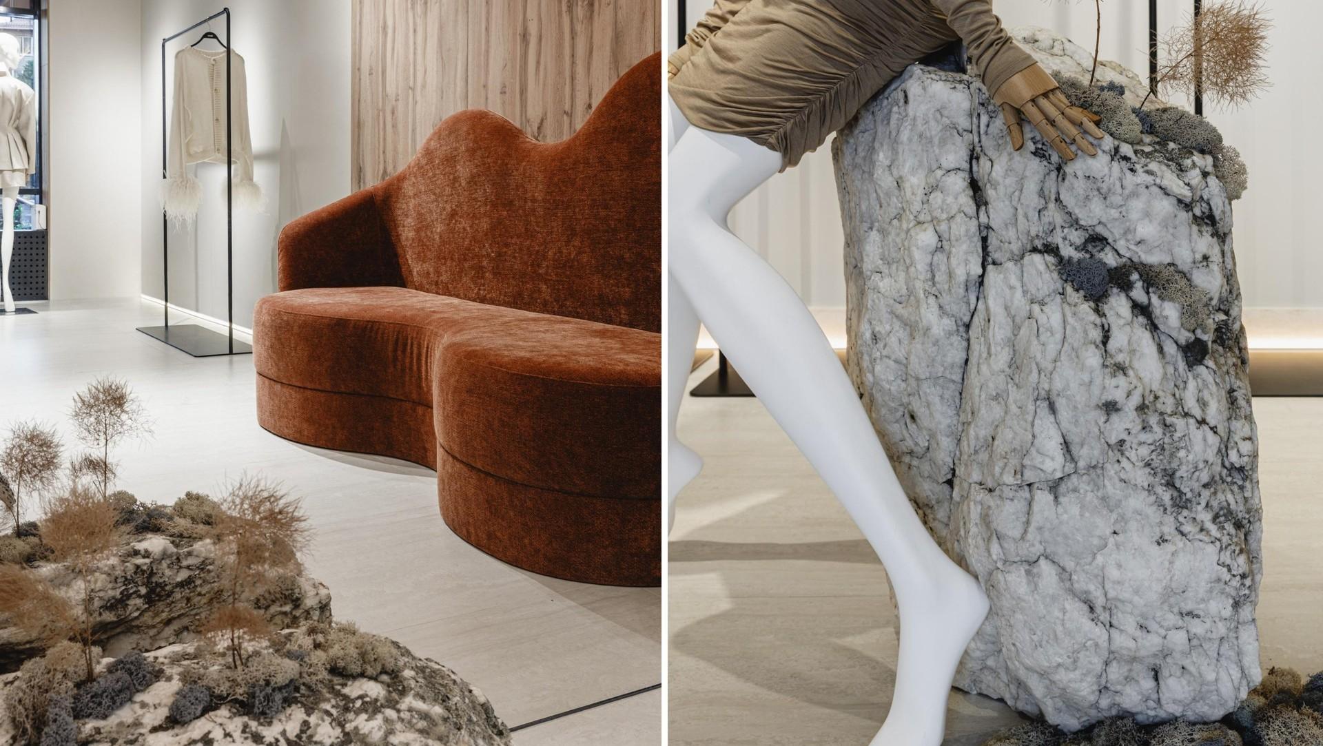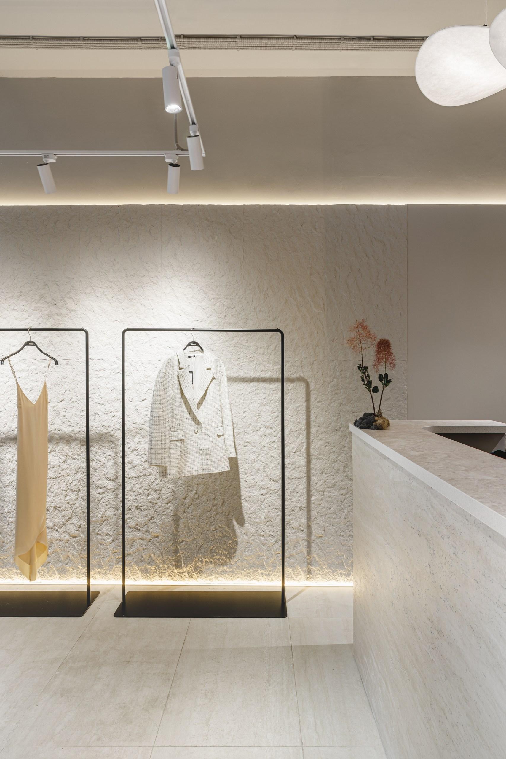 Примерочные мы оформили легким текстилем: это не только помогло сэкономить, но и — самое главное — создало ощущение легкости, уюта. Здесь нет ничего загромождающего — и даже массивные камни не утяжеляют, а, напротив, создают интересный контраст между грубым и мягким. Помню, как мы выбирали эти камни: было это в сорокоградусную краснодарскую жару. Солнце их настолько накалило, что от них шел какой-то пар — казалось, что находишься в бане. Никогда не забуду лицо продавца, уже бордовое от такой изнуряющей погоды.