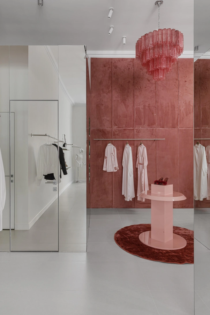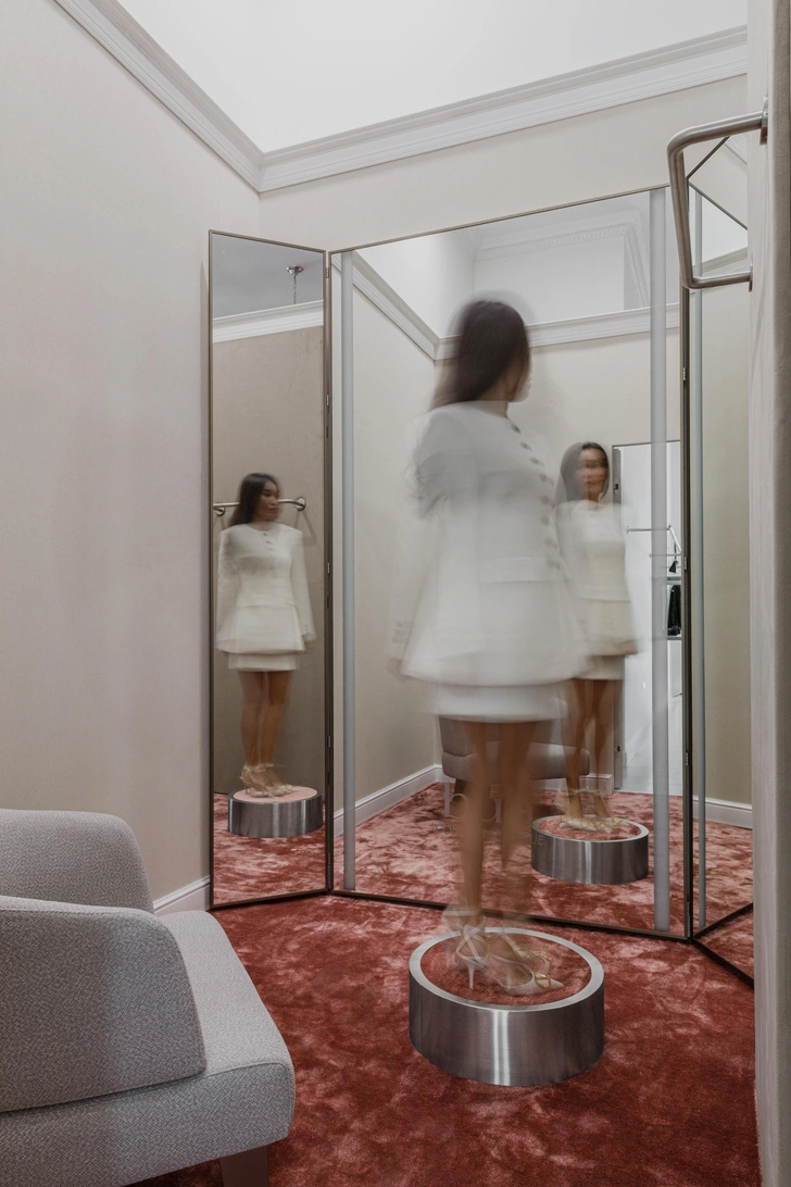 Самым необычным элементом стала зеркальная примерочная-куб. Это не просто функциональная зона, а арт-объект, соединяющий эстетику и практичность. Внутри — мягкие обои под ткань, кресло, подиум и тройное зеркало, создающие интимную, почти будуарную атмосферу. В фасад куба встроены открытые полки для обуви, смотрятся необычно: обувь будто парит. Такая игра с экспозицией отражает нашу главную идею — баланс между функциональностью и индивидуальной эстетикой.