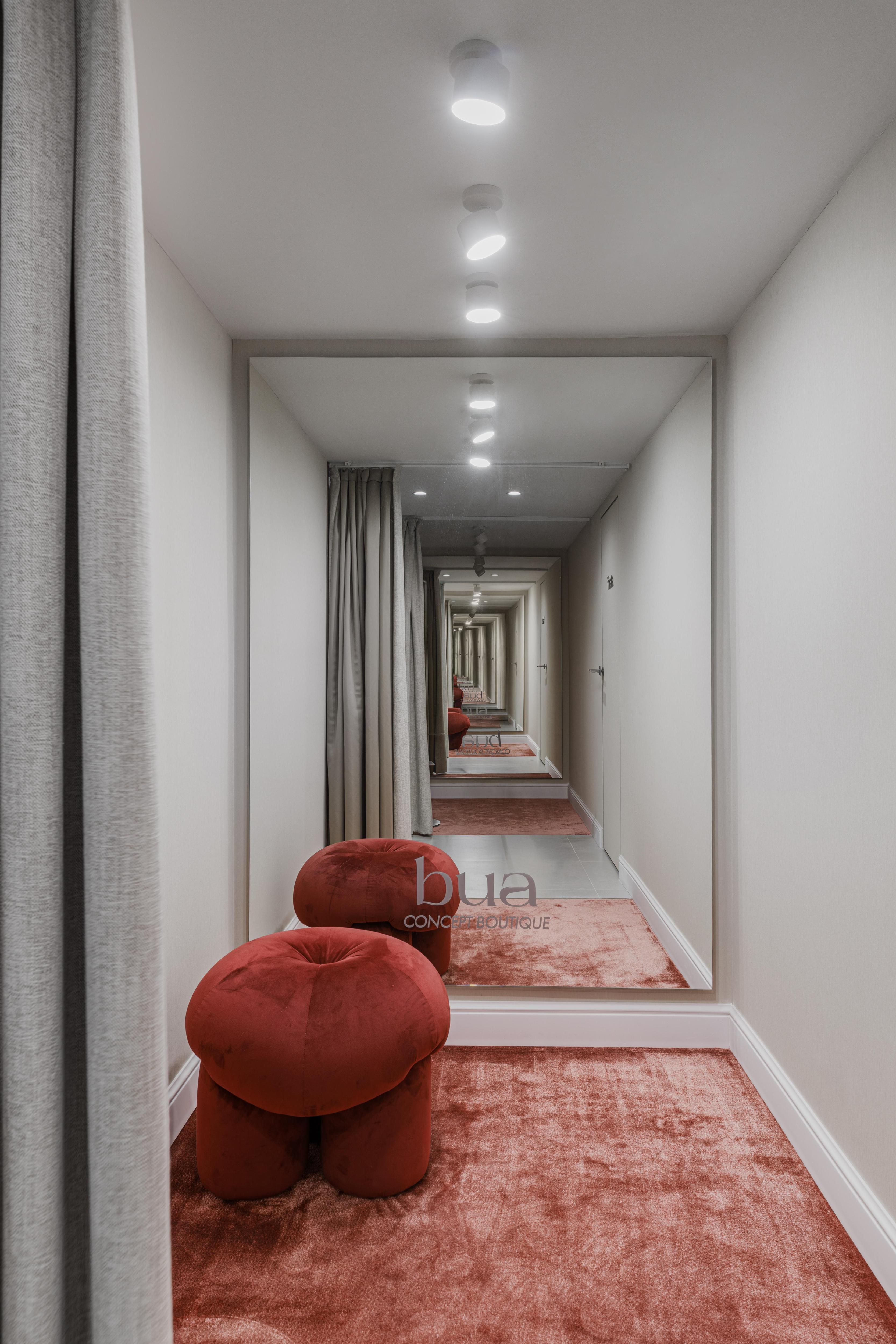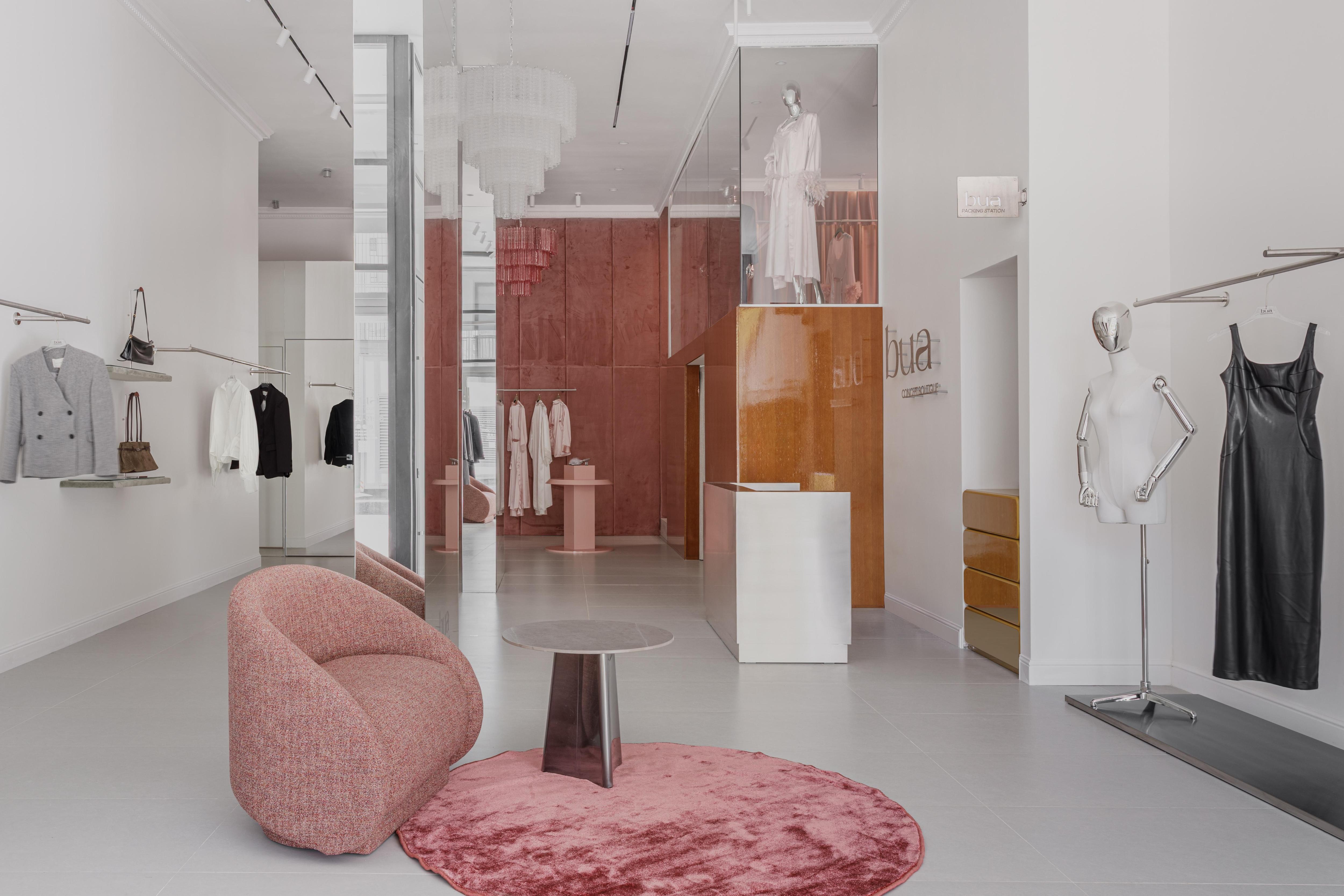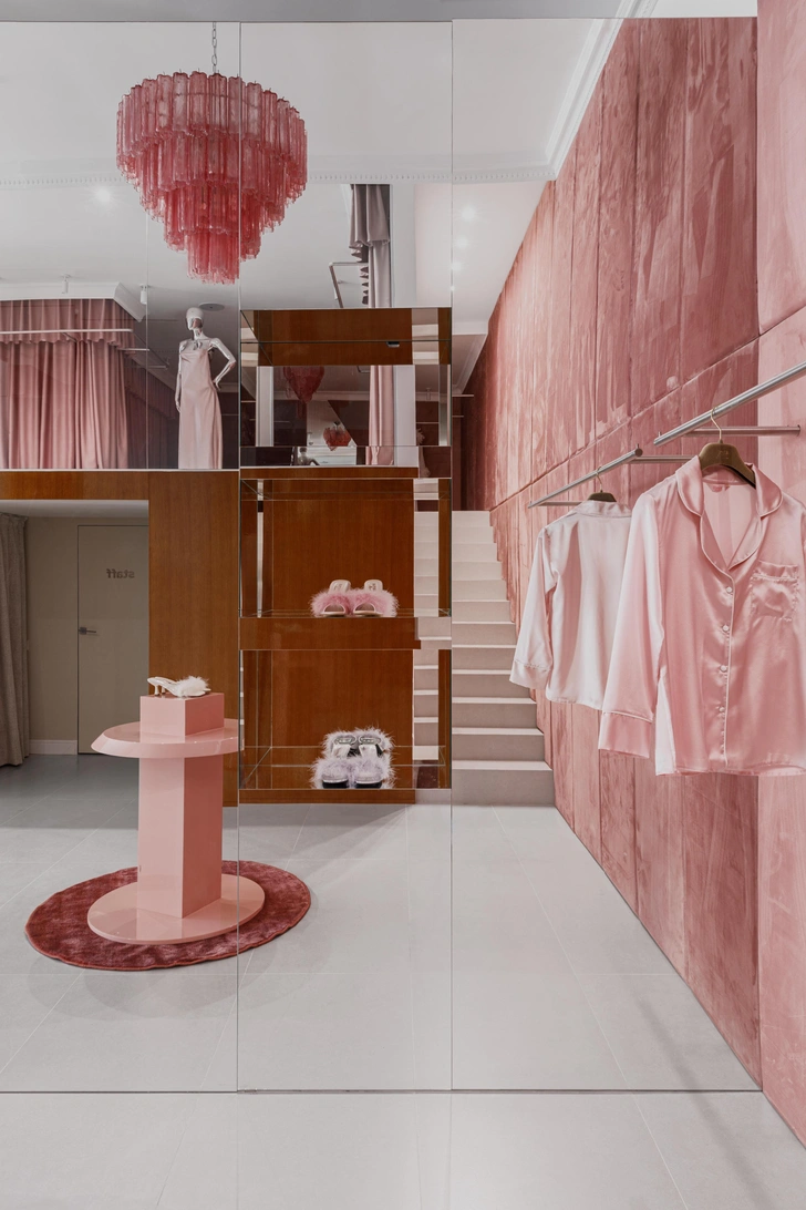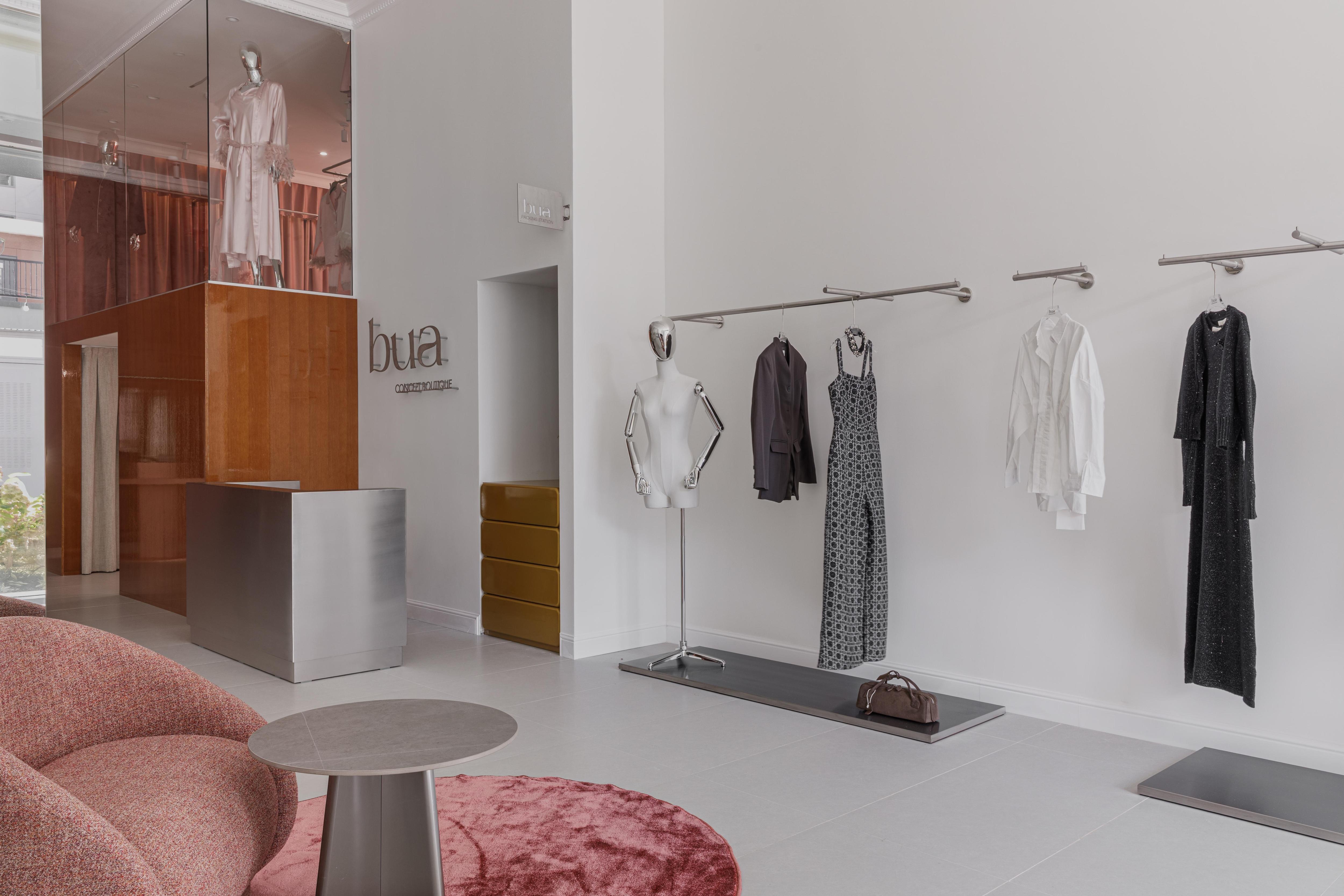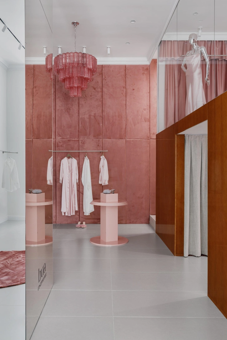 Мы создавали этот бутик для основательницы бренда BUA, она развивает в нем два направления — повседневную и домашнюю одежду. Заказчица хотела, чтобы шоурум был ярким, необычным и запоминающимся, но при этом оставался функциональным и комфортным для клиентов. Конкретных референсов не было — все создавалось интуитивно.