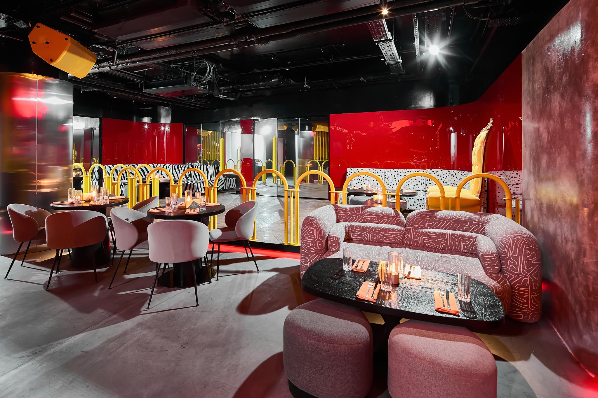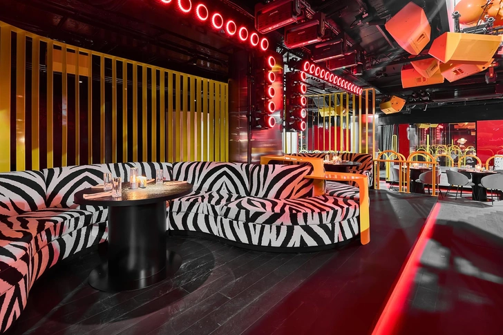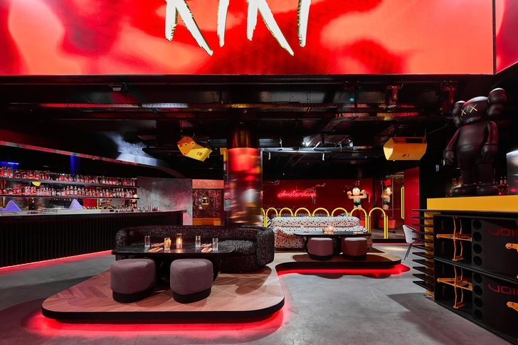 Пространство наполнено арт-объектами из личной коллекции Тимати: хромированный Микки-Маус, фигурка KAWS, витраж с Канье Вестом и другие элементы квартиры артиста. Фирменный цвет Giallo Inti, оттенок желтого как у Lamborghini, встречается в интерьере и логотипе, задавая яркий визуальный код площадки.