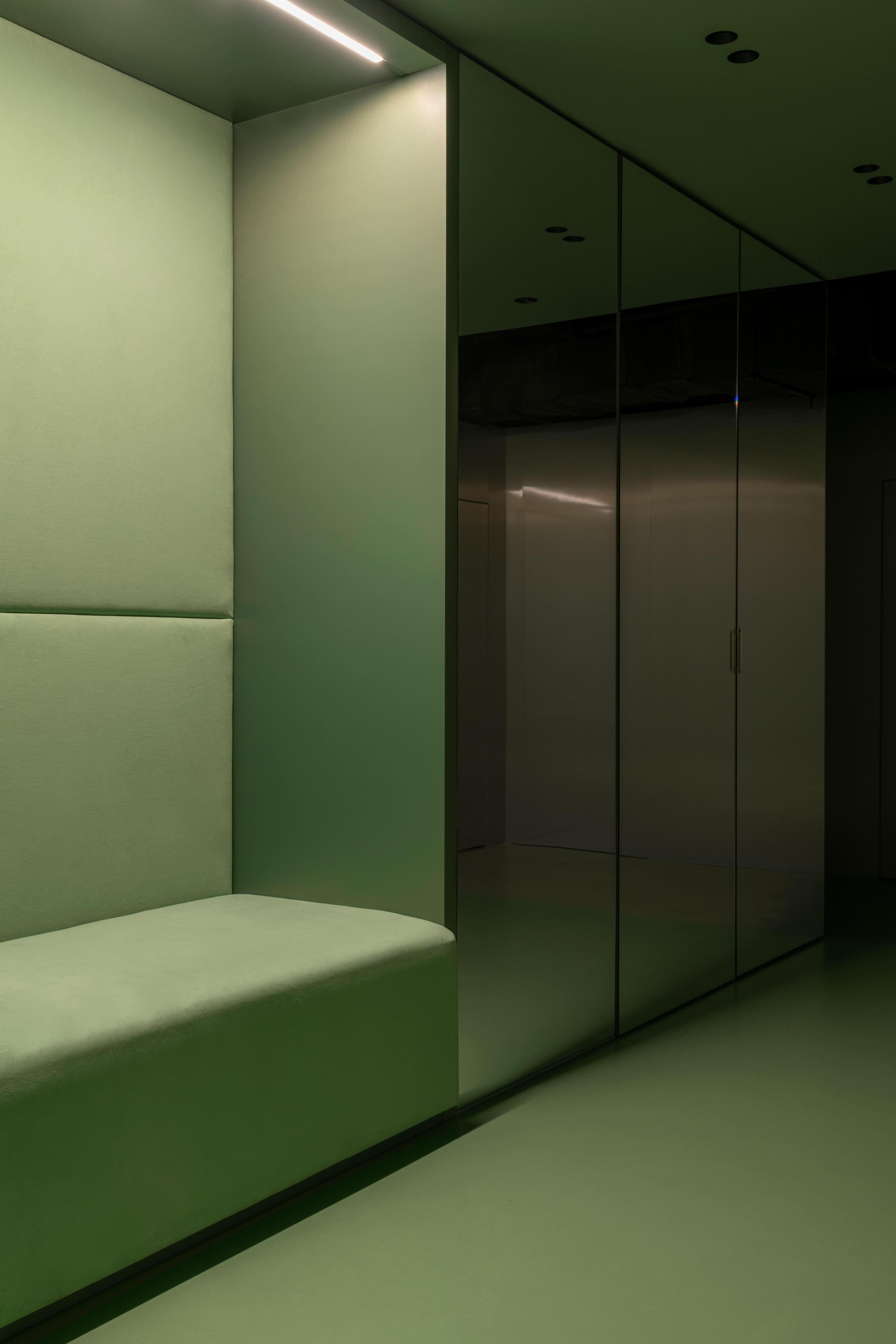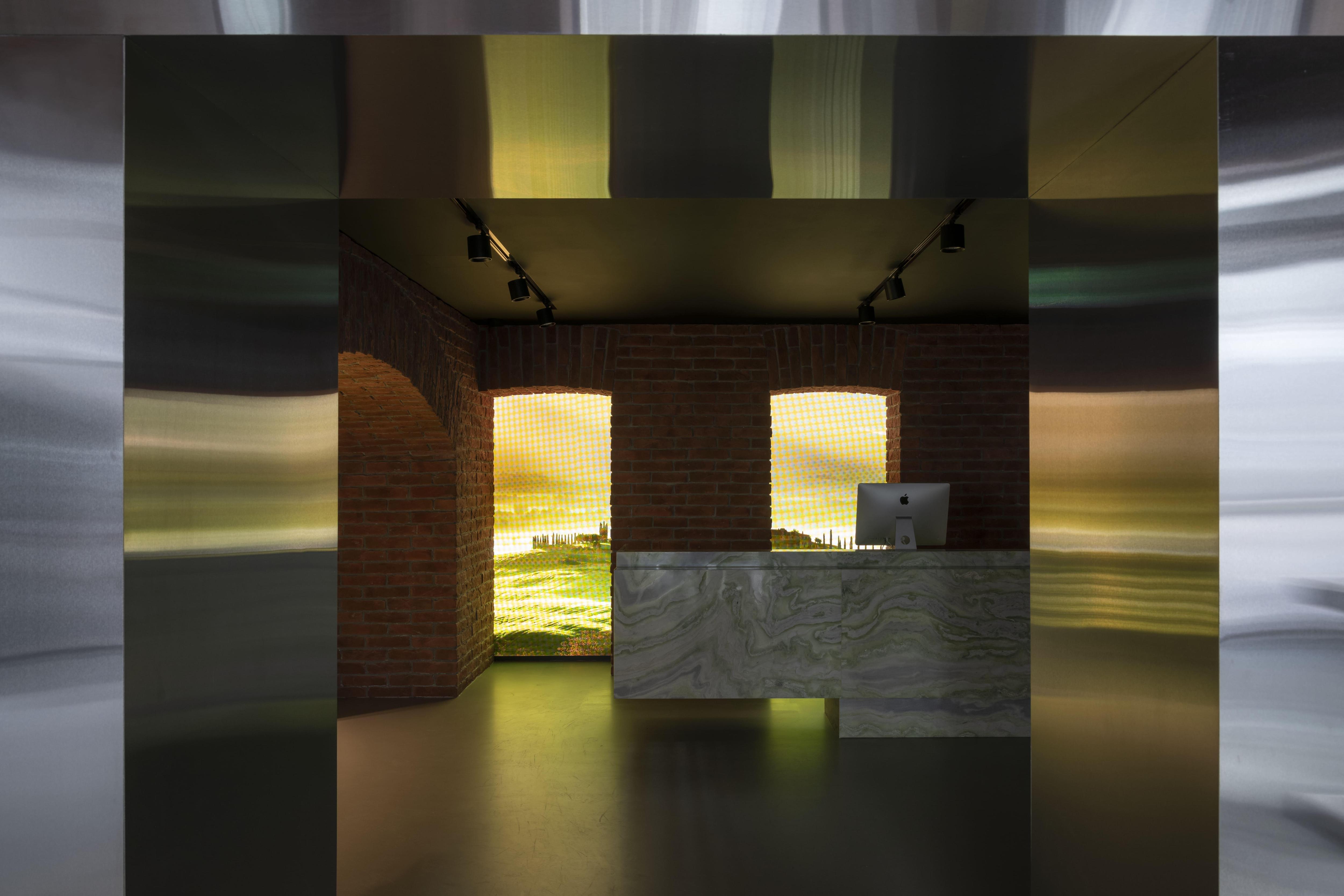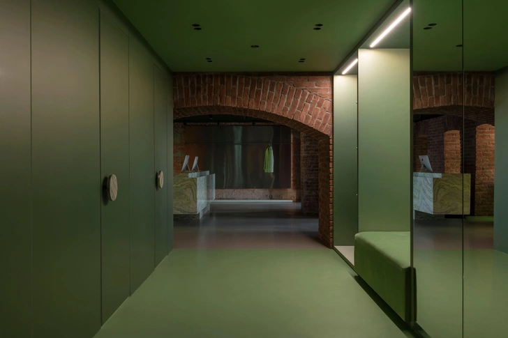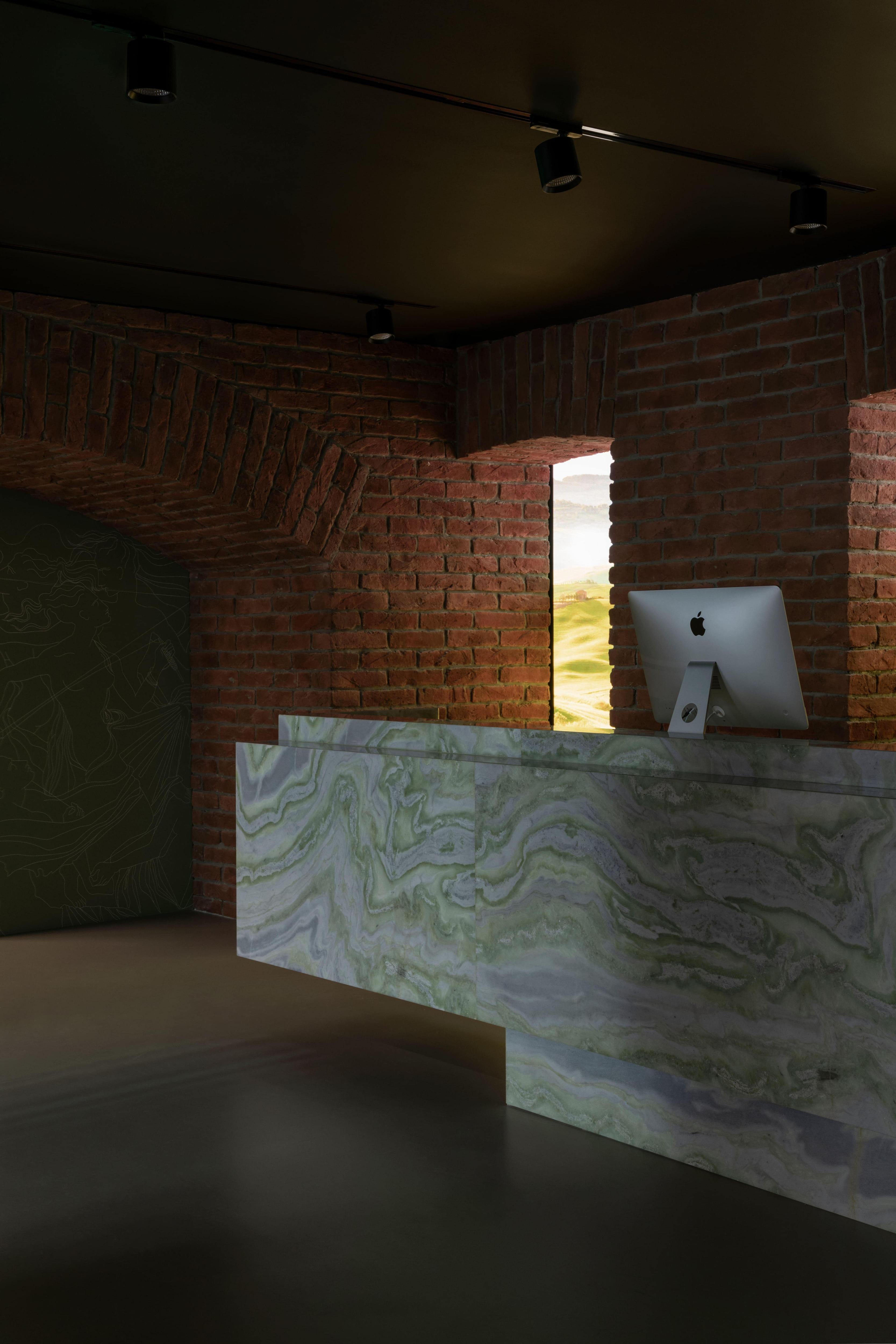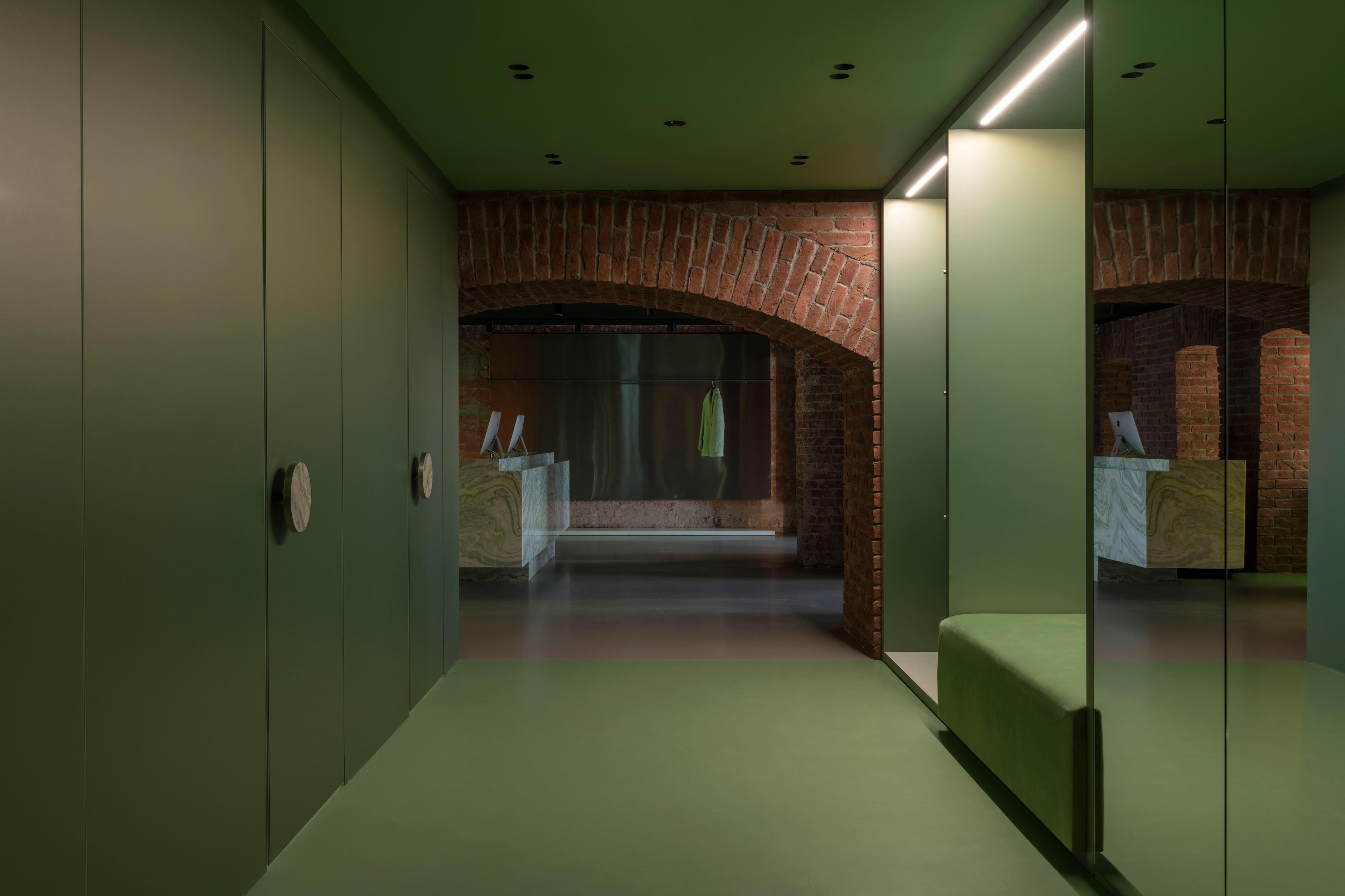 В противовес фактурному кирпичу мы взяли чистые технологичные и современные материалы, которые добавляют современности и ощущение футуризма. Нержавеющая сталь с ее отражающей шлифованной поверхностью и сложным ярко-зеленым цветом (повторяющемся и в натуральном ониксе) — формируют отдельные функциональные зоны.