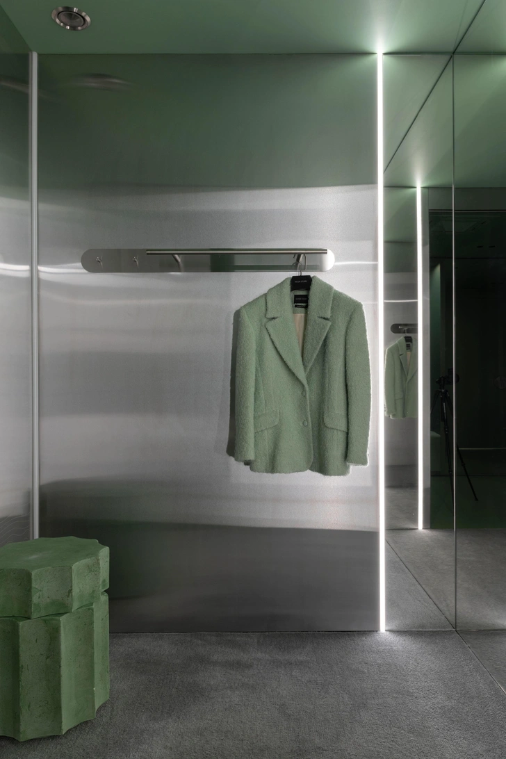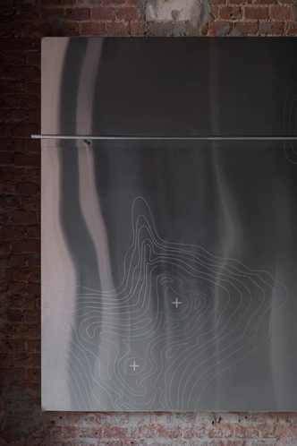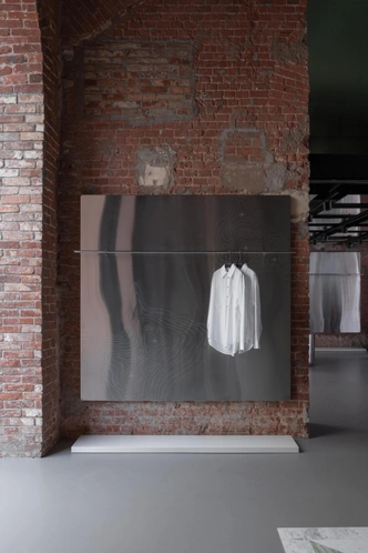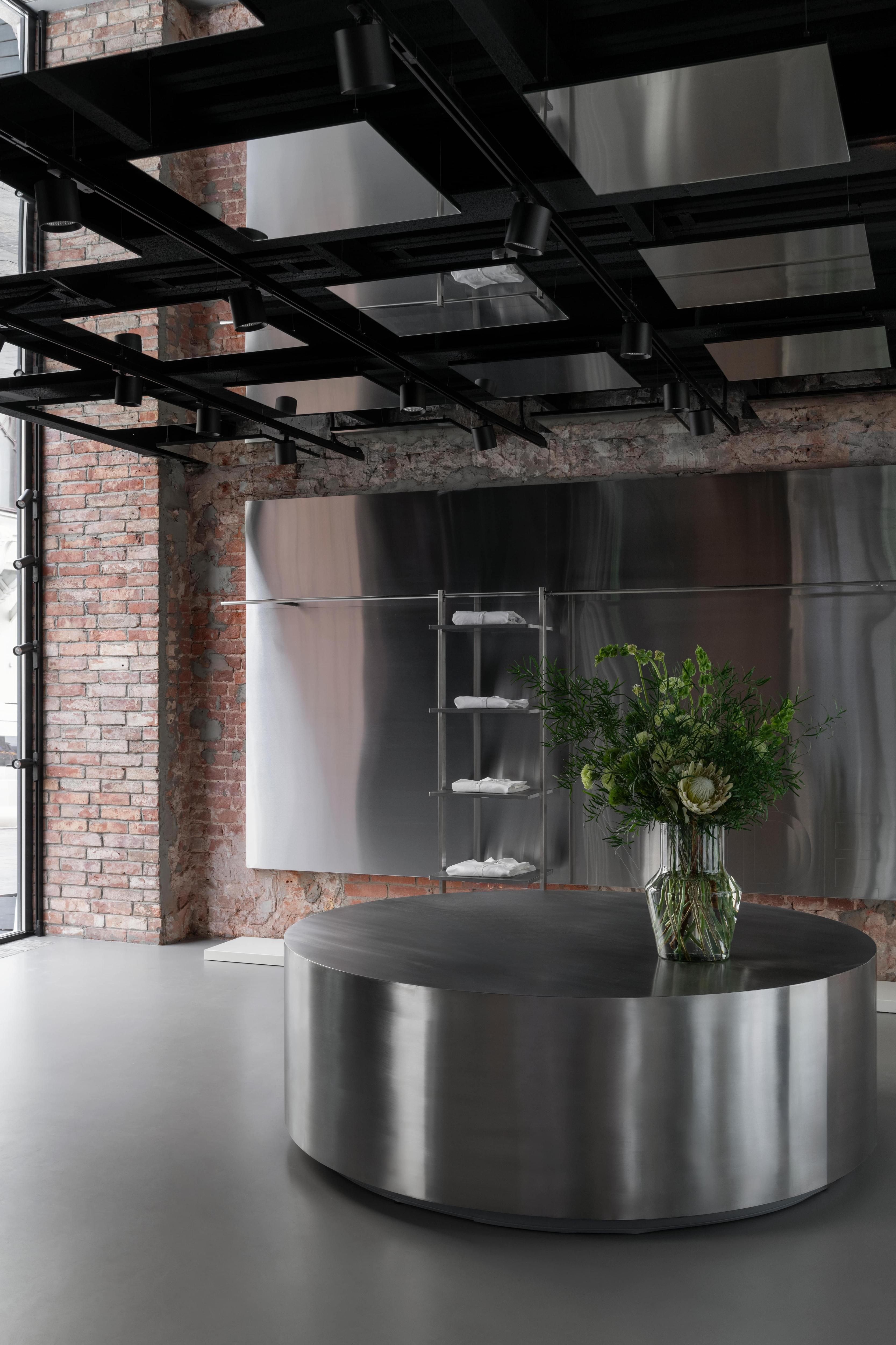 Поверх чистых поверхностей нержавейки в некоторых местах было решено добавить гравировку в стиле текущих коллекций бренда. Добавили графику с плетущими нити богинями, как отсылку к командной работе бренда и швейному делу.