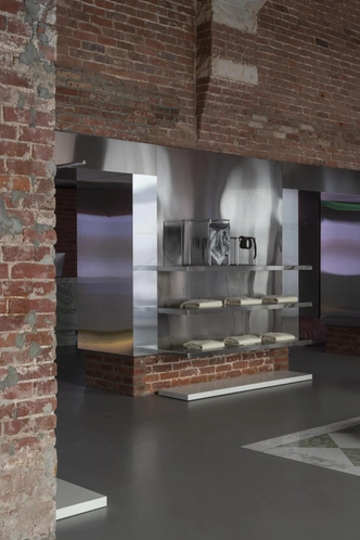 Мы постарались по максимуму привести в порядок кирпич, не нарушив целостности конструкции сводов и стен. Нам важно показать его историю, его трещины и отпечатки времени. Добавили двухсторонние шинотреки: часть светит в потолок, чтобы подсветить кирпичные своды и текстуру кирпича, а другая часть — на торговое оборудование.