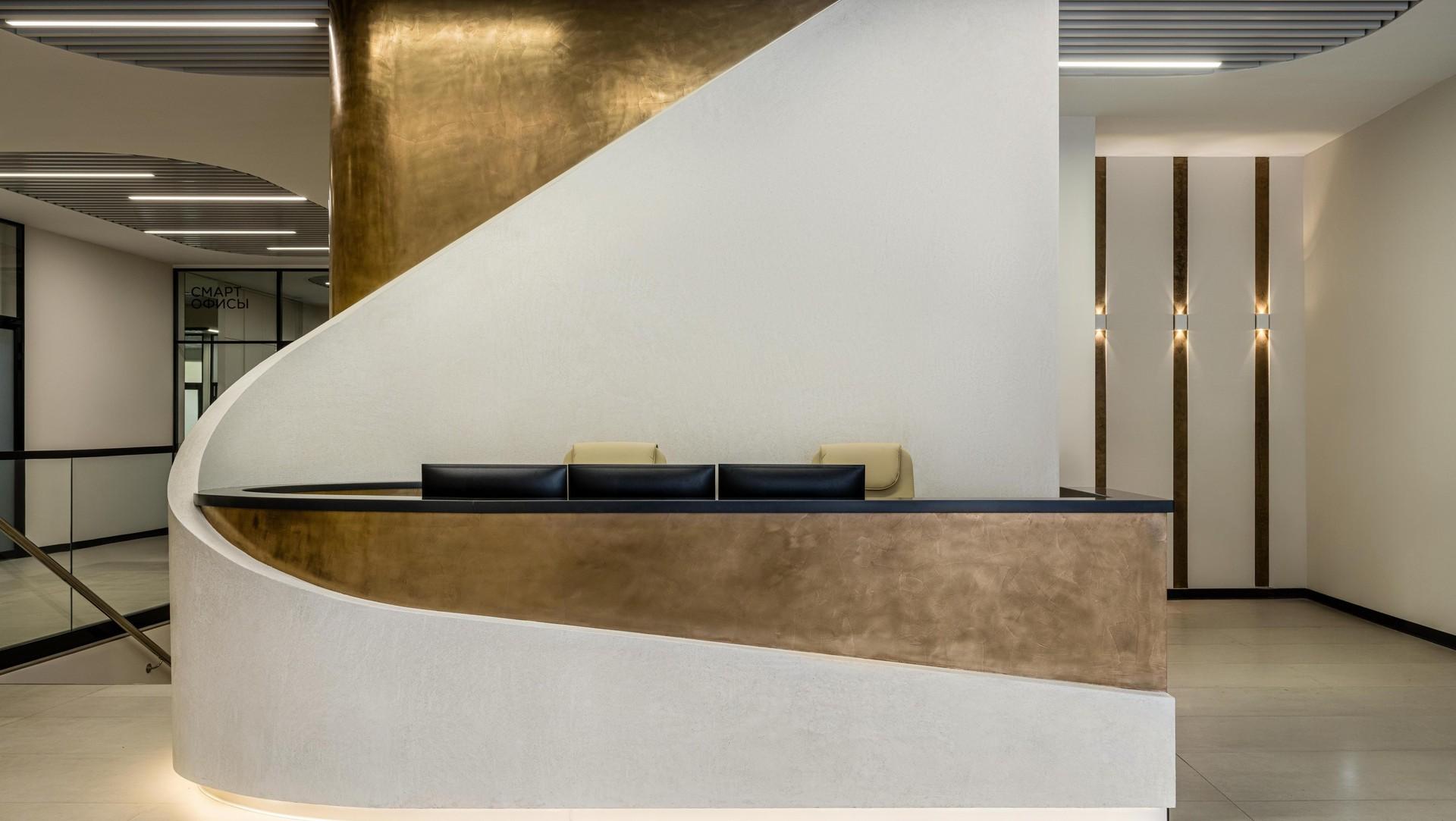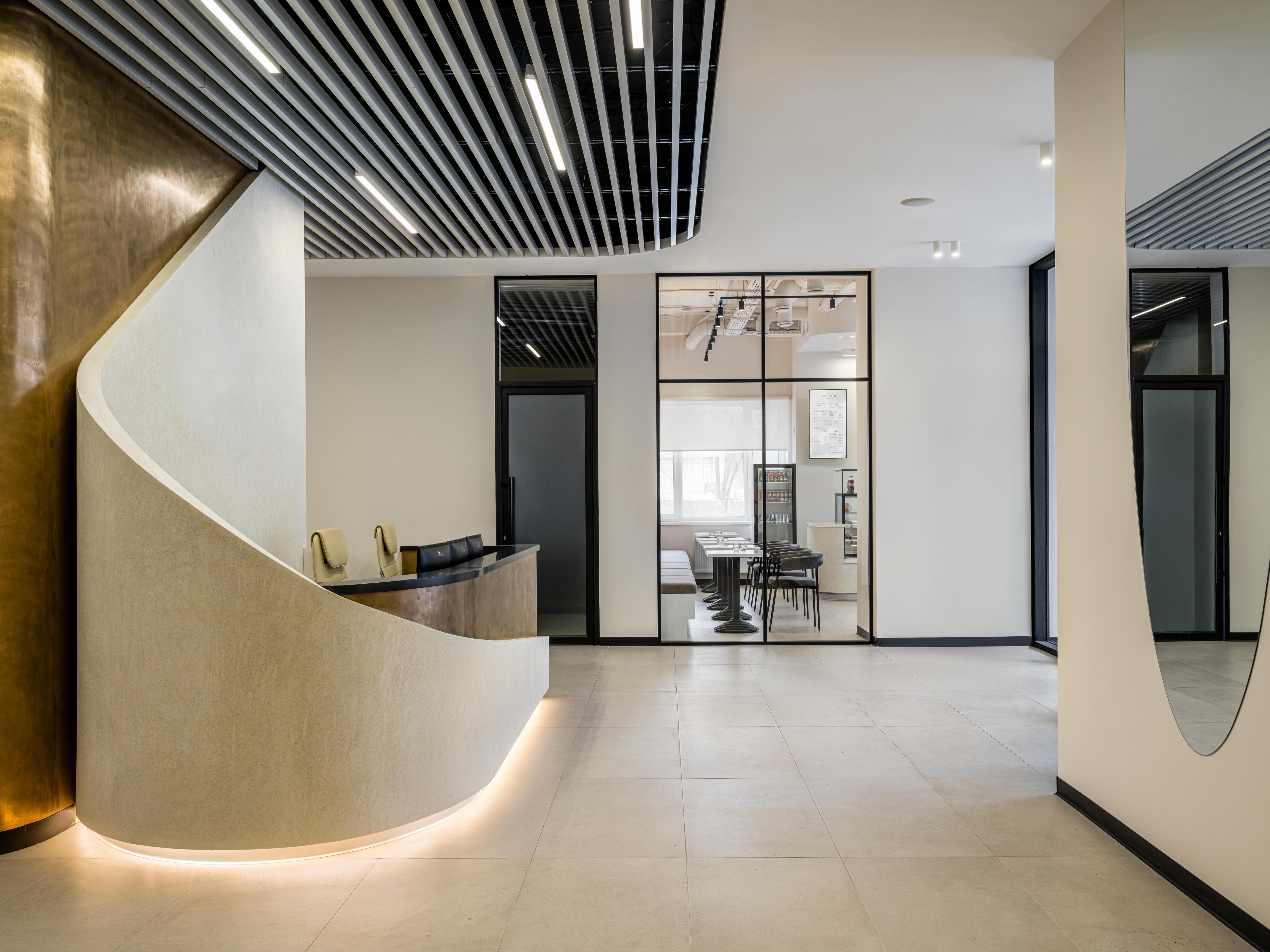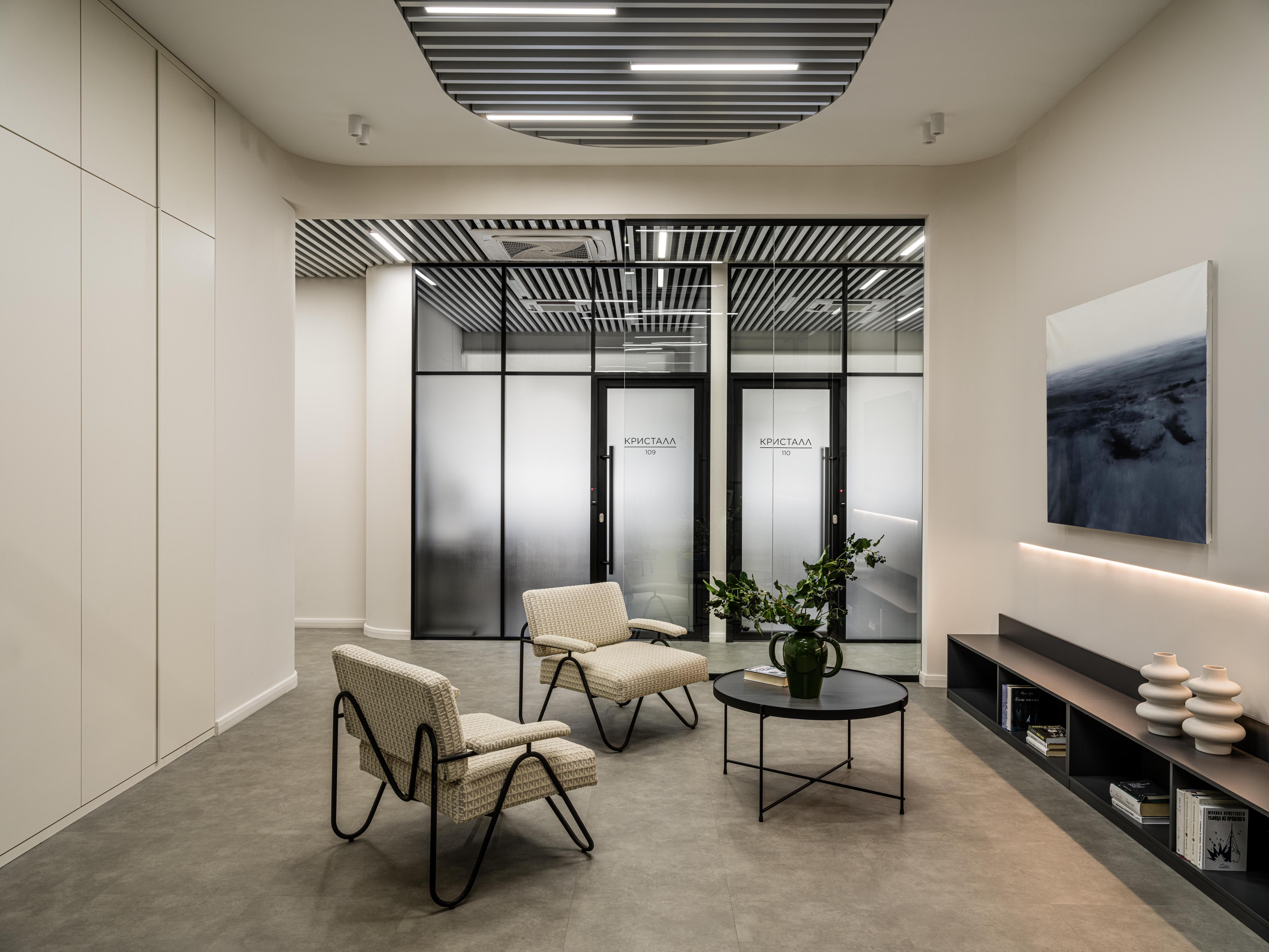 Затем мы обустроили кафе, банк и зоны офисов. Источником вдохновения для нас послужило название бизнес-центра: формопластику интерьера образуют блики от кристалла, острые или мягкие рефлексы.