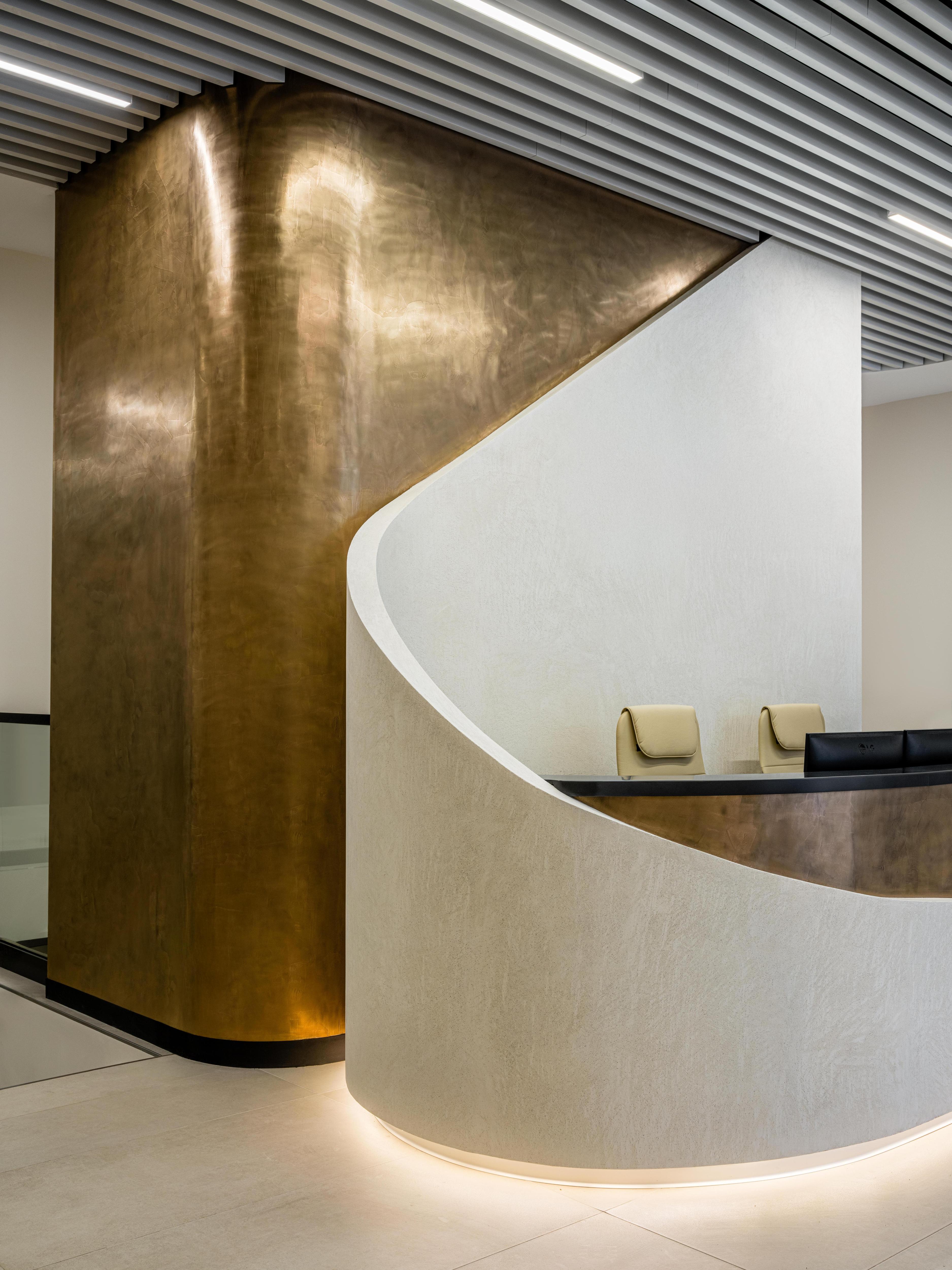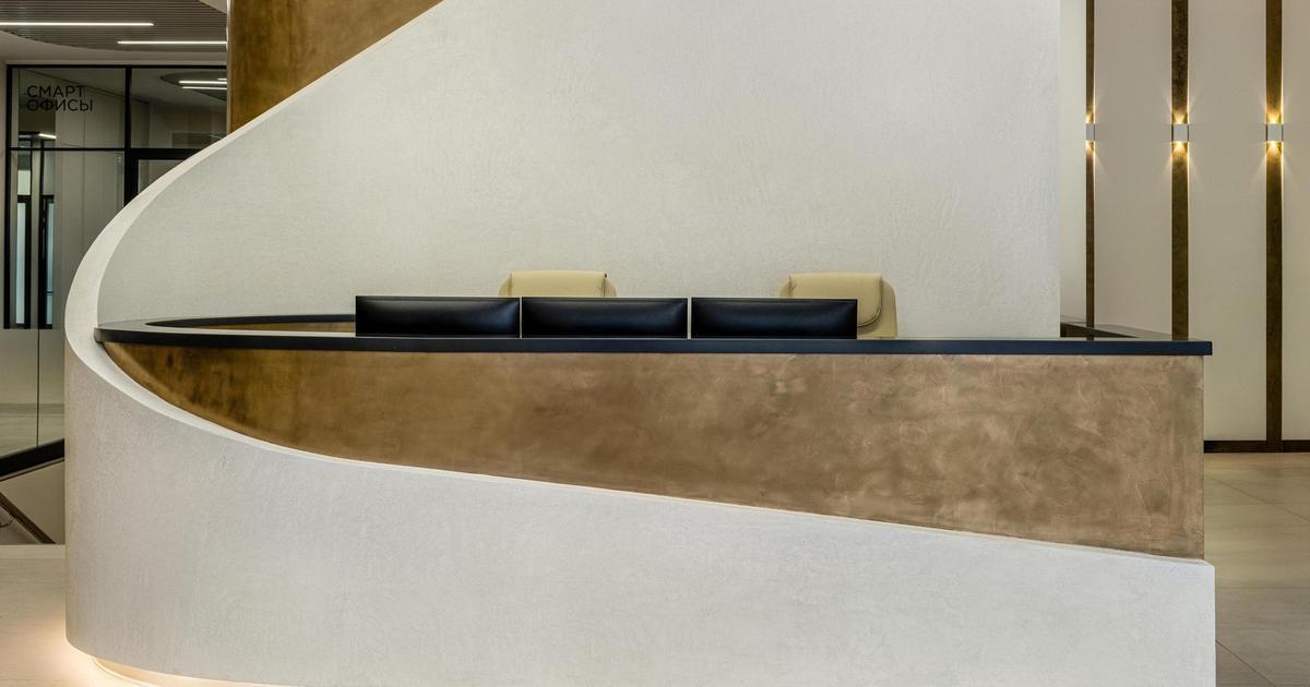 Когда мы наносили декоративную штукатурку из жидкого металла, выглядело это достаточно пугающе — напоминало старое ржавое пятно. Заказчик нас аккуратно спрашивал, точно ли мы согласовывали именно такой цвет — мы и сами до конца не были уверены, что все получится, но после полировки стало понятно, что мы не ошиблись.