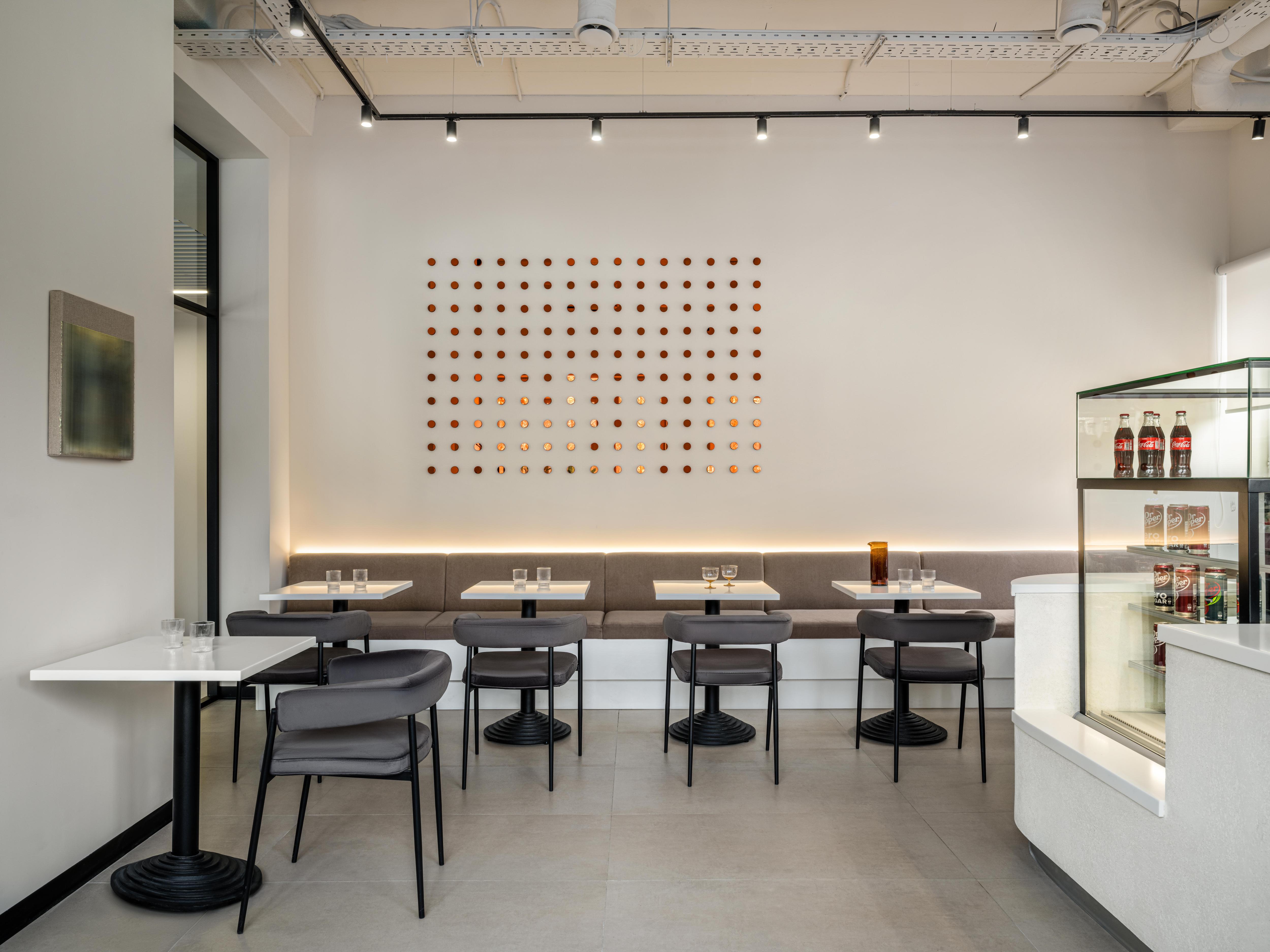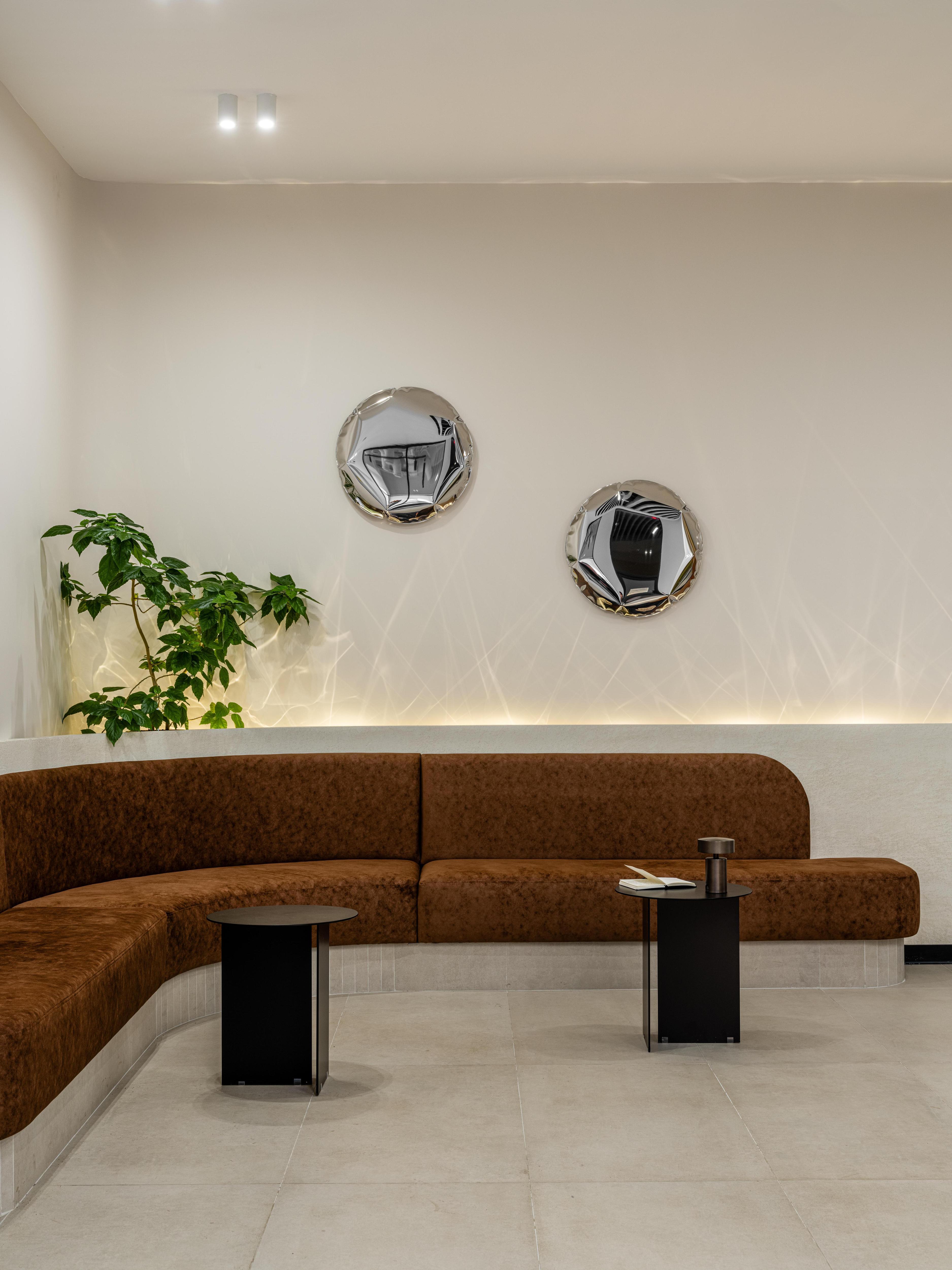 В лаунж-зоне появился диван плавной формы, будто вырастающий из стены. Особое внимание хочется обратить на световые лучи над ним — мы очень долго экспериментировали, создавали прототипы, пробовали разные типы металлов и искали тот самый луч. Так у нас получился кастомный светильник из отдельных диодов на 10-метровой металлической пластине.