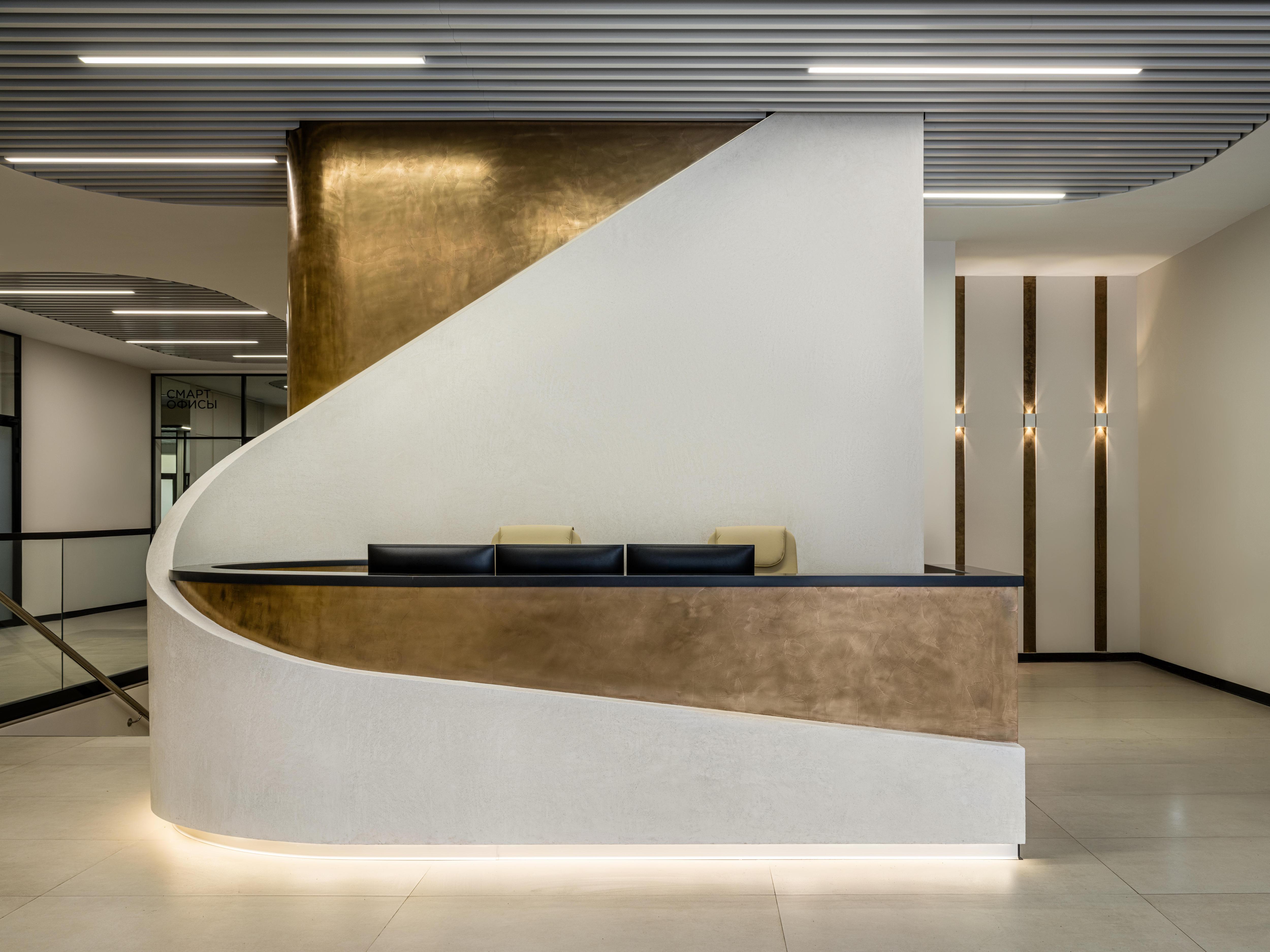 Для этого мы просчитали все до миллиметра, особенно тщательно работали с пластикой ресепшена — стойку будто обнимает плавная ниспадающая линия. Это довольно сложный в исполнении элемент, но команда справилась отлично. Пропорции и высота мы выстраивали сначала с помощью макета из оргалита, потом — проекции на полу, а после создали шаблон из ГКЛ.