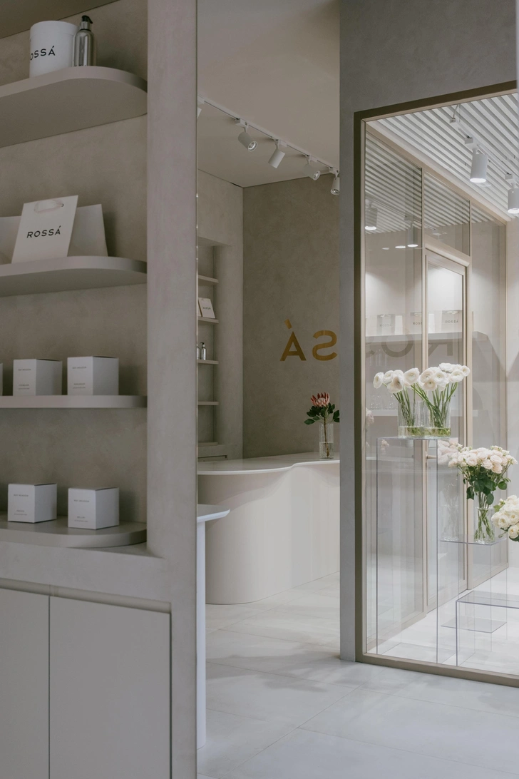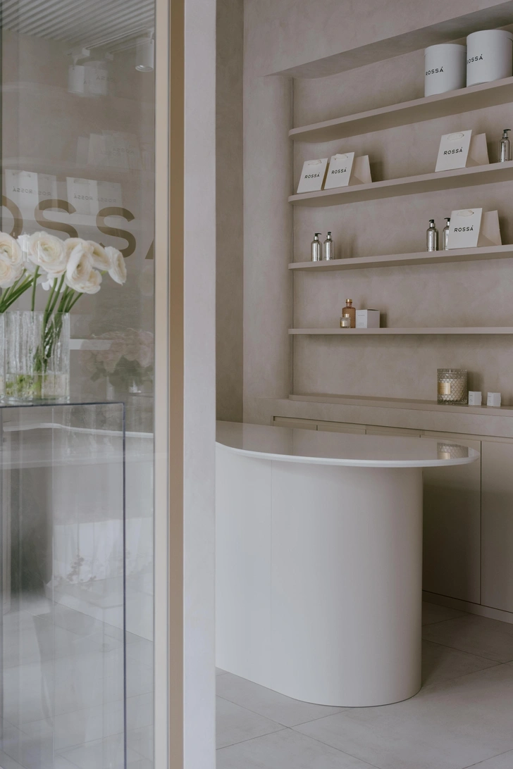 Выделить что-то одно здесь сложно, потому что все элементы взаимосвязаны. Свет и цвет собирает их в целостную картину — зоны плавно переходят одна в другую. По периметру мы встроили стеллажи с бьюти-продукцией, они смотрятся совершенно ненавязчиво. Ключевые зоны выделены направленным светом — получились мягкие акценты. Такой интерьер не отвлекает от красоты цветочных композиций, давая играть им главную роль, и в то же время влияет на их восприятие, дополняет впечатление от покупки.
