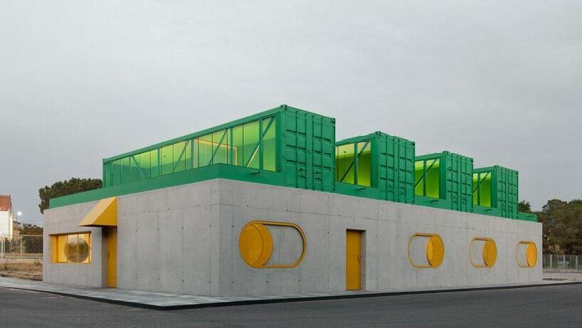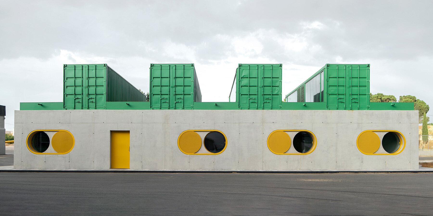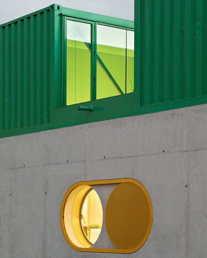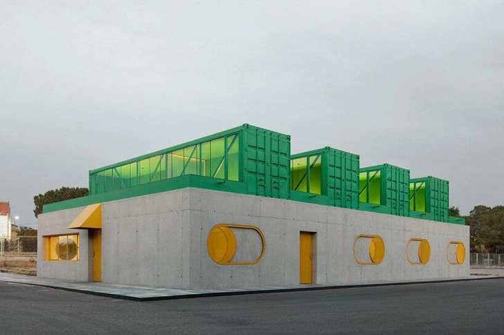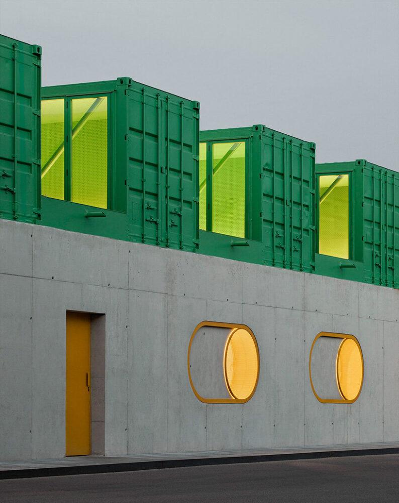 Архитекторы расположили четыре контейнера так, что они образовали зубчатую крышу. Благодаря этому внутри появилась последовательность окон, выходящих на север, которые дают ровный дневной свет. Снаружи зеленые контейнеры стоят на бледно-сером бетонном основании — они перекликаются с окружающими складами, но при этом выглядят как самостоятельный объект.