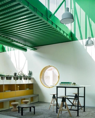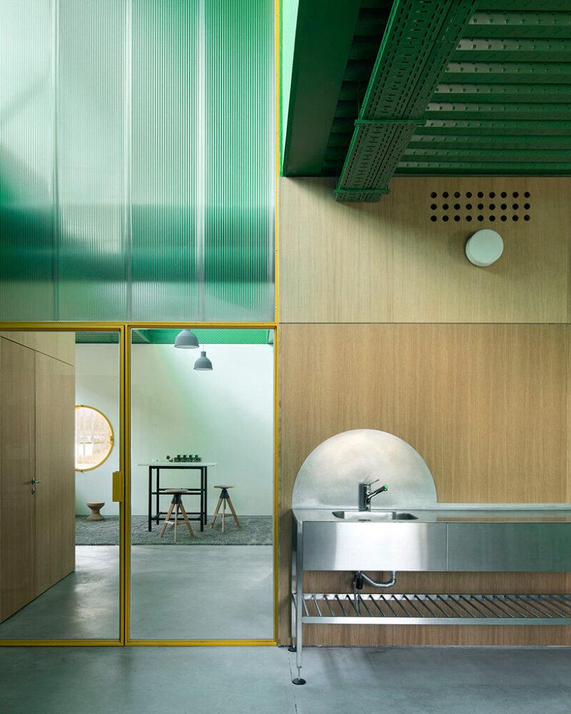 Внутри благодаря необычной крыше появились светлые пространства. Зеленые стальные балки и перфорированные металлические панели формируют потолок, а полупрозрачный поликарбонат фильтрует дневной свет. Он приобретает легкий зеленоватый оттенок, смягчая индустриальную сталь и отбрасывая мягкие тени на белые стены и деревянные перегородки.