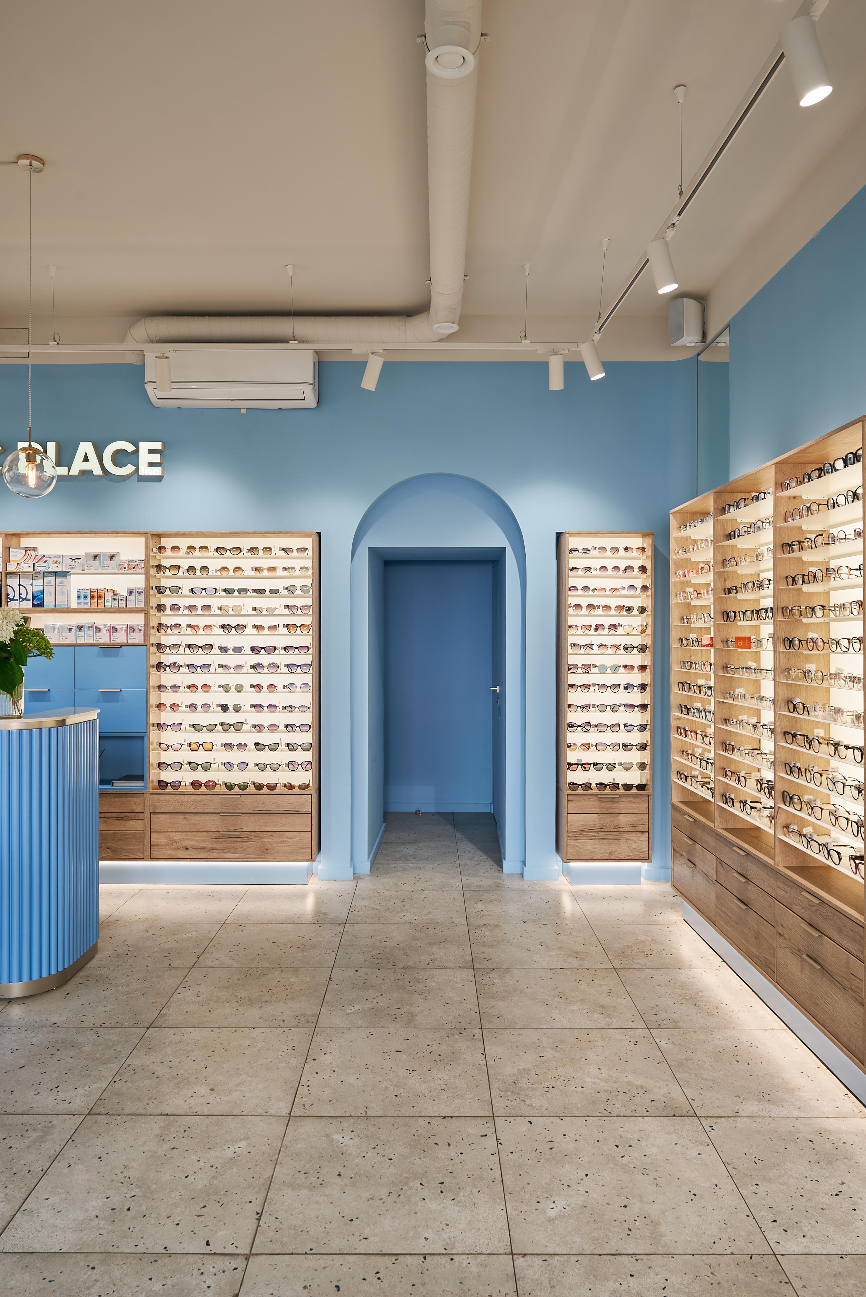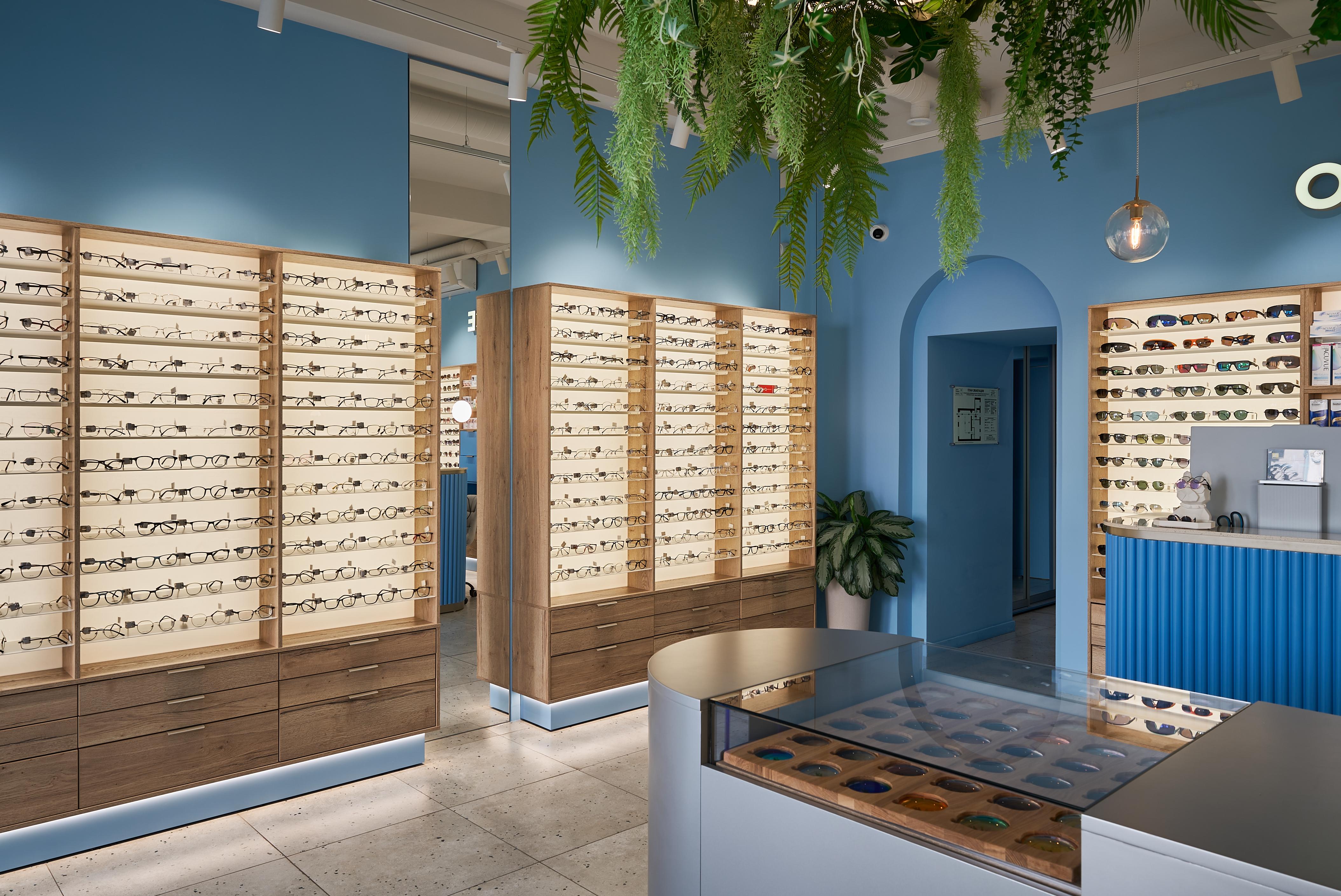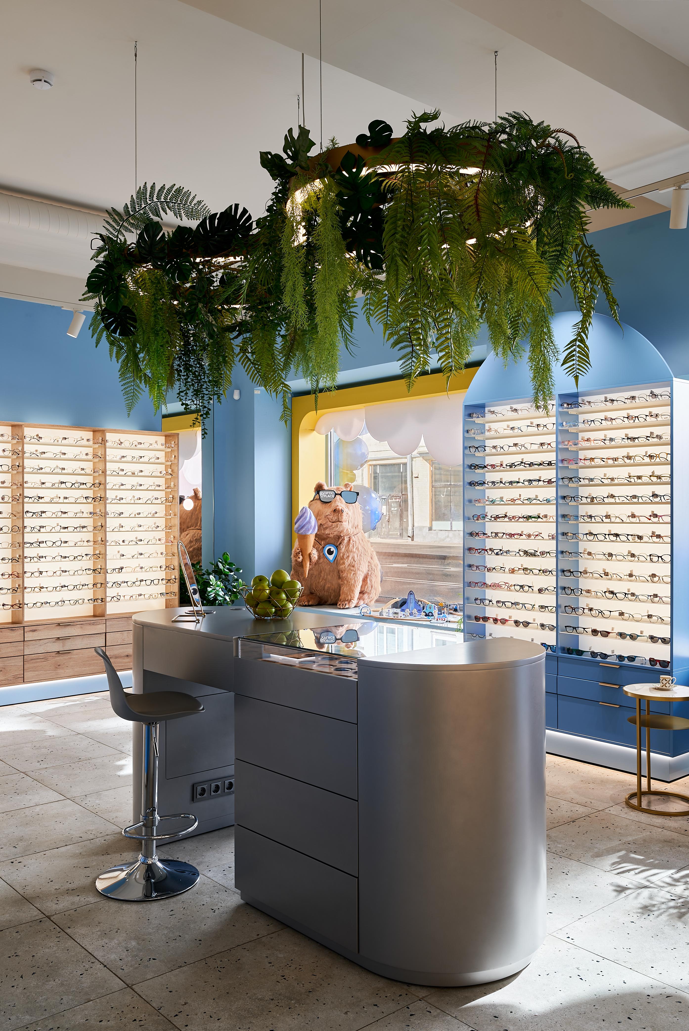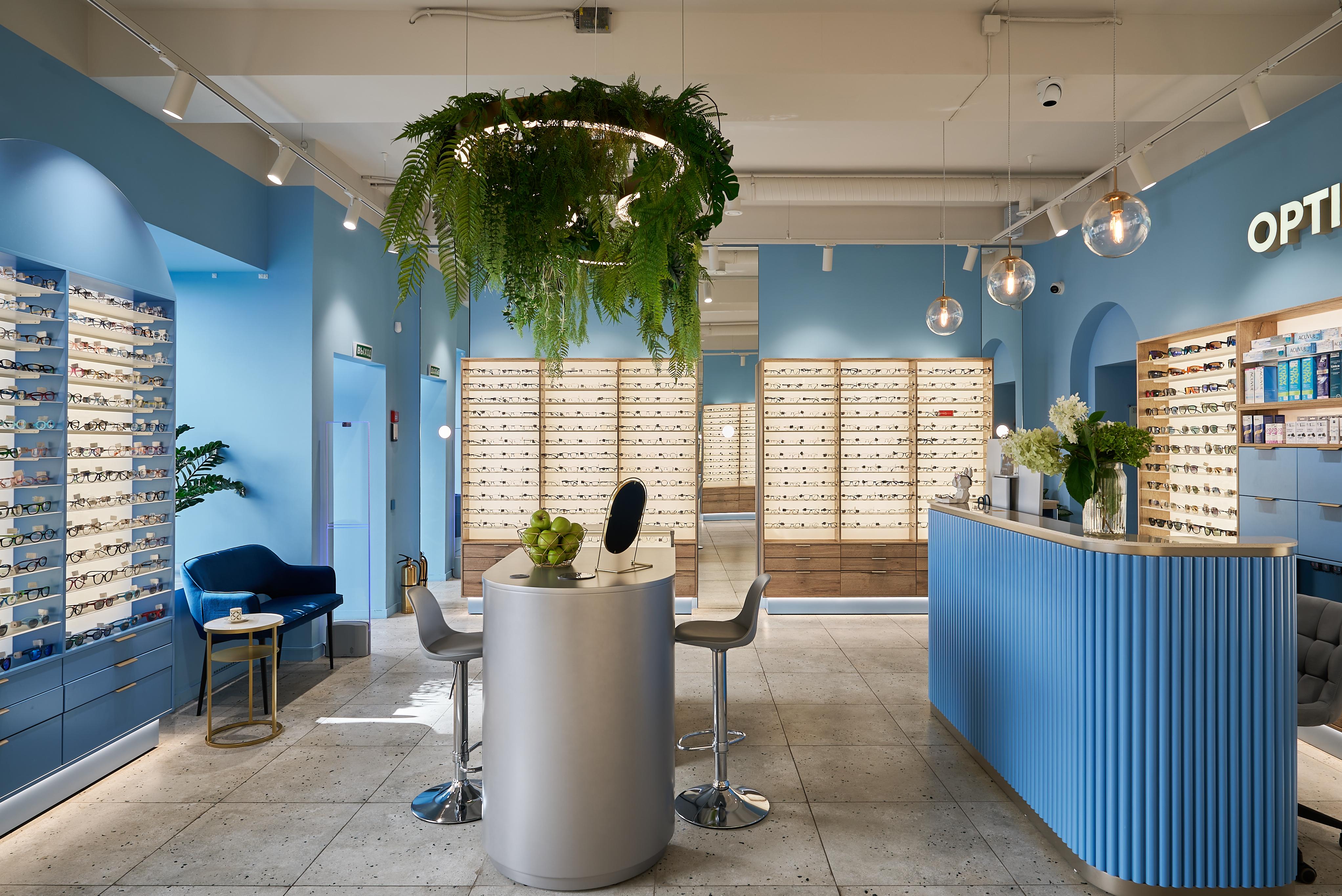 Новая оптика находится в историческом здании 1870 года. Лейтмотивом интерьера стал голубой цвет — это было главным пожеланием заказчиков. Голубые стены и мебель сочетаются с витринами из светлого дуба, украшенными латунными вставками, а оживляют пространство зеленые растения.