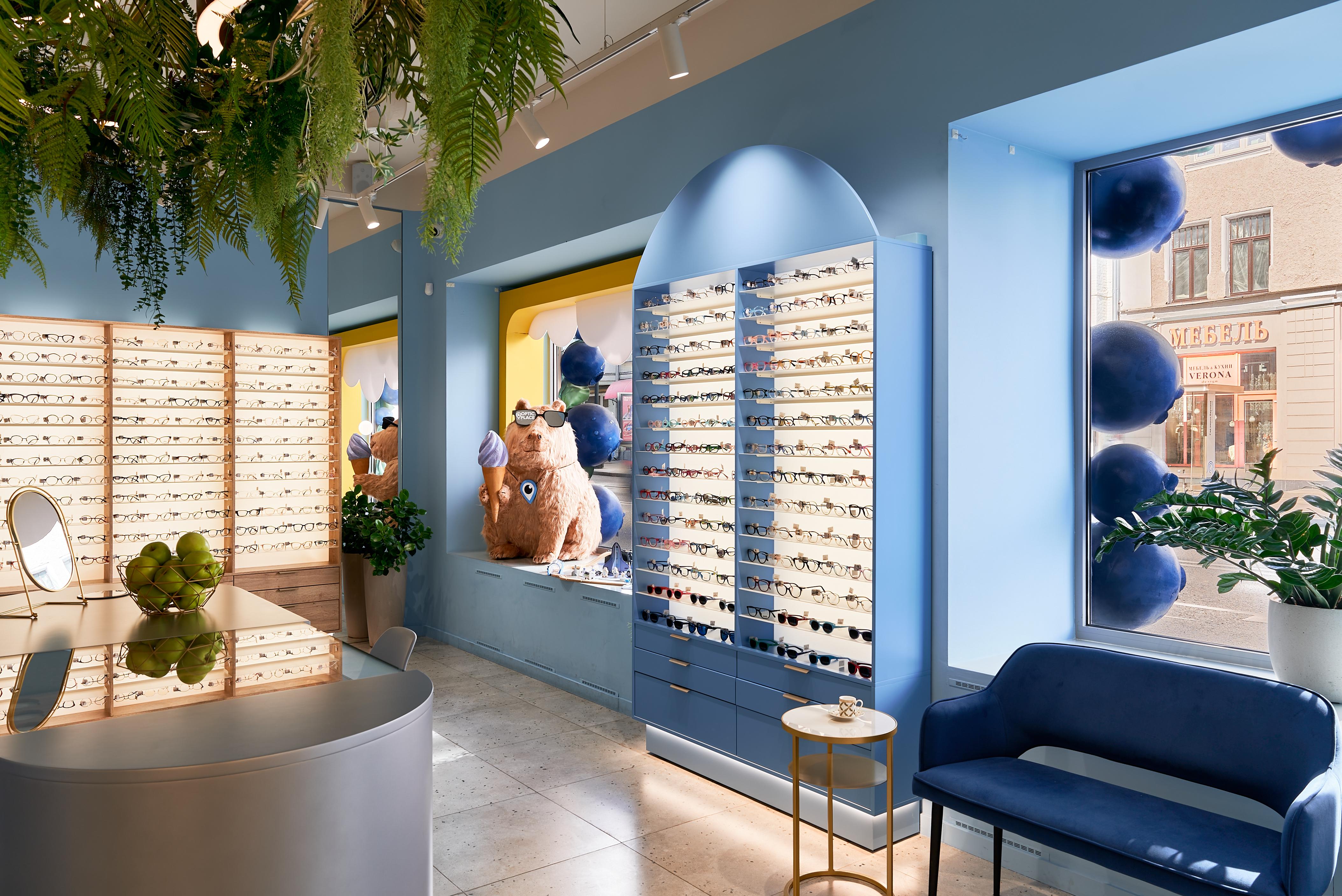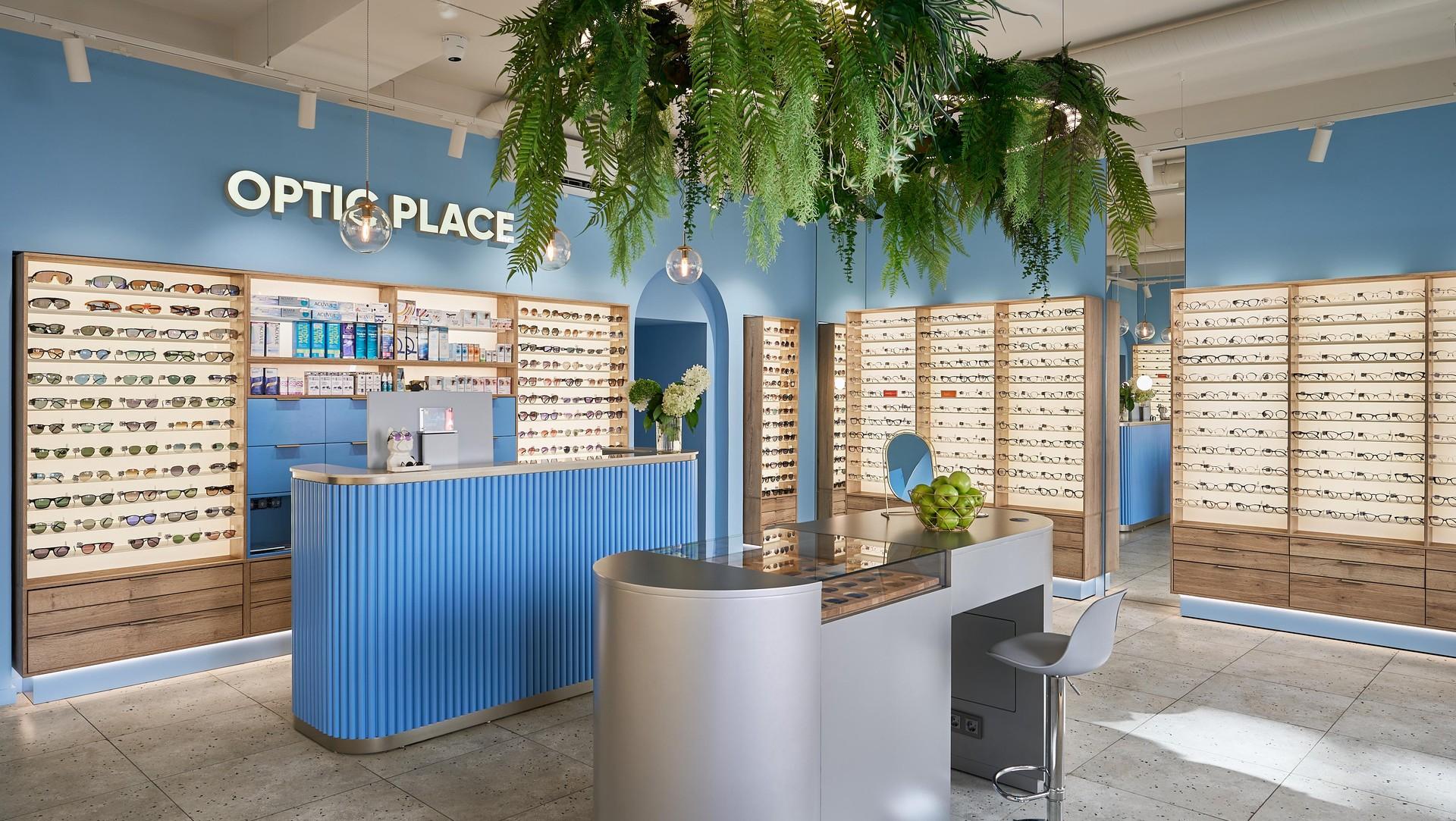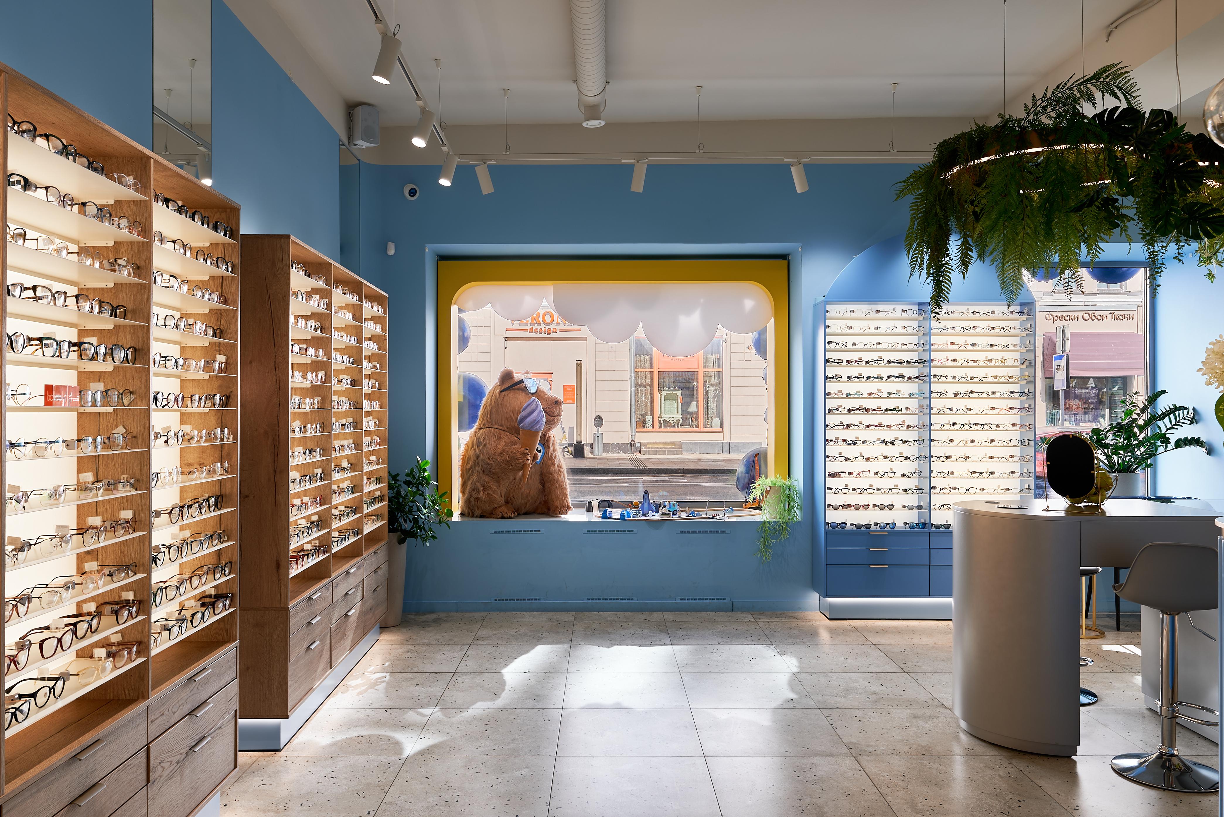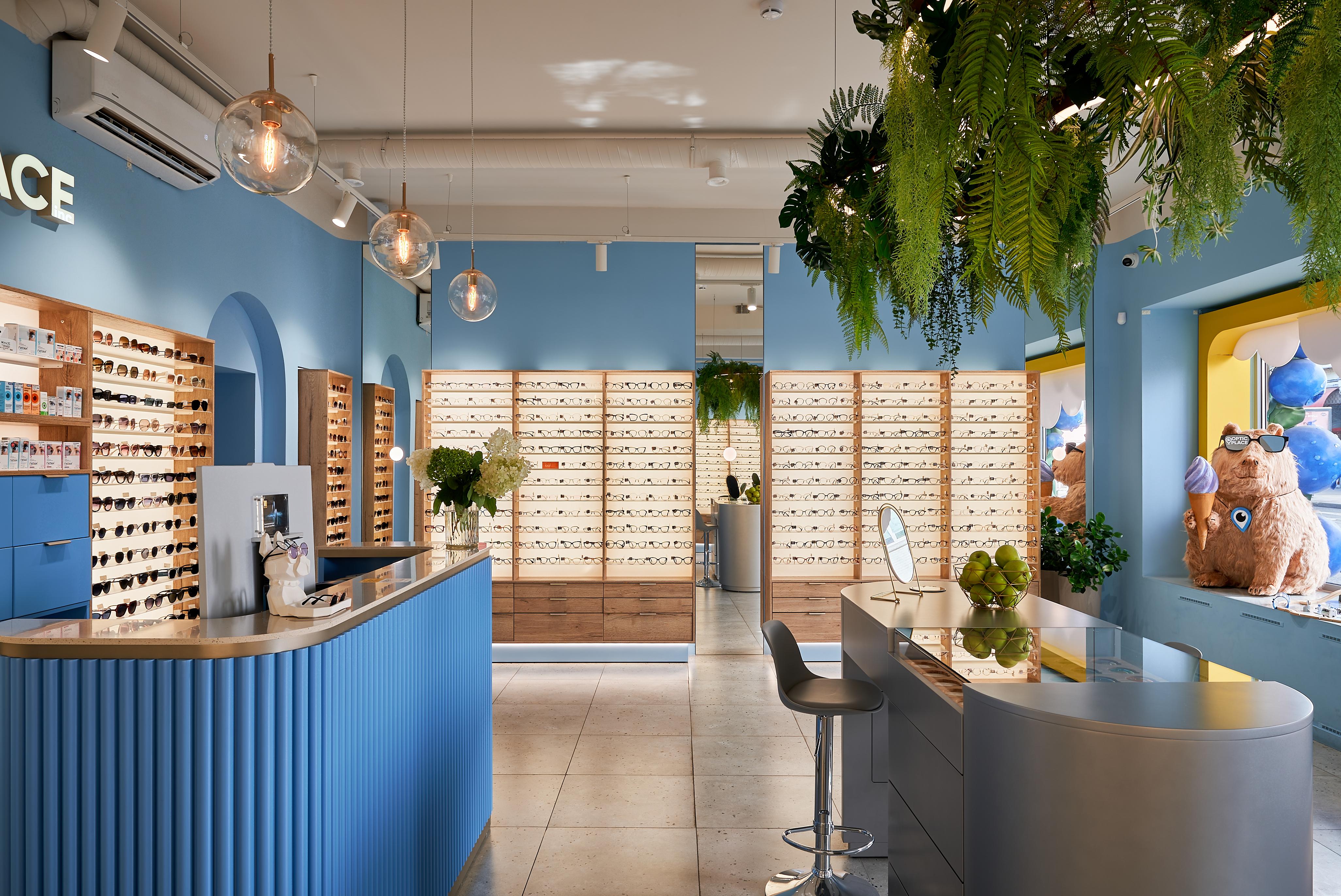 Новая оптика находится в историческом здании 1870 года. Лейтмотивом интерьера стал голубой цвет — это было главным пожеланием заказчиков. Голубые стены и мебель сочетаются с витринами из светлого дуба, украшенными латунными вставками, а оживляют пространство зеленые растения.
