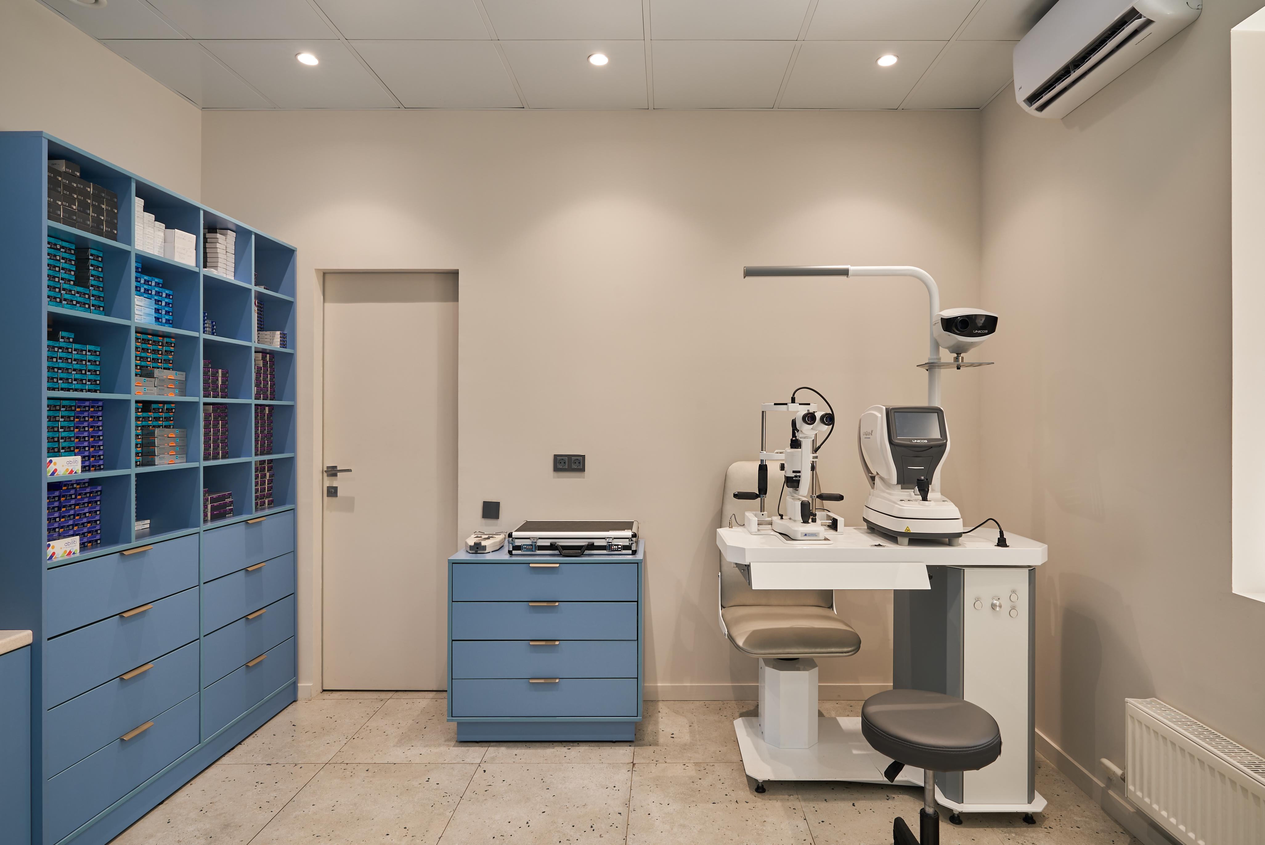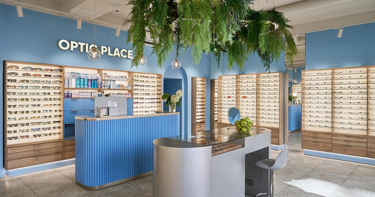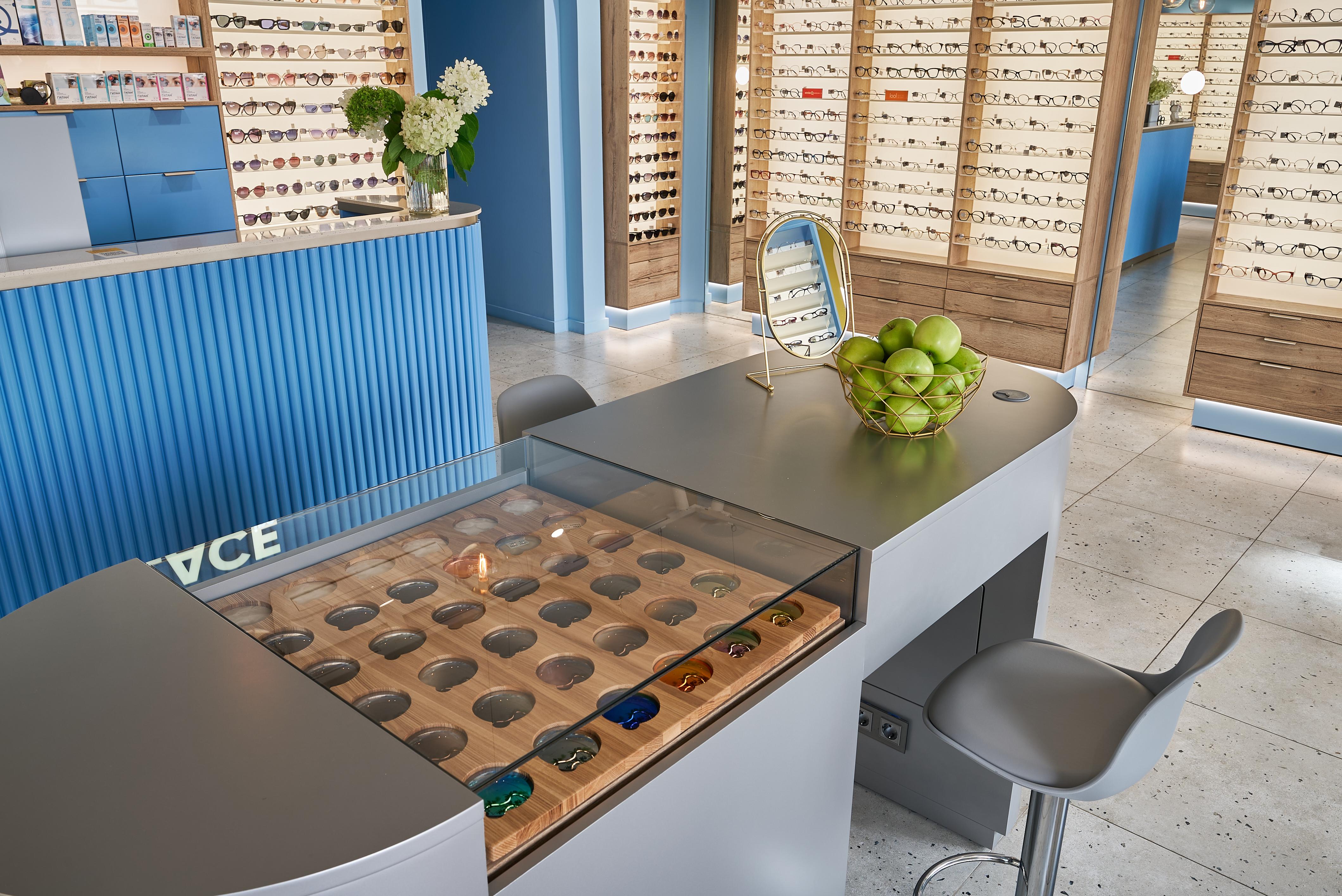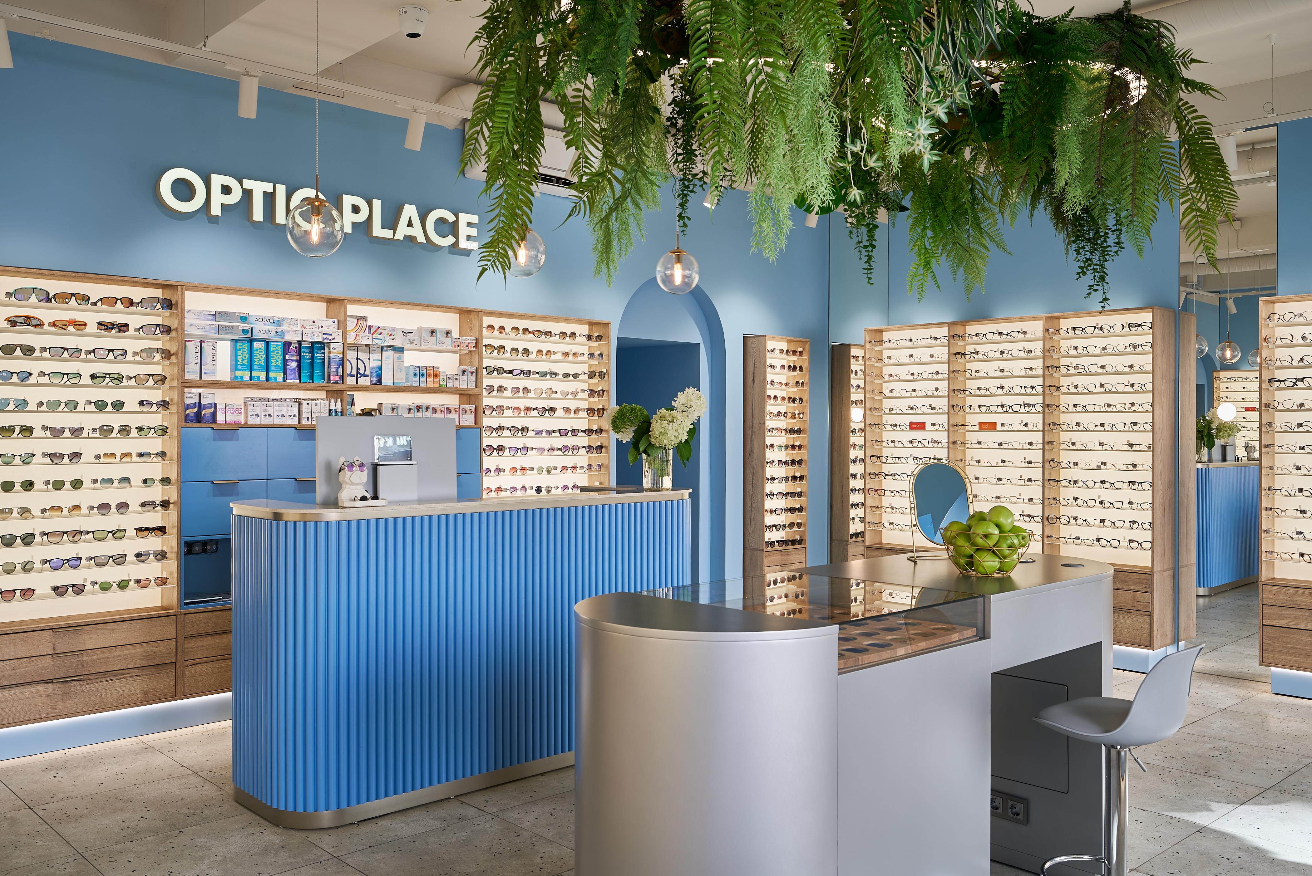 Новая оптика находится в историческом здании 1870 года. Лейтмотивом интерьера стал голубой цвет — это было главным пожеланием заказчиков. Голубые стены и мебель сочетаются с витринами из светлого дуба, украшенными латунными вставками, а оживляют пространство зеленые растения.