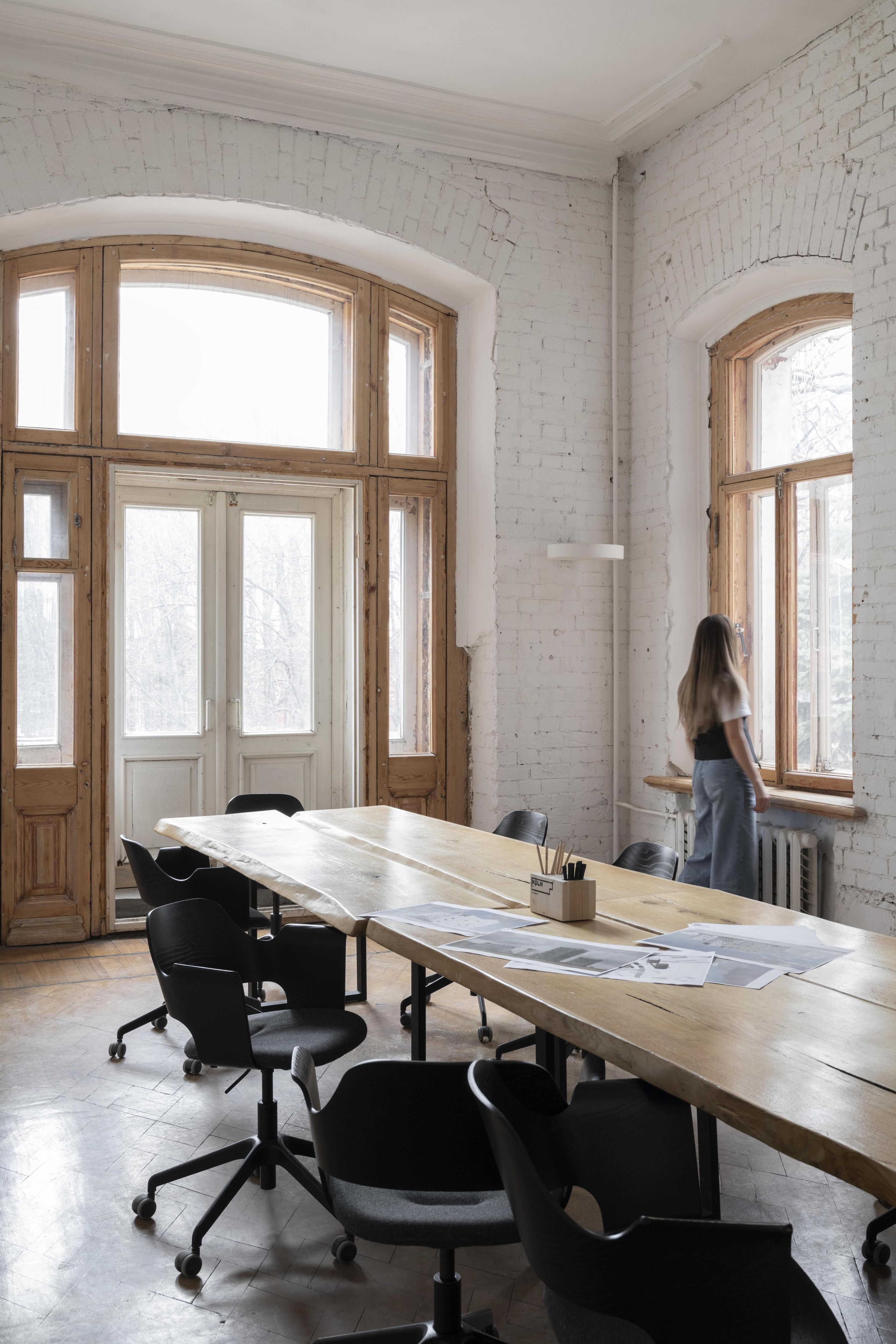 Исторический облик вернули широкой арке между помещениями, где работают архитекторы: раньше она была засыпана мусором и заставлена шкафами. Объем пространству первого этажа добавляет кольцевая планировка, зону второй архитектурной мастерской легко пройти по кругу. Множество прямоугольных окон с сохранившимися рамами подчеркивают историю здания.