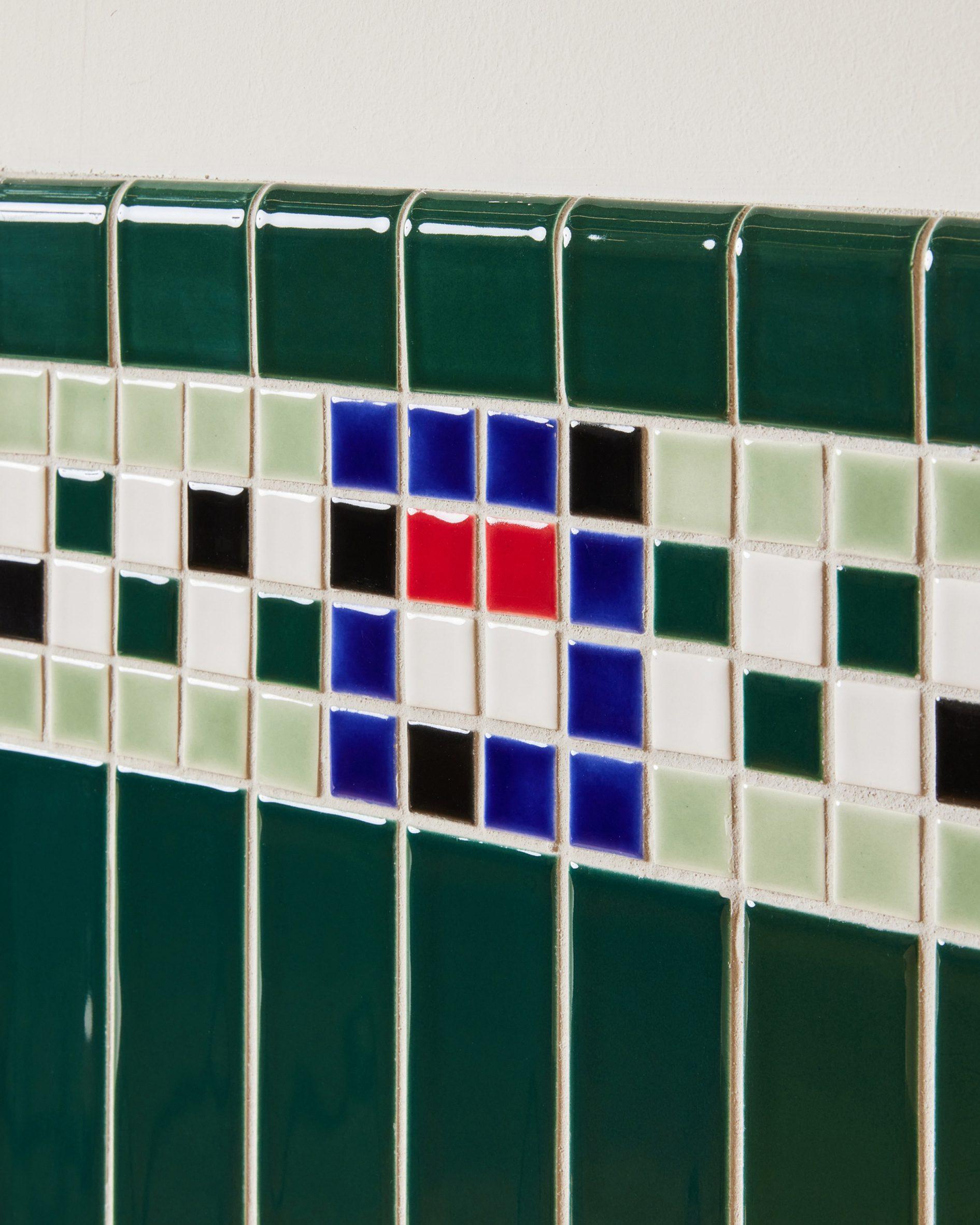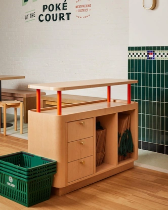 Пол в магазине выложили деревом и мозаичной плиткой — этот узор отсылает к баскетбольной площадке. Так здесь обыграли спортивную тему, которая присутствует в битвах покемонов, а также часть названия «сourt». Вдоль стен по всему торговому залу идут витрины, а нижнюю часть стен закрывает фартук из темно-зеленой плитки кабанчиком.