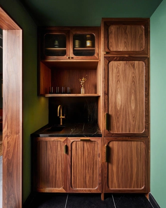 В задней части магазина обустроили лаунж-зону для персонала и VIP-гостей. Ее обшили темным орехом и покрыли стены известковой краской того же зеленого оттенка. Здесь дизайнеры добавили тонкие отсылки к Японии: светильник из васи-бумаги, латунную решетку на шкафу в форме сюрикена и обои с японским пейзажным принтом. Никаких прямых цитат, только намеки через материалы и текстуры.