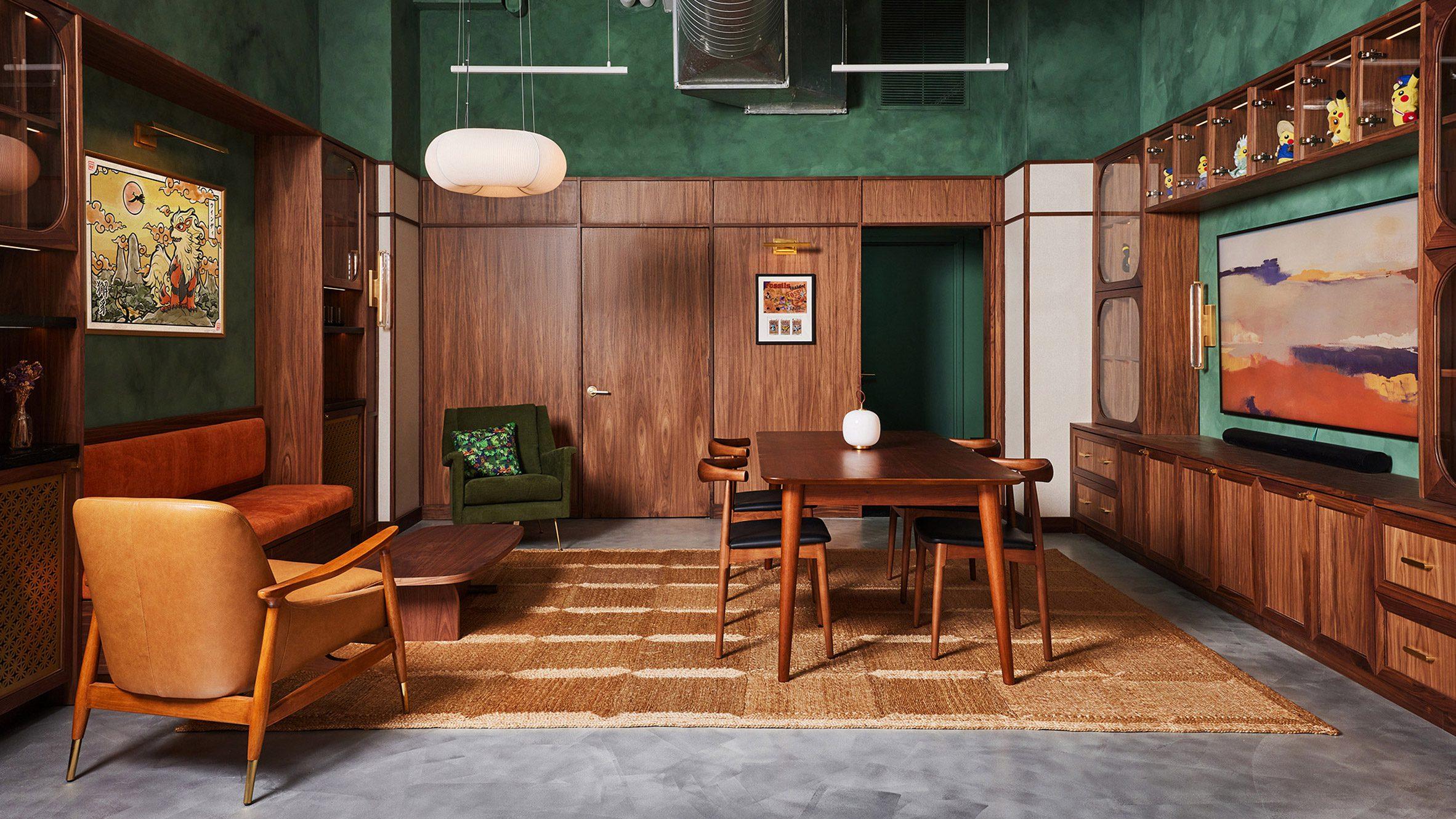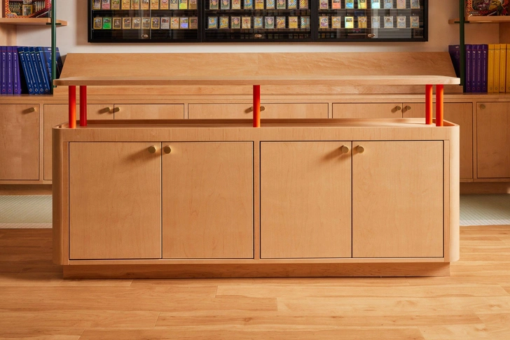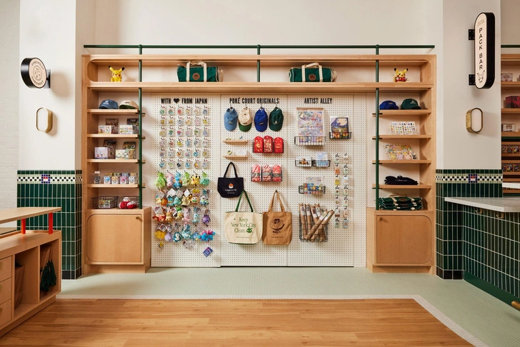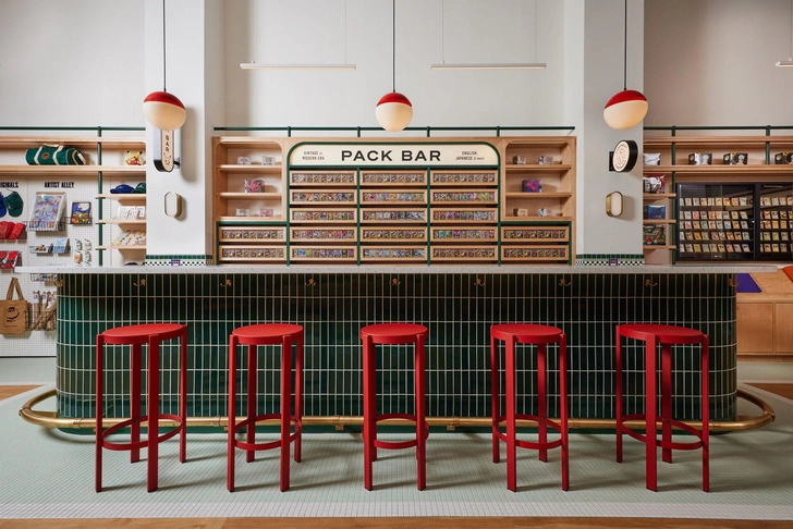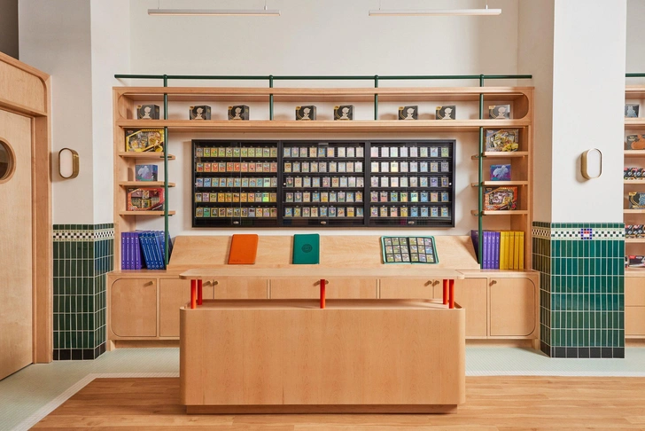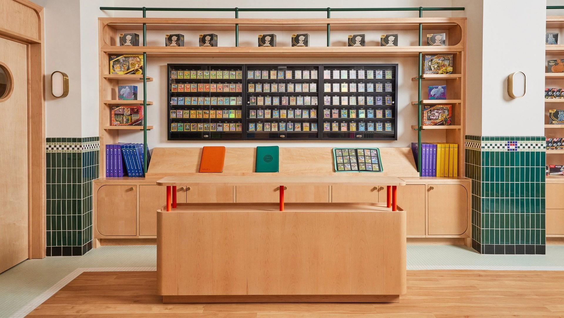 В основе интерьера — идея переосмыслить традиционный магазин коллекционных карточек. Первый Poké Court был небольшим арендованным офисом с темной палитрой и пластиковыми стеллажами.
