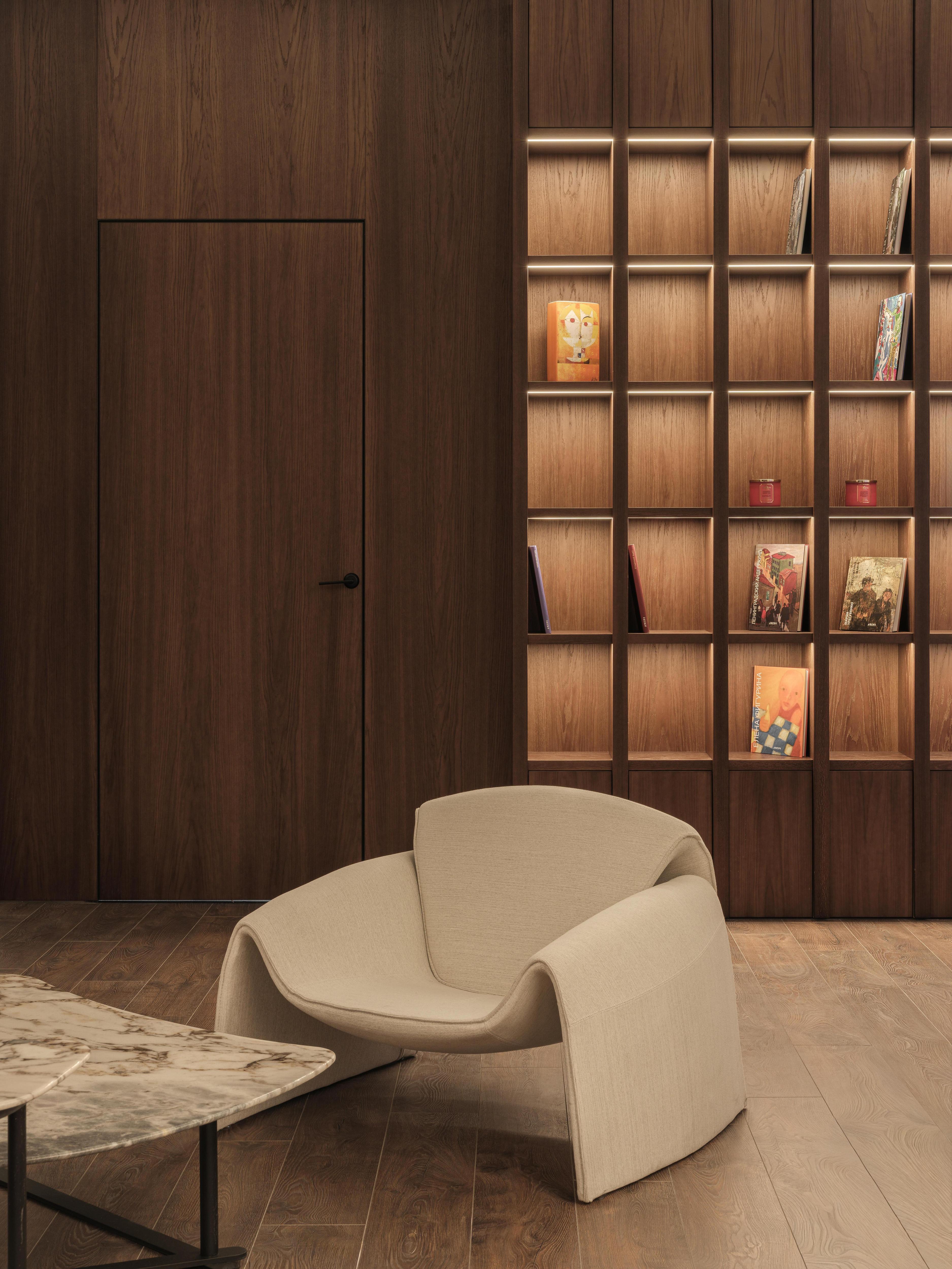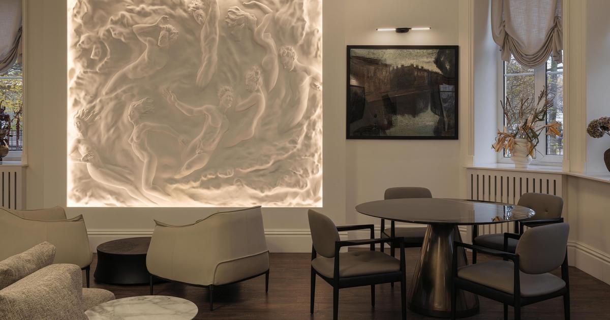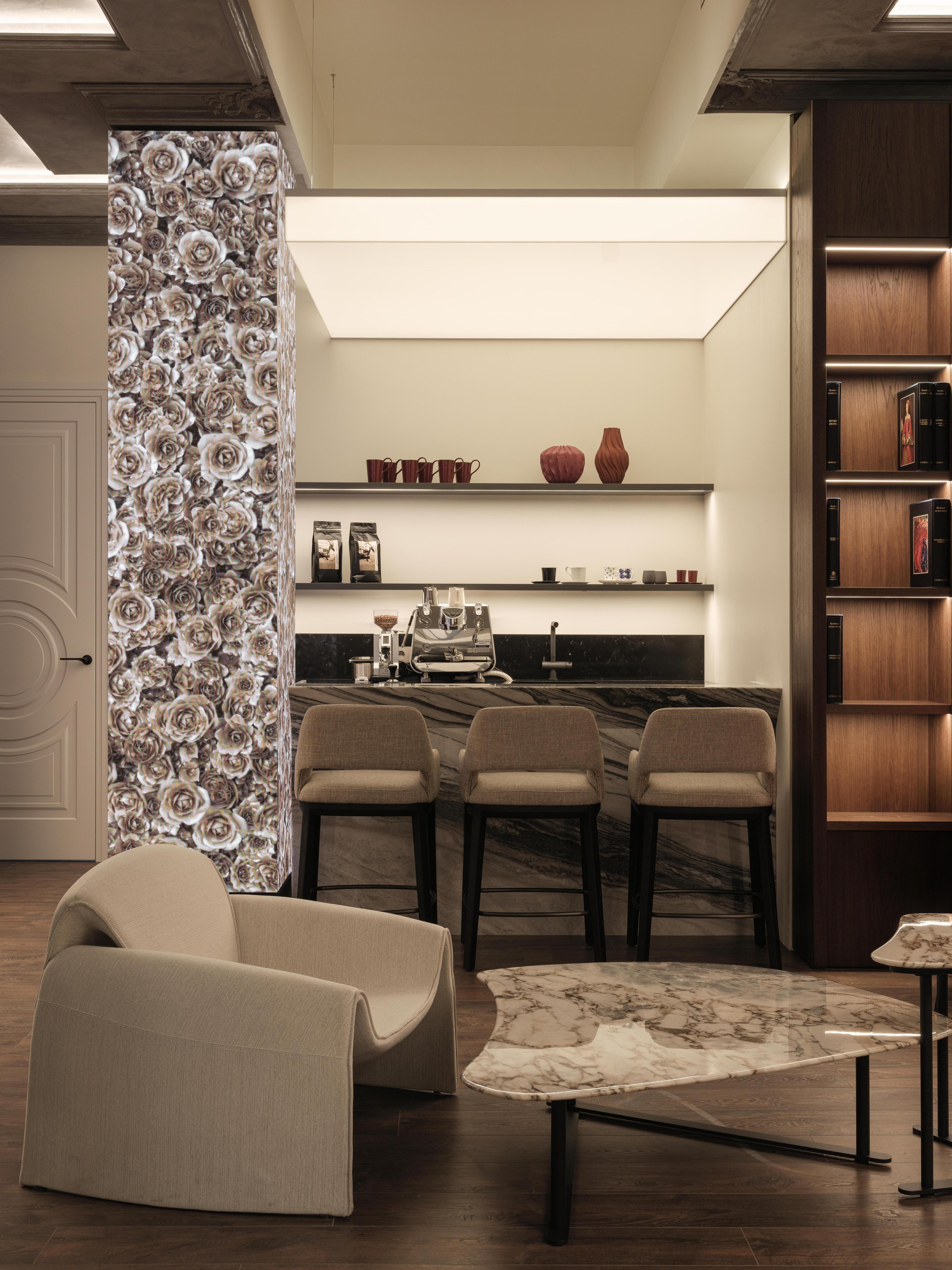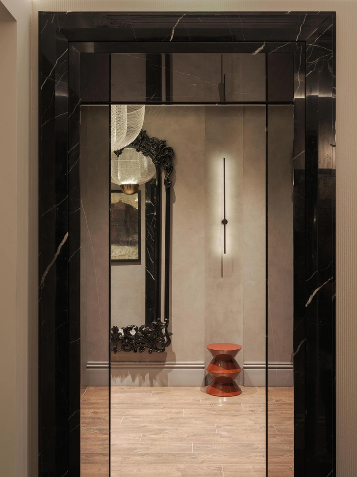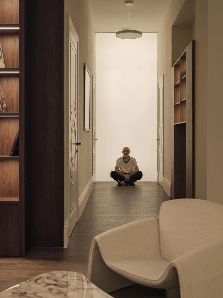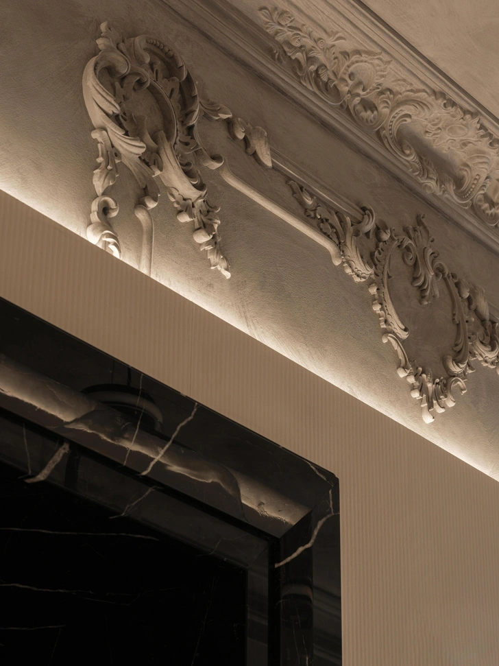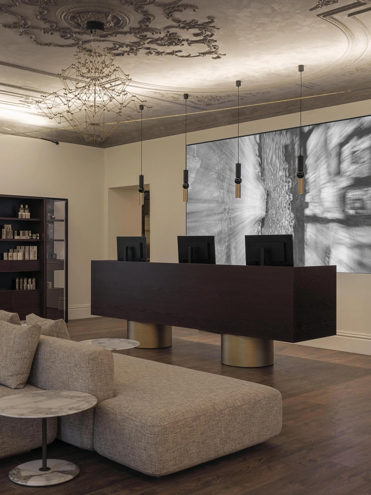Я использовал сочетание натурального камня, лепнины и дерева с лаконичными формами современной мебели, чтобы избежать стерильности и создать атмосферу дорогого особняка. В интерьере выделяются интегрированные интерактивные экраны с видео-артом, которые выполняют одновременно эстетическую и психологическую функцию.