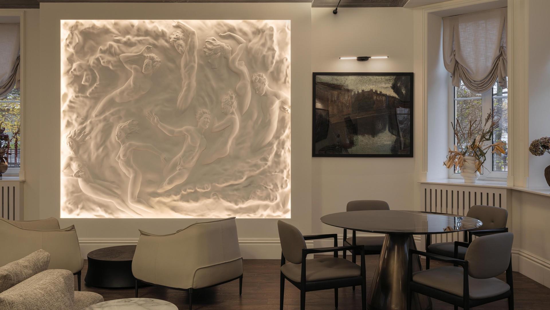 Лепнина на потолке, Orac Decor. Барельеф «Адвокат дьявола», DecoLine. Мебель выполнена по эскизам дизайнера, Golland Pro. Диван изготовлен по эскизам дизайнера.