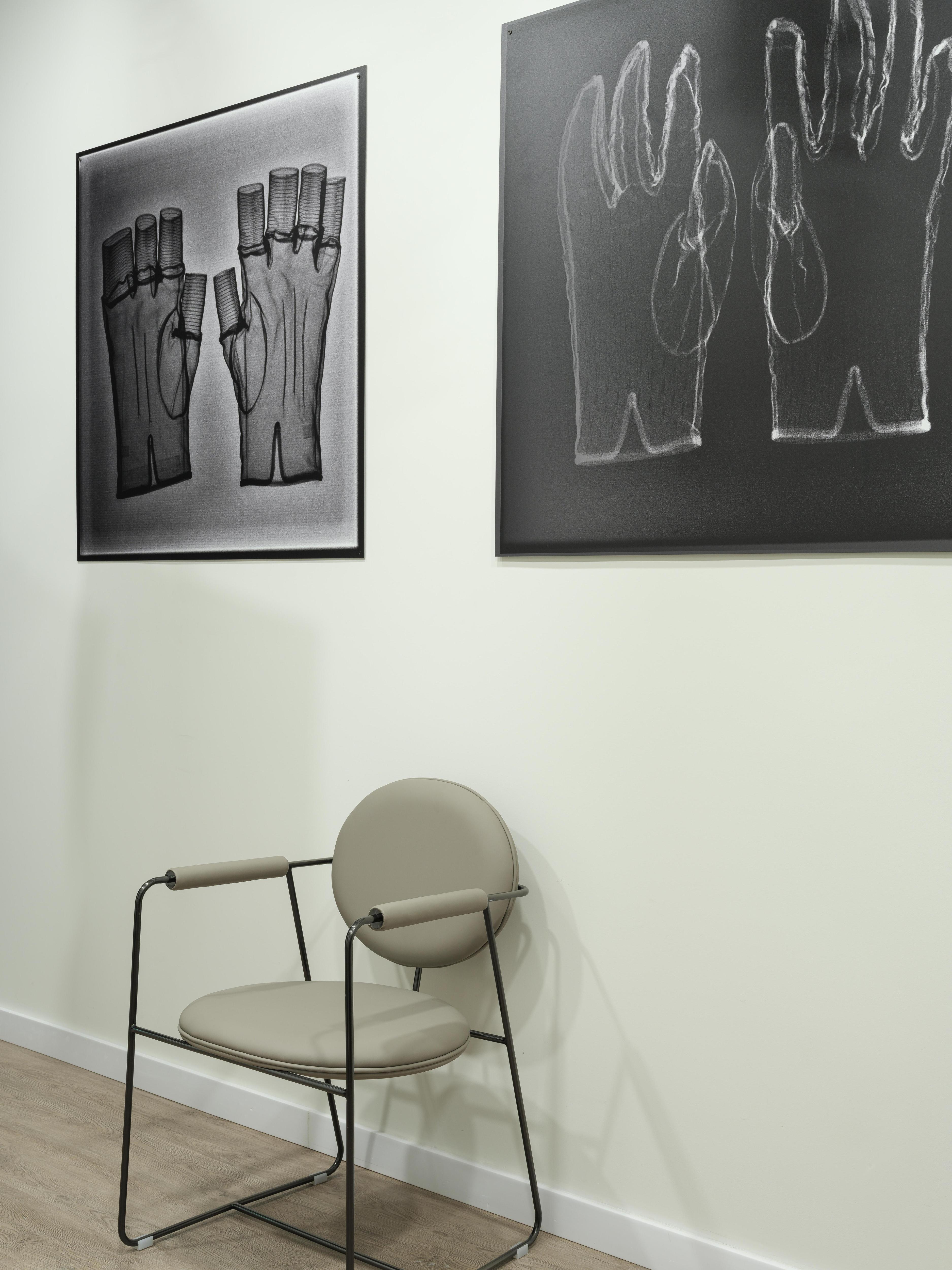Есть и действительно необычные детали: рентгеновские снимки в рабочих кабинетах украшают стены как искусство — например, снимки перчаток и свитера владельца клиники. Это отлично вписалось в строгий минимализм рабочих кабинетов, хороший пример баланса между творчеством и дисциплиной.