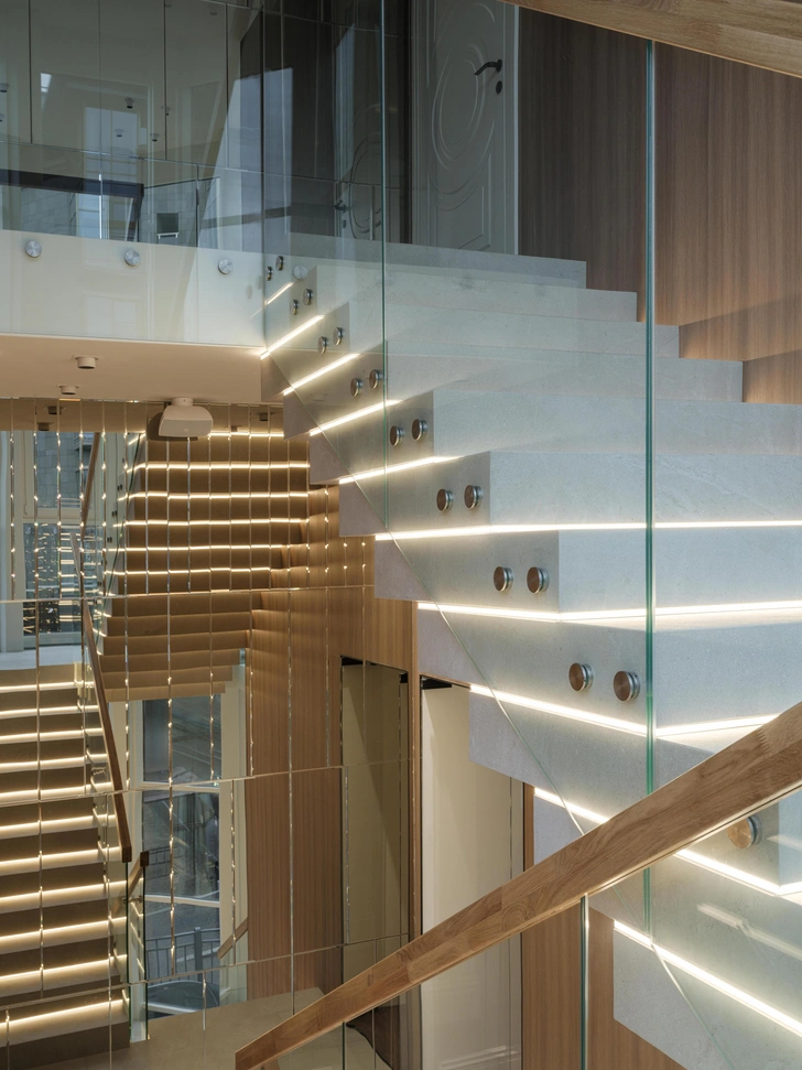 Небанальной получилась и лестница — она будто парит. Все благодаря стеклянным ограждениям и мягкой подсветке ступеней. Прием вроде бы простой, но выглядит все очень эффектно — у пространства появляется не только структура, но и уют. Мы рады, что у нас получилось сохранить изящество старого особняка и вписать в него элементы современного дизайна.
