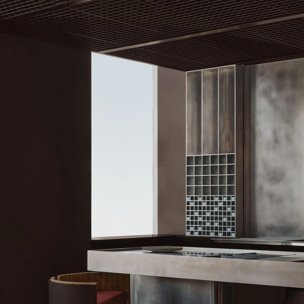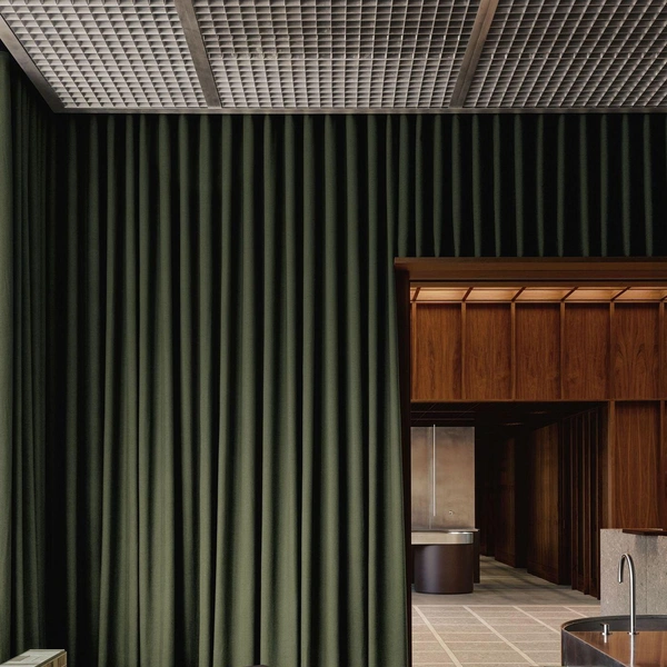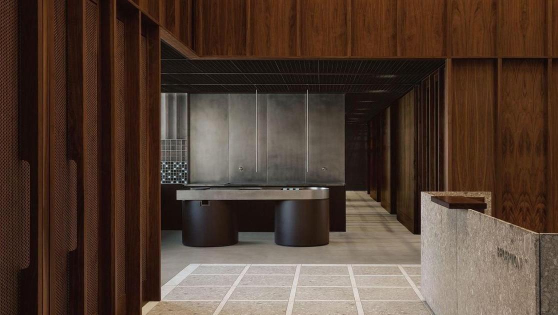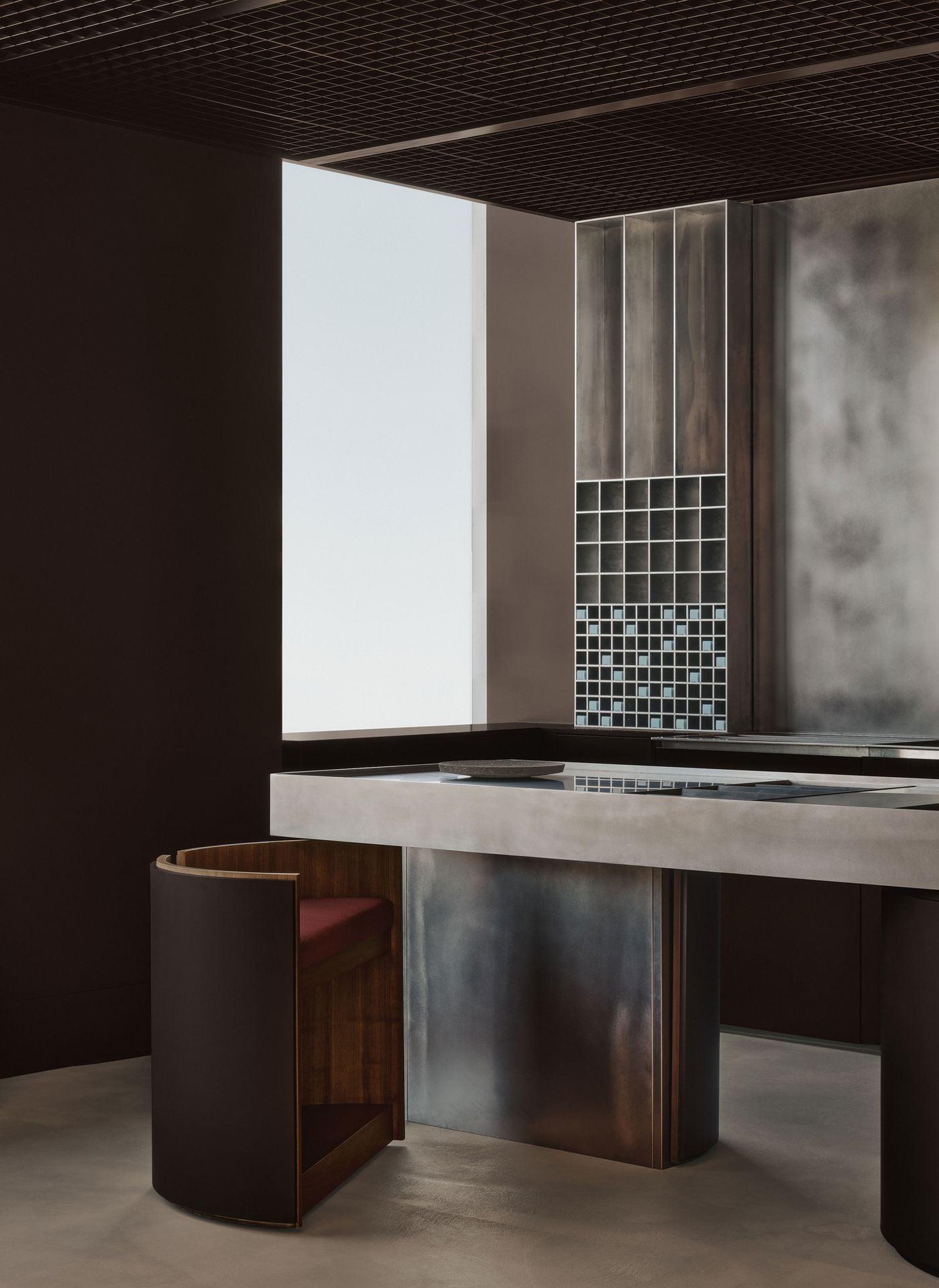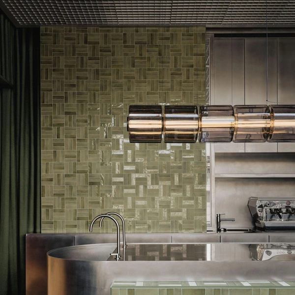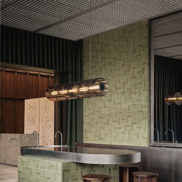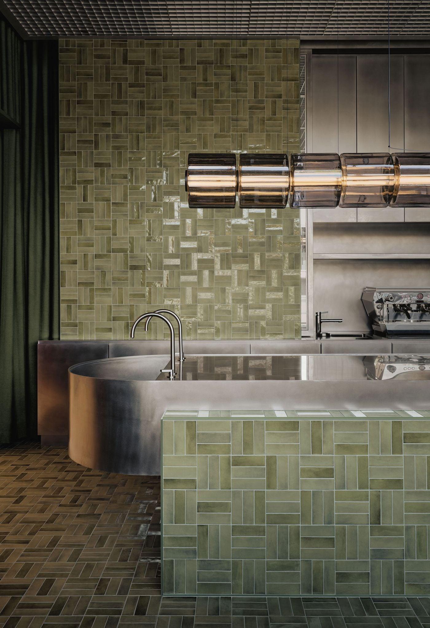 Матовые металлические поверхности и открытые «сетчатые» потолки в интерьере кафе и бутика привносят индустриальный оттенок. Круглые табуреты из орехового дерева и трубчатая лампа A-N-D смягчают геометрию зеленой плитки на полах и стенах, а темно-зеленые драпировки рассеивают дневной свет и придают пространству интимность.