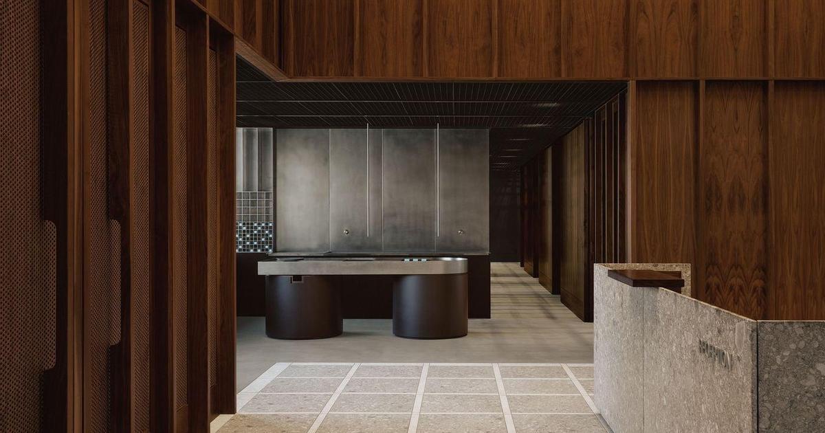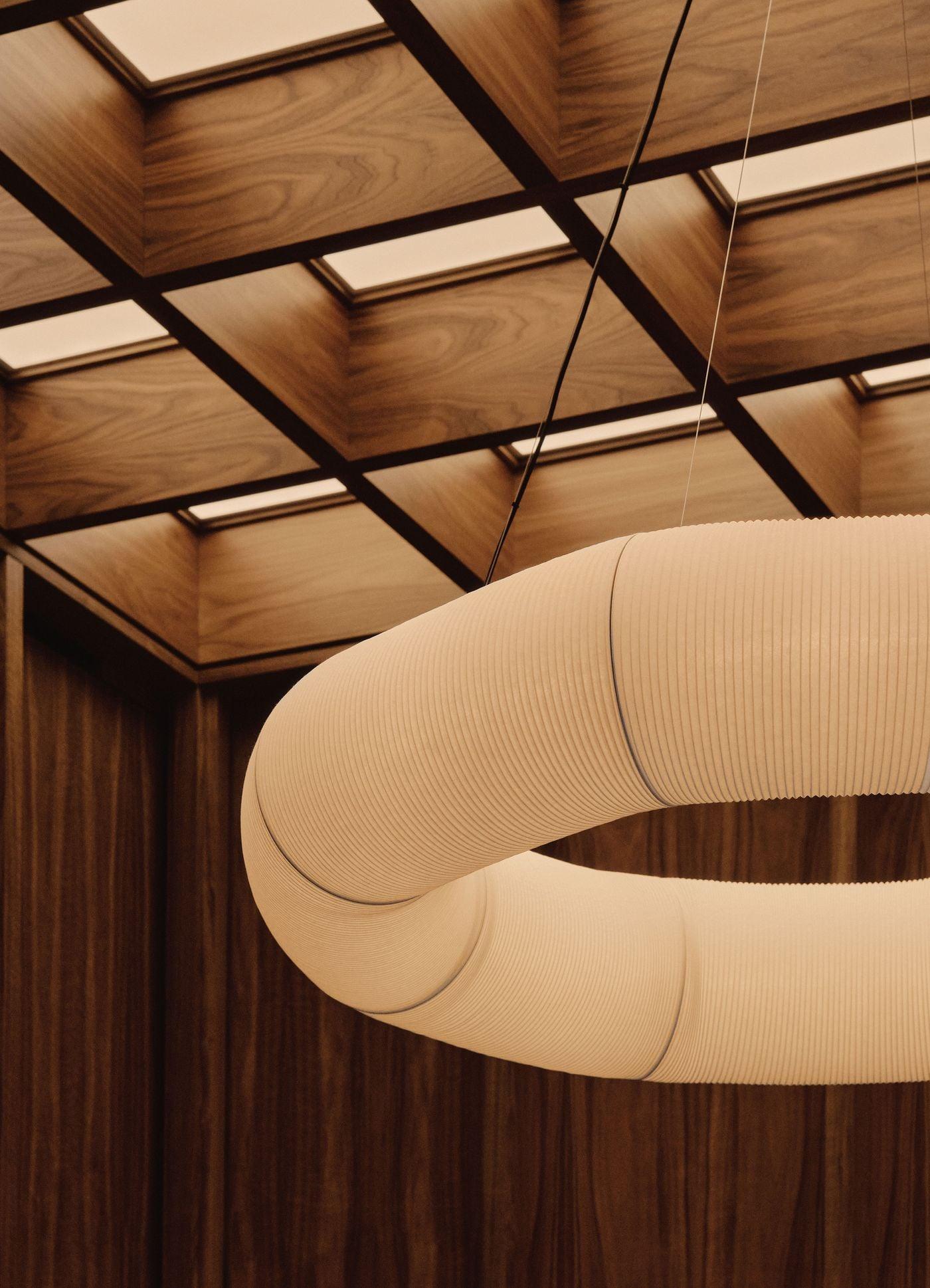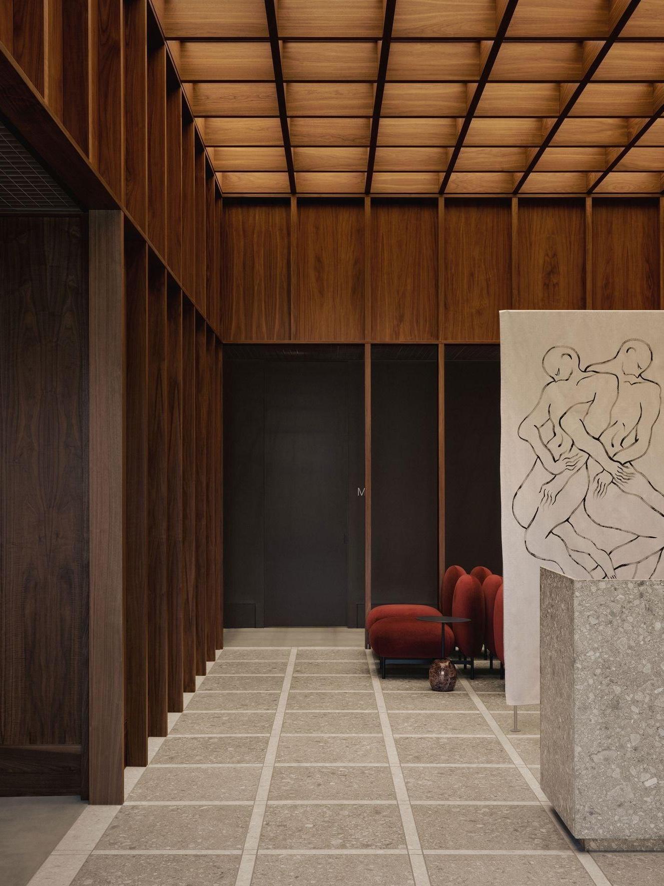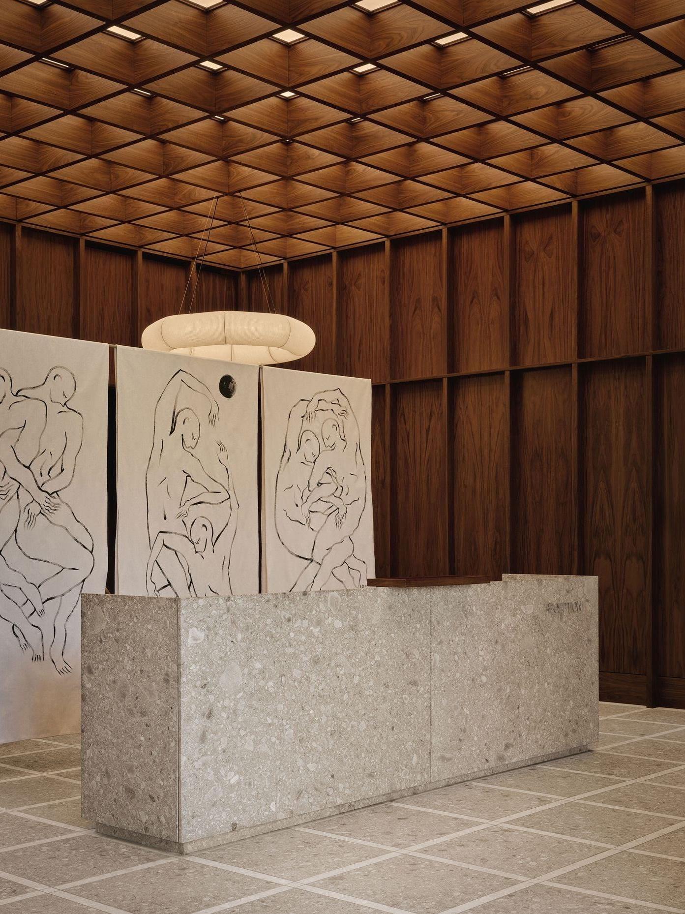 В зоне ресепшен диван Isole от Nichetto Studio с обивкой темно-малинового цвета, а также подвесная лампа Santa & Cole's Tekiò в форме пончика компенсируют геометрию кессонного потолка, стеновых панелей и каменных вставок пола.