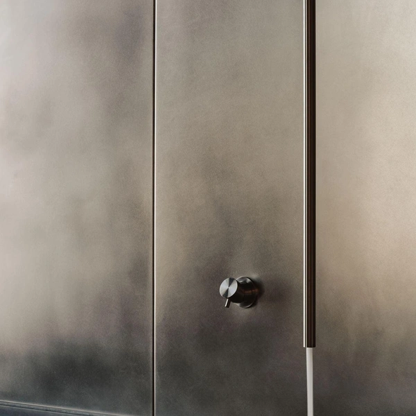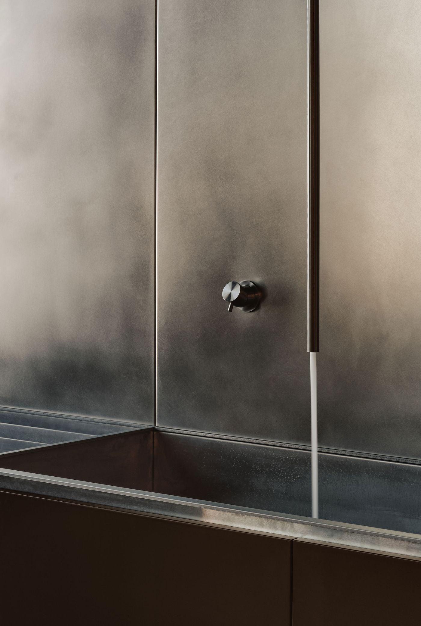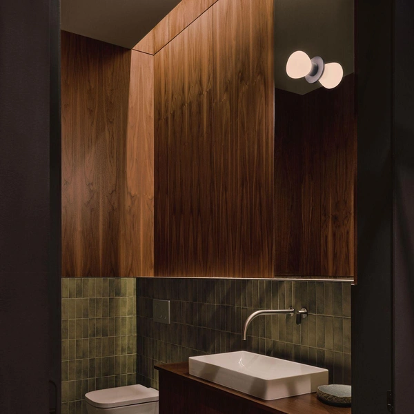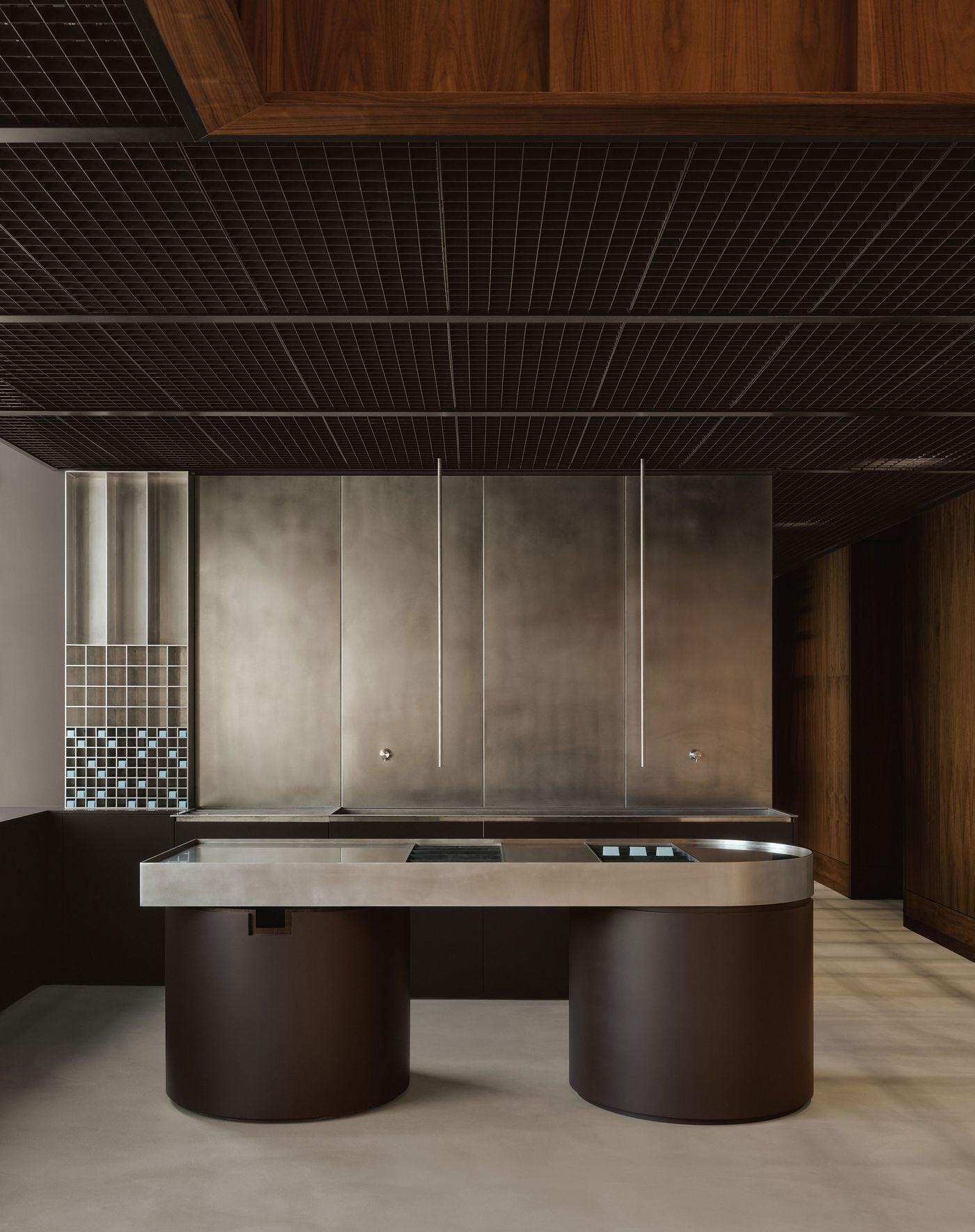 Архитекторы Atelier Carle использовали сдержанные контрастные текстуры и силуэты: орех и керамическая плитка смягчают прохладу матового металла и цемента.