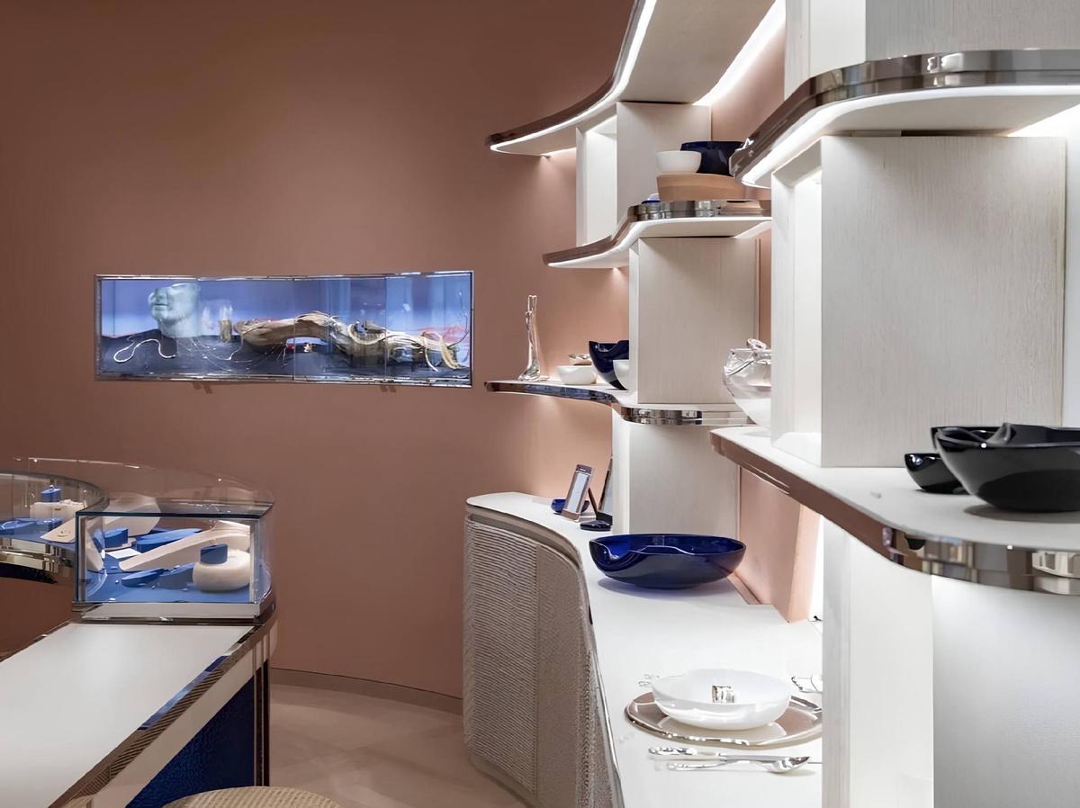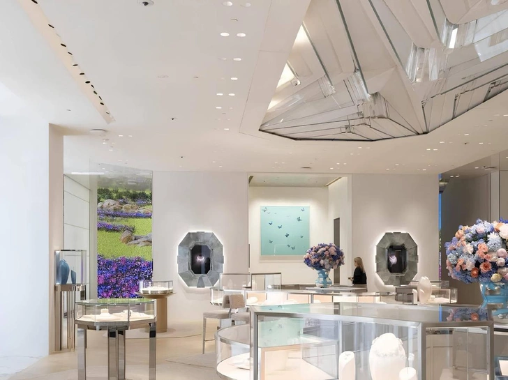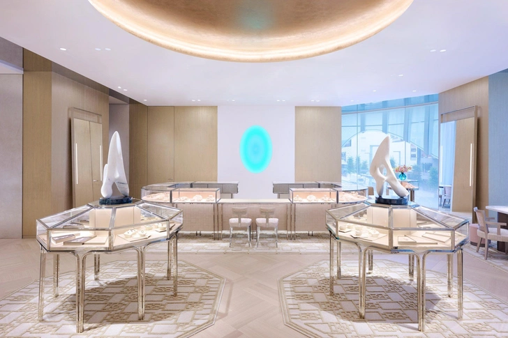 Витрины с ювелирными изделиями подсвечены так, чтобы их сияние не искажалось голубым оттенком фасада — для этого на стекла был нанесен специальный керамический принт.