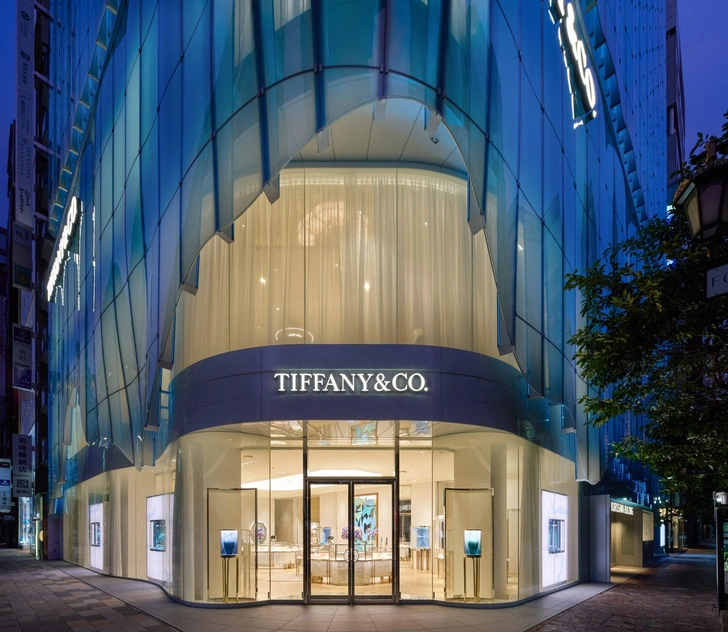 13-этажное здание, большую часть которого занимает бутик легендарного ювелирного дома Tiffany & Co, впечатляет своим фасадом. Японская студия Jun Aoki & Associates использовала более 2000 панелей из трехмерного гнутого стекла, окрашенного в знаменитый оттенок Tiffany Blue.