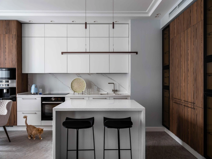 «Хозяева этой квартиры, молодая пара с ребенком, ведут активный образ жизни. Возвращаясь домой, они хотят расслабиться и настроиться на новый рабочий день, поэтому мы сразу отказались от ярких цветов, сделав выбор в пользу пастельной гаммы. А частые поездки заказчиков в Европу и увлечение горными лыжами определили основные предпочтения по фактурам. Кроме того, у семьи есть два питомца: рыжий общительный кот и британская вислоухая кошка. Для них в гостиной мы предусмотрели отдельный дом, заложили розетку для поилки и продумали гостевой санузел», — рассказывают дизайнеры.