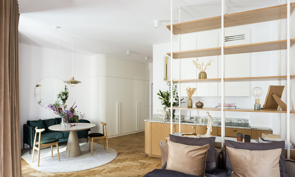 Площадь квартиры всего 34 квадратных метров, поэтому внутри было решено обойтись без дополнительных стен. Помещение представляет собой студию открытой планировки, зонированную с помощью мебели. Вдохновленные полукруглыми фасадами здания, дизайнеры продолжили этот мотив и внутри, использовав мебель округлых форм без острых углов.