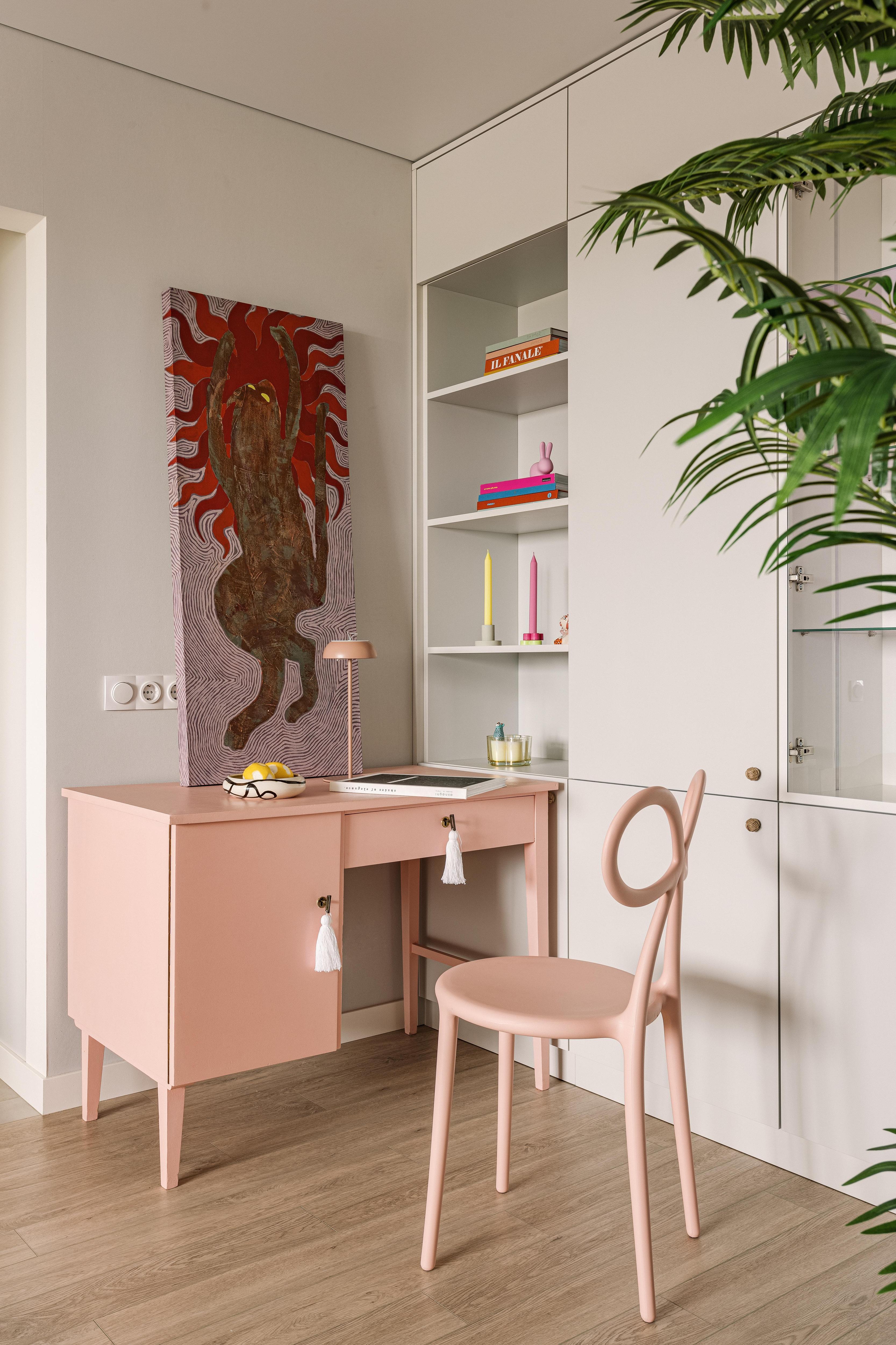 В интерьере много интересной мебели. Какие-то предметы достались хозяйке в наследство, к примеру, тумба в гостиной, а какие-то я нашла для нее у продавцов винтажных вещей, среди них был письменный стол производства ГДР. Все было в хорошем состоянии, но нам захотелось добавить цвета. Я своими руками перекрасила мебель в нужные оттенки. Обстановку дополняет винтажное кресло Orbit от итальянского производителя Sintesi и светильник 80-х годов из муранского стекла с черной спиралью.
