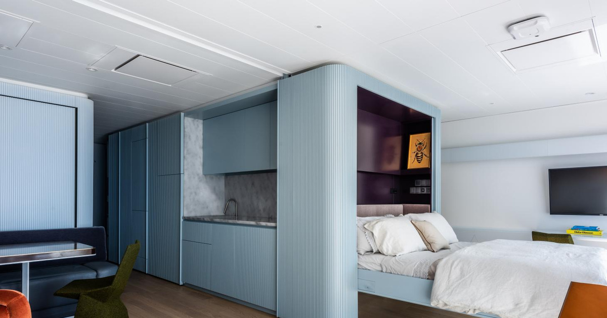 Эта сверхкомпактная квартира, принадлежащая паре заядлых путешественников, расположена на борту огромного лайнера. Оформляя интерьер, архитектор Майкл К. Чен (Michael K. Chen) черпал вдохновение в облике круизных судов середины XX века. Кроме того, в дизайне прослеживается любовь автора к ремеслу, новым технологиям и эксклюзивным предметам.