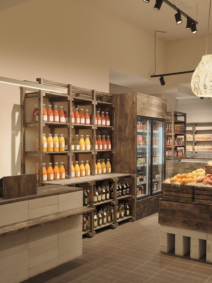 «Планировка разрабатывалась совместно с консультантом по ритейлу. Все пространство мы разделили на две части, а в центре спроектировали остров для овощей и фруктов. Над ним расположились войлочные абажуры с засушенными ветками растений, выполненные художницей Миланой Халиловой. Они по-особенному рассеивают свет, создавая ощущение тепла и уюта».