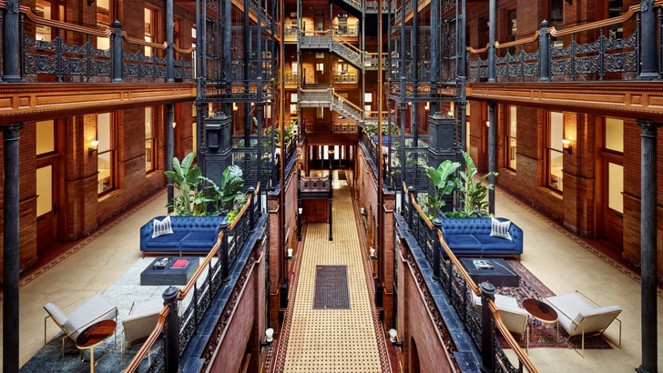 The Bradbury Building — одна из достопримечательностей Лос-Анджелеса, памятник архитектуры. Здание было построено в 1893 году для магната золотодобывающей промышленности Льюиса Б. Брэдбери по проекту архитектора Самнера Ханта (Sumner Hunt) и чертежам Джорджа Уаймана (George Wyman). Оно представляет собой монументальную постройку в романском стиле с фасадами из красного кирпича, за которыми скрывается один из самых потрясающих интерьеров Лос-Анджелеса — атриум с чугунными лестницами, шахтами лифта и балюстрадами, с полами из итальянского мрамора и плитки и декоративной отделкой из дуба, розовых и желтых кирпичей, мексиканской плитки и терракоты — и все это венчает стеклянный потолок!
