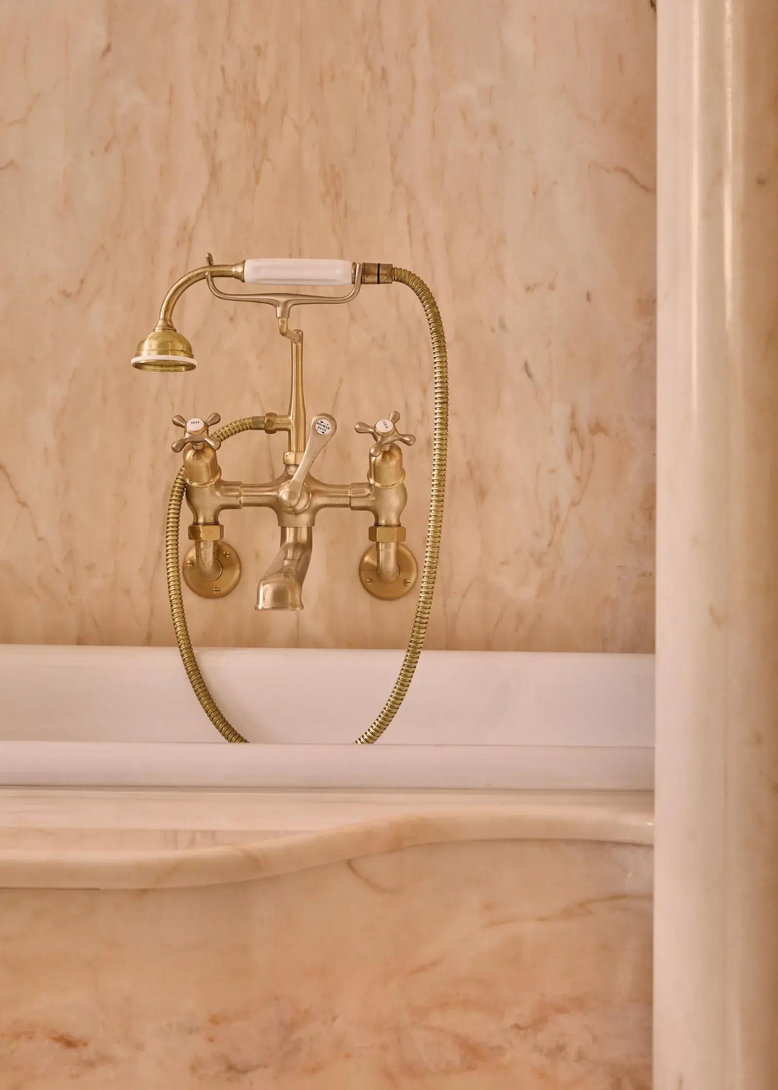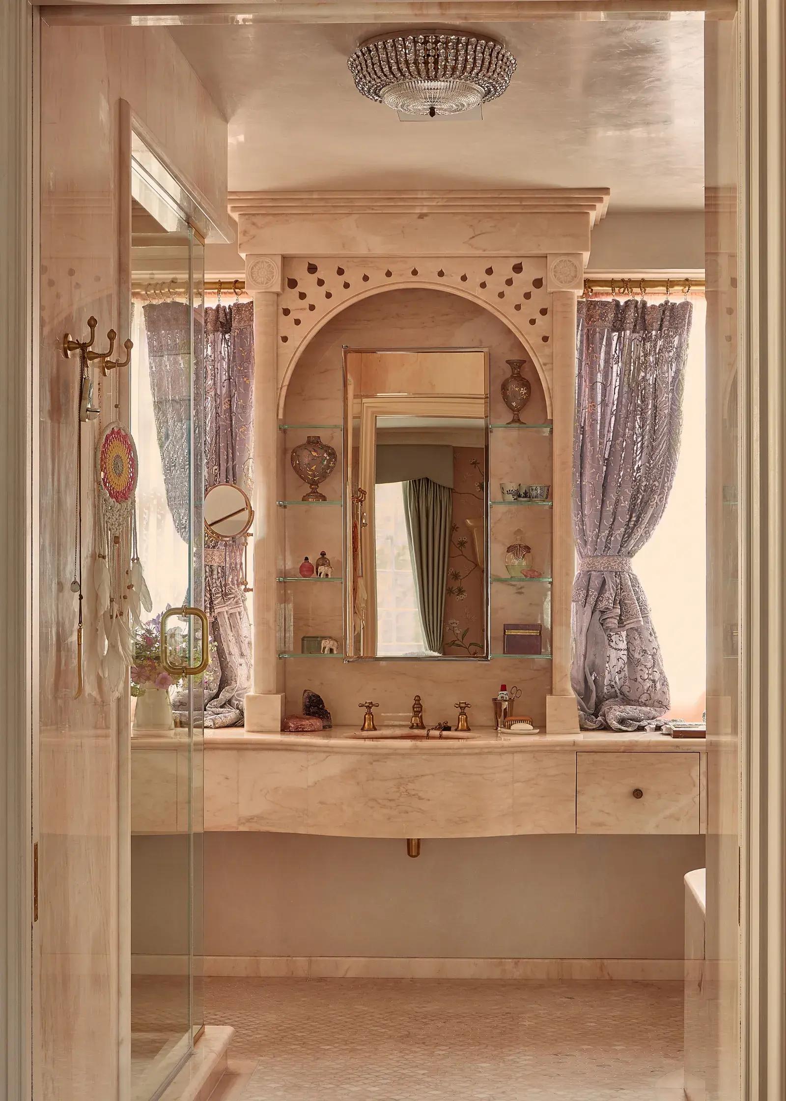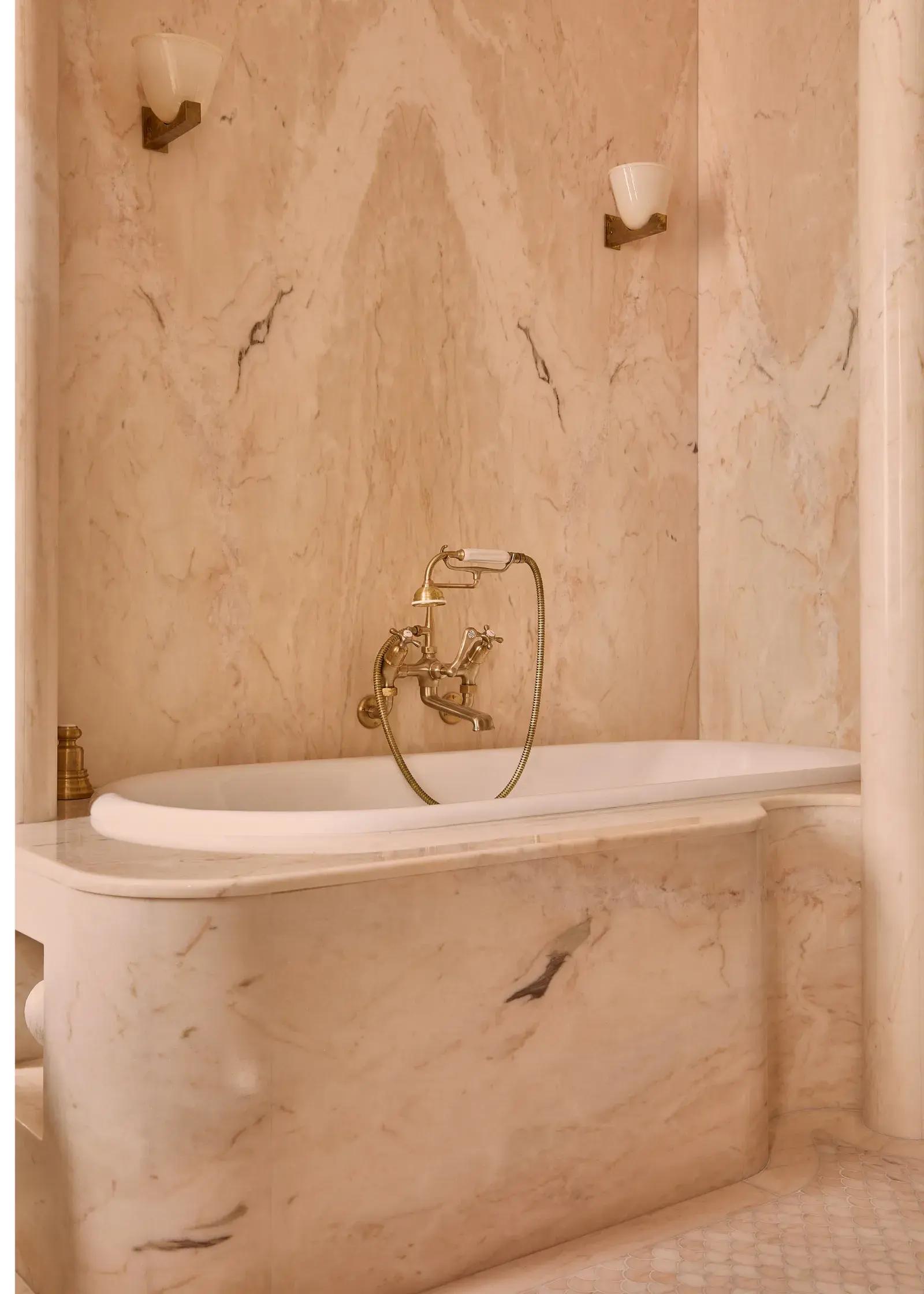 Комната полностью облицована нежно-розовым португальским мрамором Rosa с едва заметными прожилками. Главное в таких случаях — не «утяжелить» небольшое пространство, поэтому несмотря на выбор практически монохромной отделки, Кейт и Кэти решили разнообразить интерьер текстурами, придав немного динамики, легкого ритма. Так, пол украшает зубчатая плитка из того же мрамора. «Кейт давно хотела розовую ванную комнату. Мы сузили круг вариантов до трех оттенков и выбрали самый светлый» — рассказала дизайнер. Такой оттенок, действительно, смотрится довольно нейтрально и одновременно индивидуально, не напоминая при этом барби-кор.