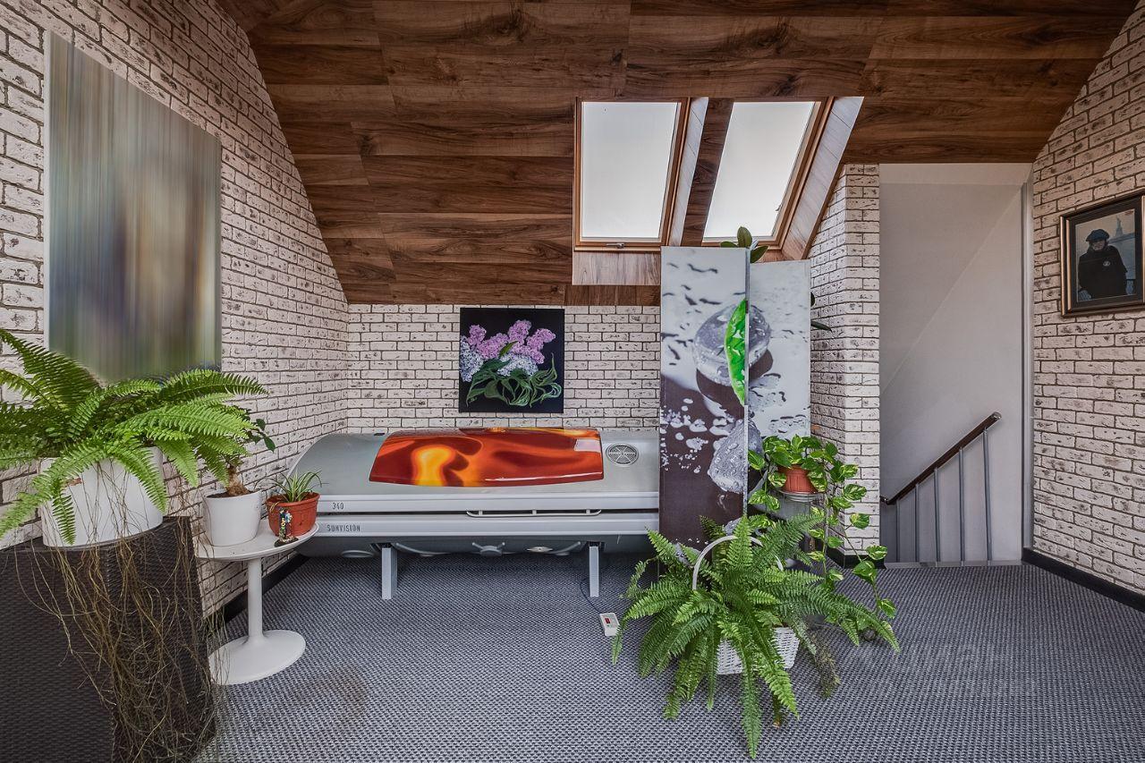 В двухэтажном особняке, помимо просторной кухни, стандартных гостиной с камином и роялем, кабинета-мастерской, двух детских и трех ванных комнат есть и множество сюрпризов. Например, солярий!