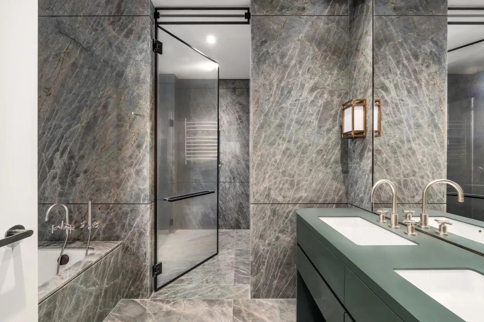 К главной спальне примыкает просторная гардеробная и ванная комната, стены которой отделаны бразильским кварцитом Acqua. Там установлена двойная раковина, душевая кабина со стеклянным ограждением, ванна и полы с подогревом. Вторая спальня также имеет собственную ванную, отделанную камнем, в стиле спа-салона.