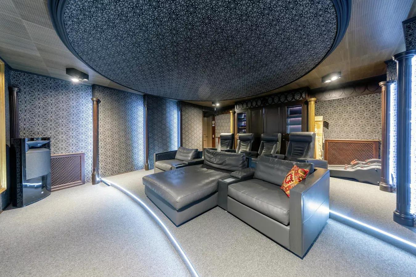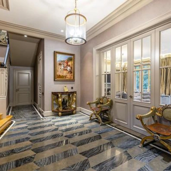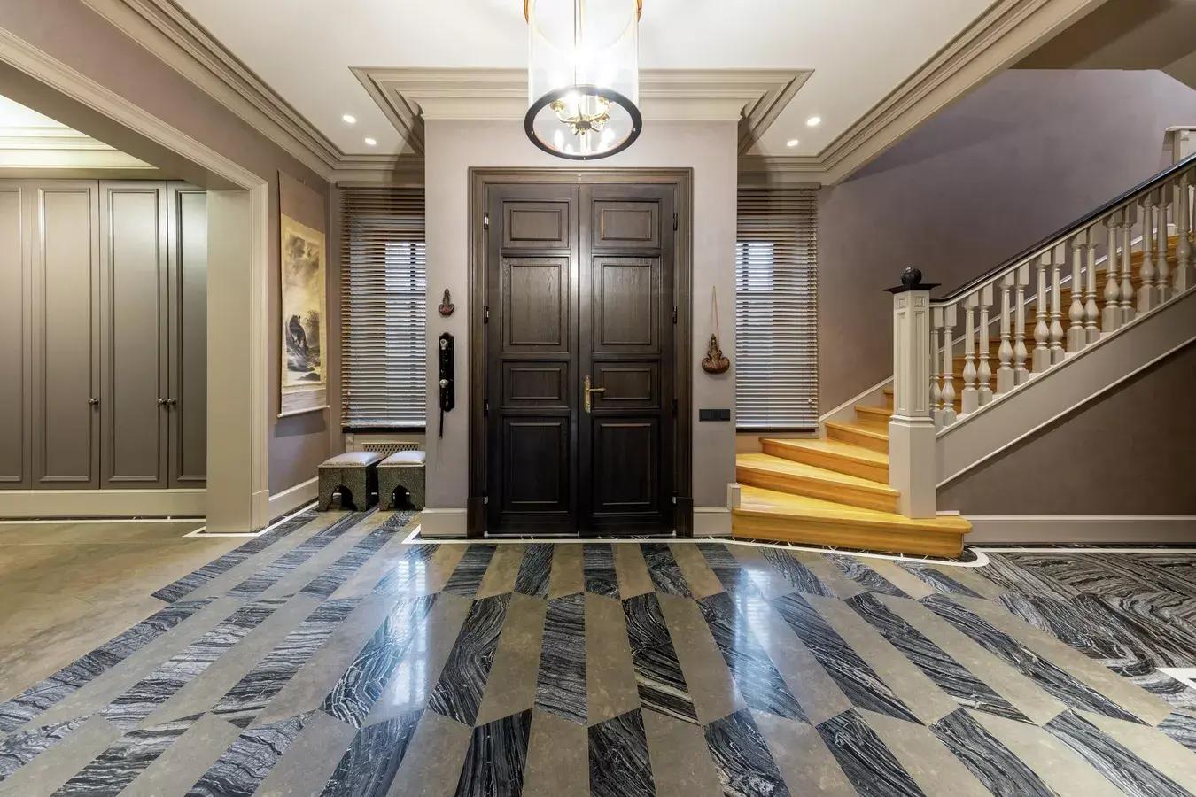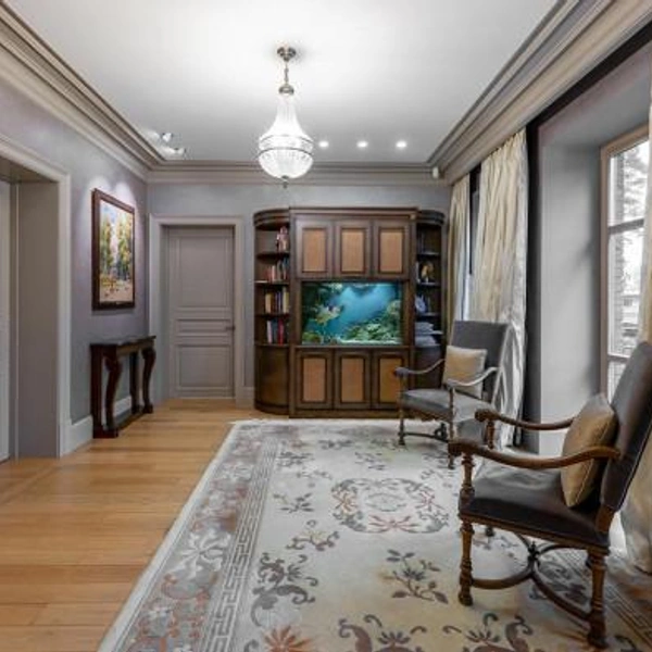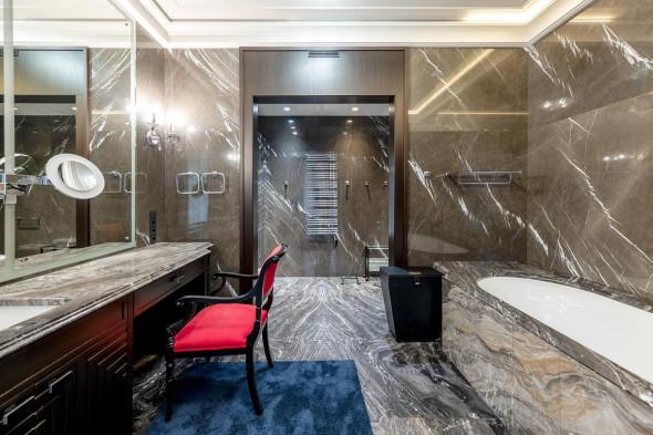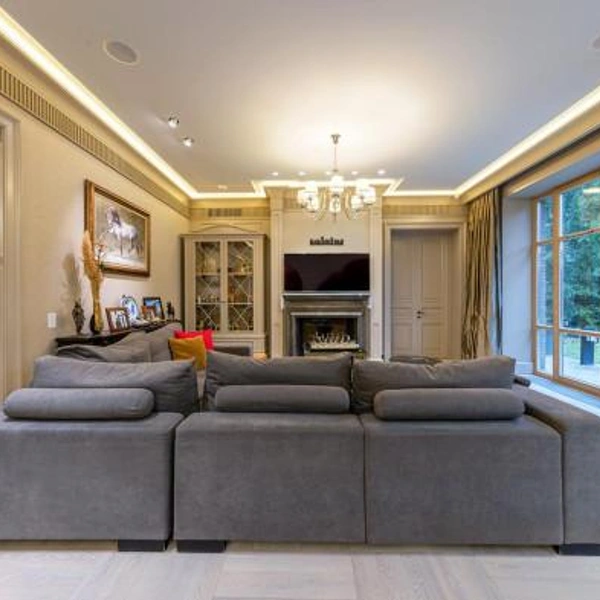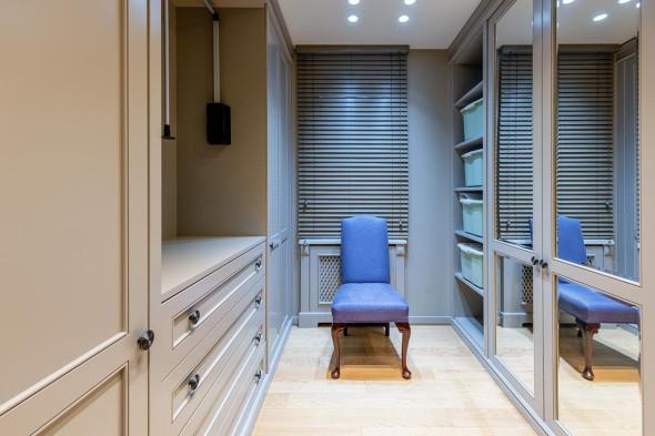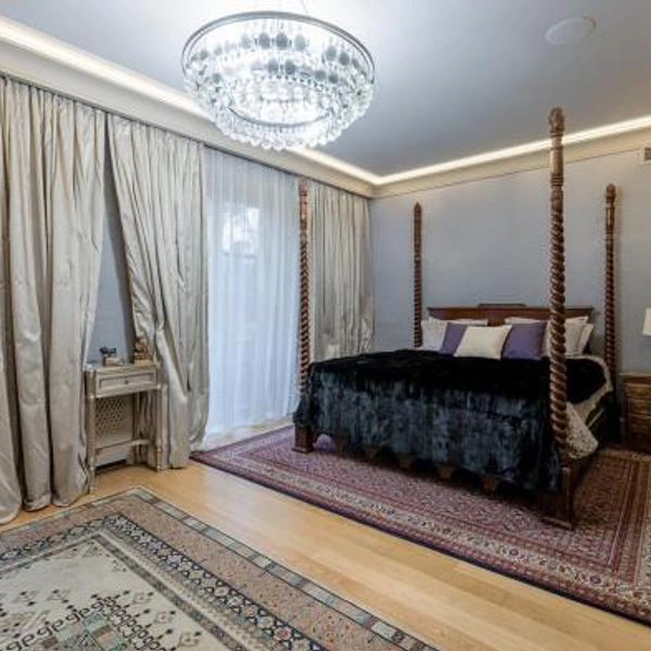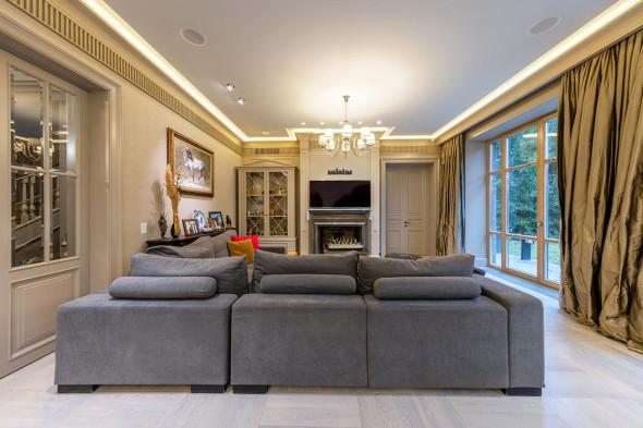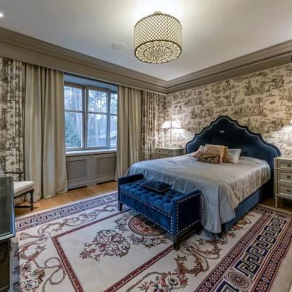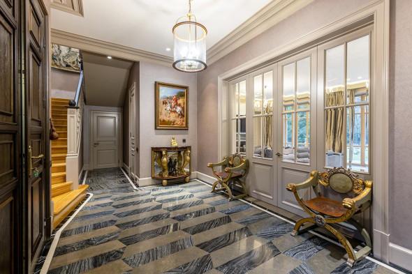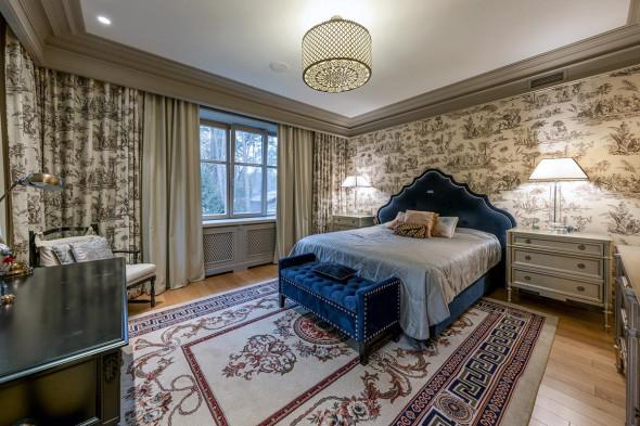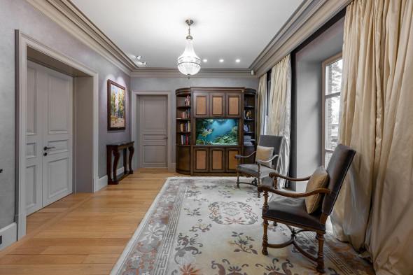 В особняке, оформлненном в стиле современной американской классики, на первом этаже находятся гостиная, кухня, домашний кинотеатр, кабинет, гардеробная и комната для хранения чемоданов, прачечная, гостевой санузел, ванная. Второй этаж — личный, там расположены три спальни со своими санузлами и гардеробными.