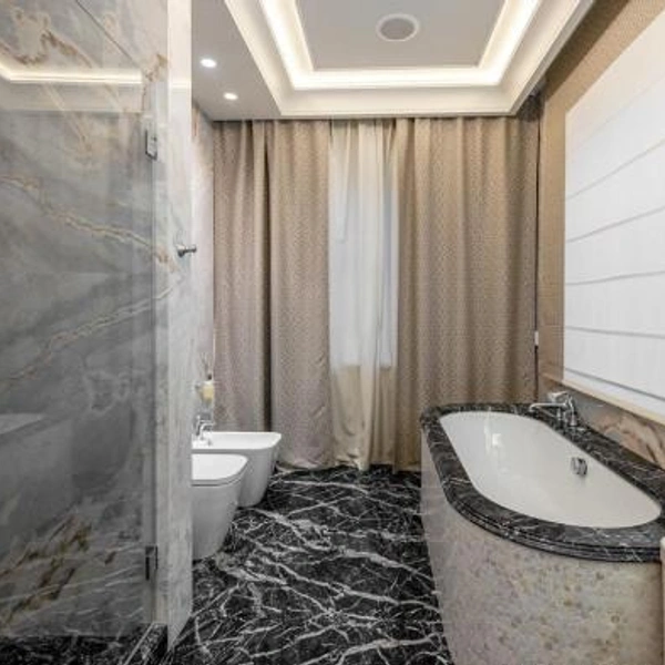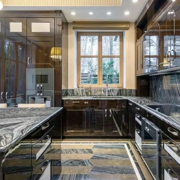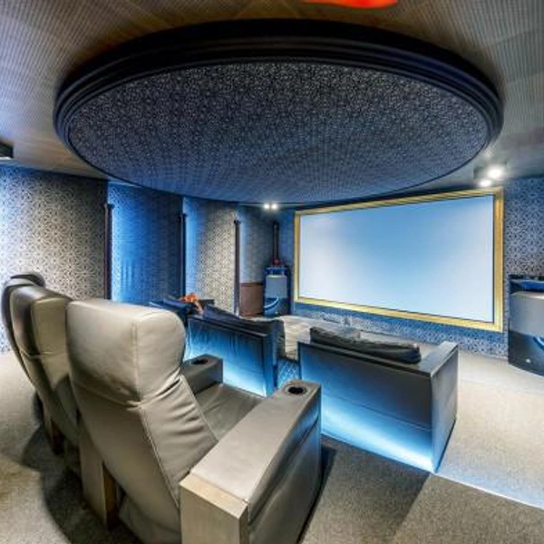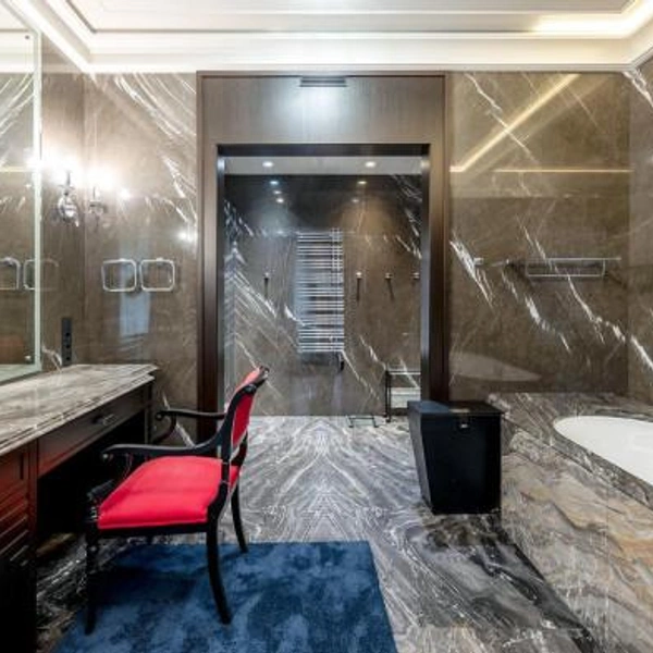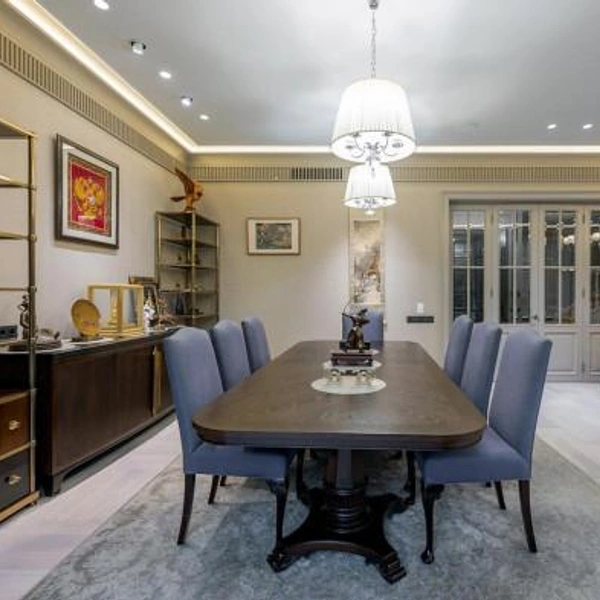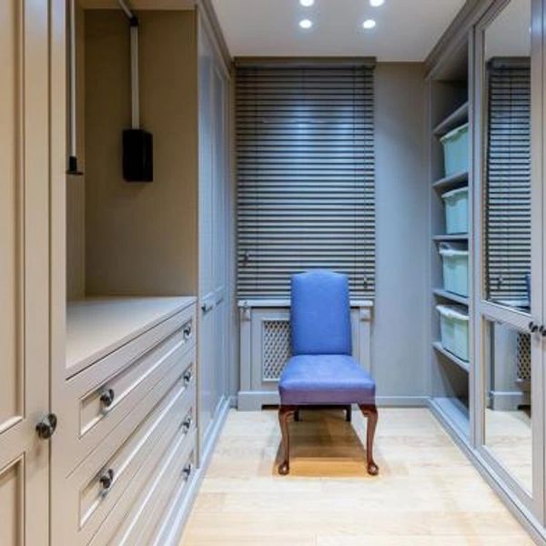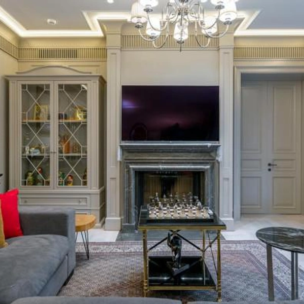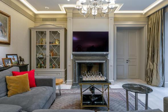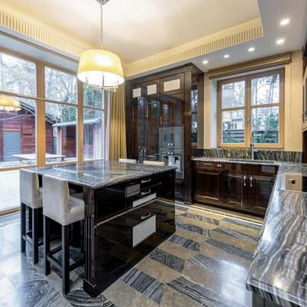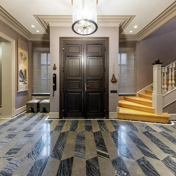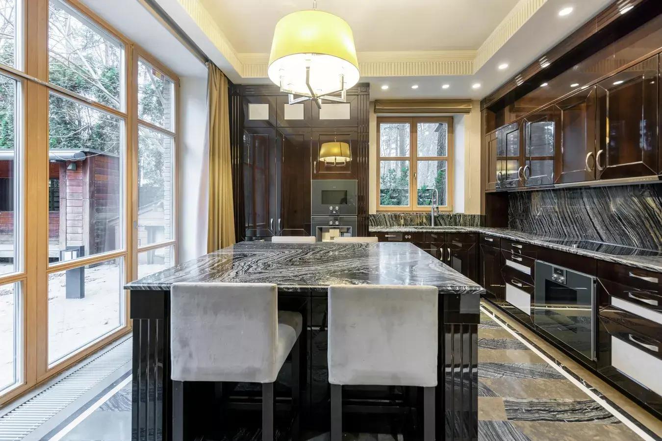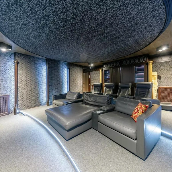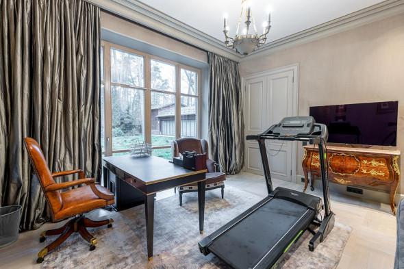 В особняке, оформлненном в стиле современной американской классики, на первом этаже находятся гостиная, кухня, домашний кинотеатр, кабинет, гардеробная и комната для хранения чемоданов, прачечная, гостевой санузел, ванная. Второй этаж — личный, там расположены три спальни со своими санузлами и гардеробными.