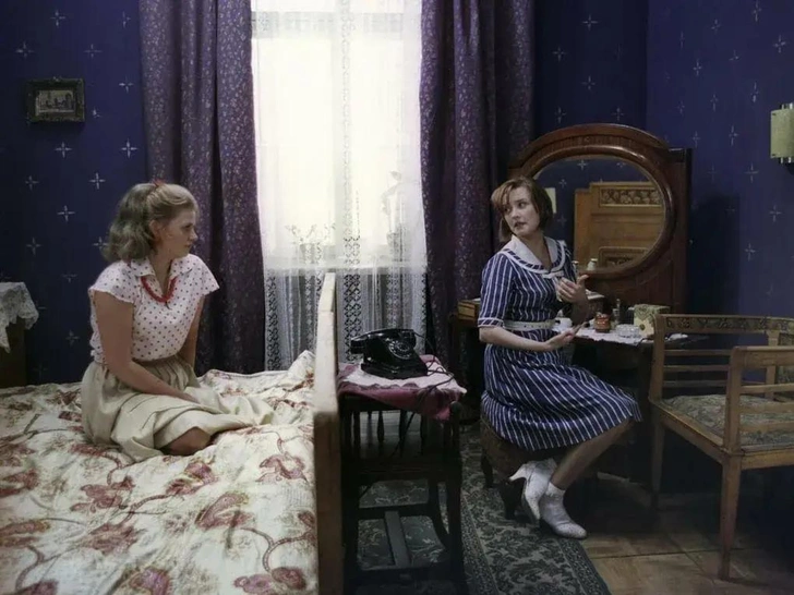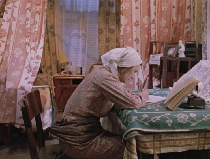 На кухне — обычный, но аккуратный гарнитур, а также маленький телевизор «Юность» с телескопической антенной. Тогда такие только появлялись. Красиво смотрятся и воздушные розовые шторы, на фоне которых сидит Александра. У нее, кстати, есть собственный бобинный магнитофон (вспомните знаменитую сцену, где она мечтательно слушает музыку!)