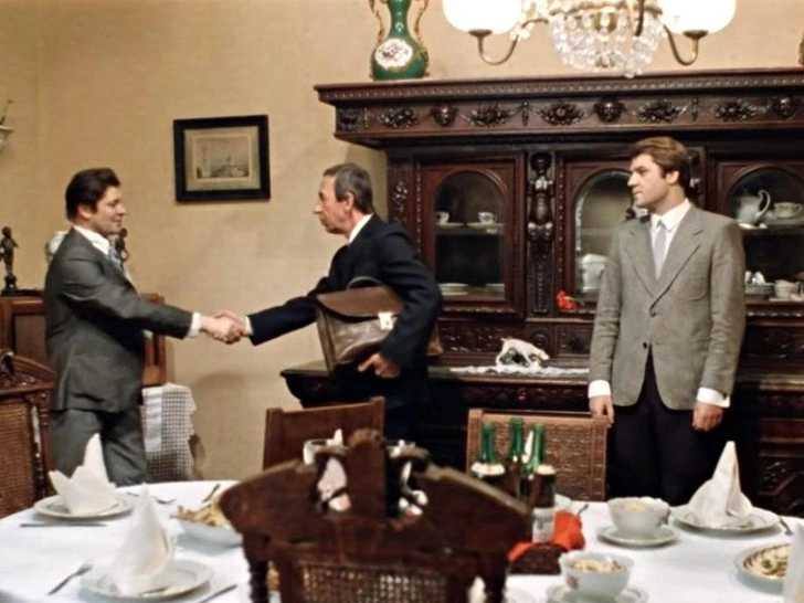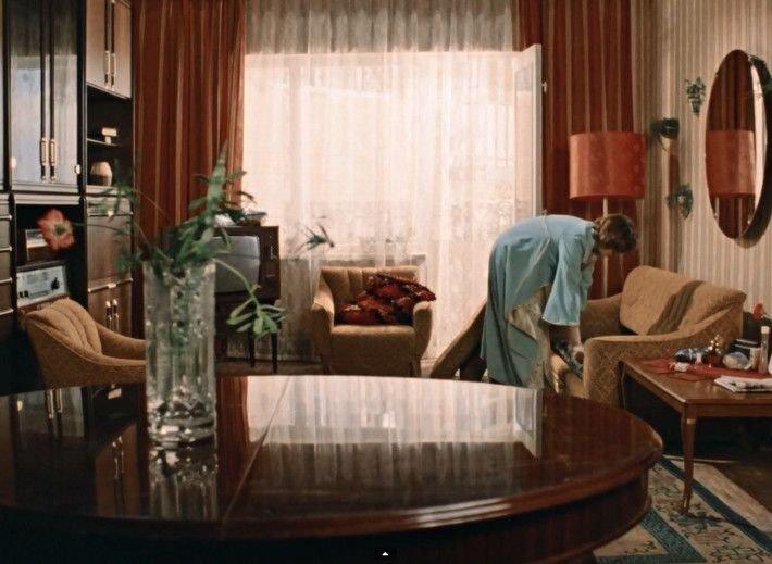 Может, современный человек, не живший в советское время, не увидит в этом интерьере ничего особенного и не заметит предметы тогдашней роскоши. Это, конечно, не тот статус, как у жителей высотки на Котельнической, но все же давайте всмотримся: темный круглый стол, граненая ваза, хрустальная посуда, югославский шкаф-стенка, красивые шторы и торшер, изящная мягкая группа с раскладным диваном-кроватью.