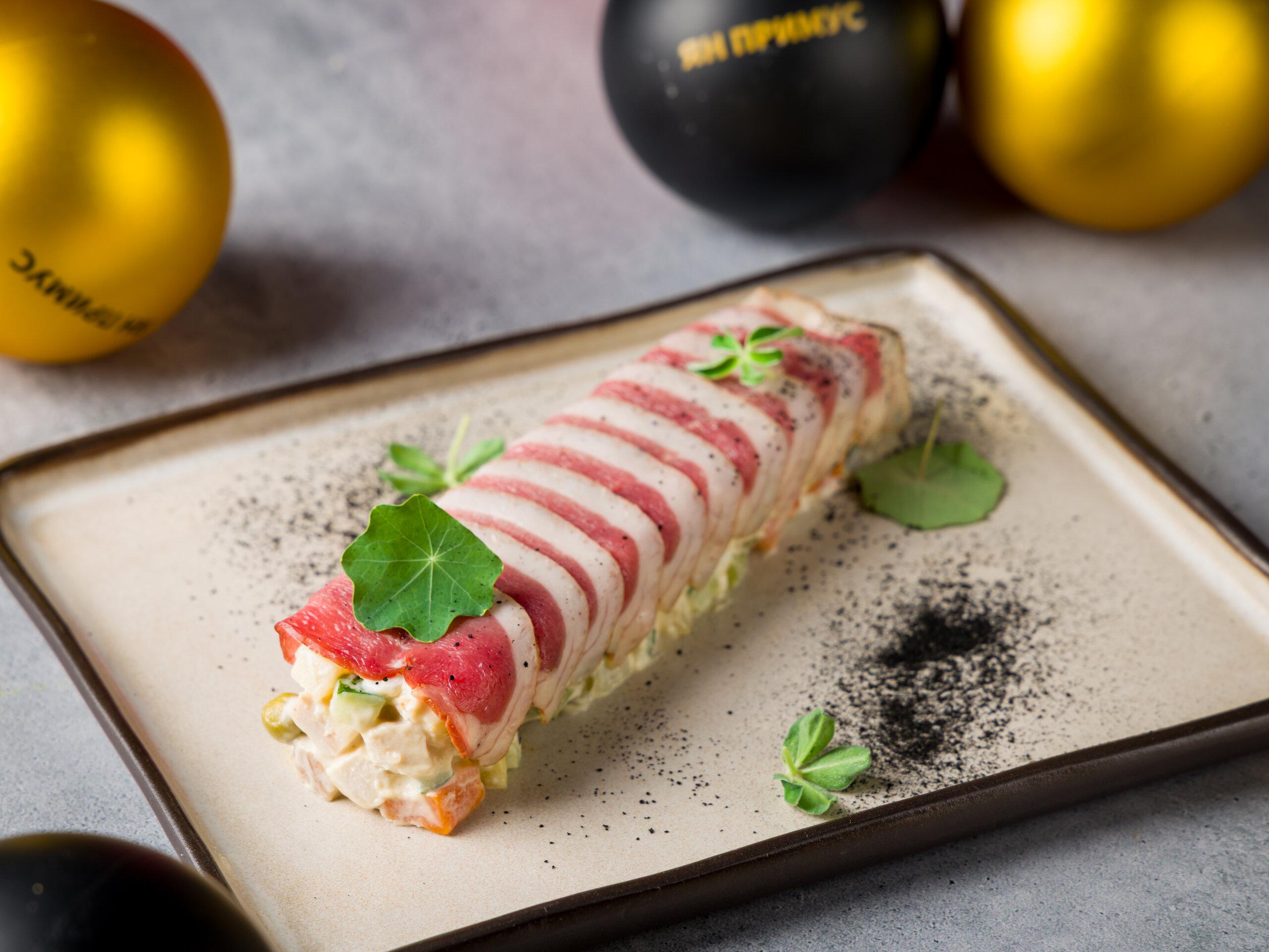 На центр тарелки поставьте прямоугольную форму, выложите в нее часть салатной основы оливье и аккуратно удалите форму. Утиное филе нарежьте очень тонкими слайсами и эразложите их поверх салата.