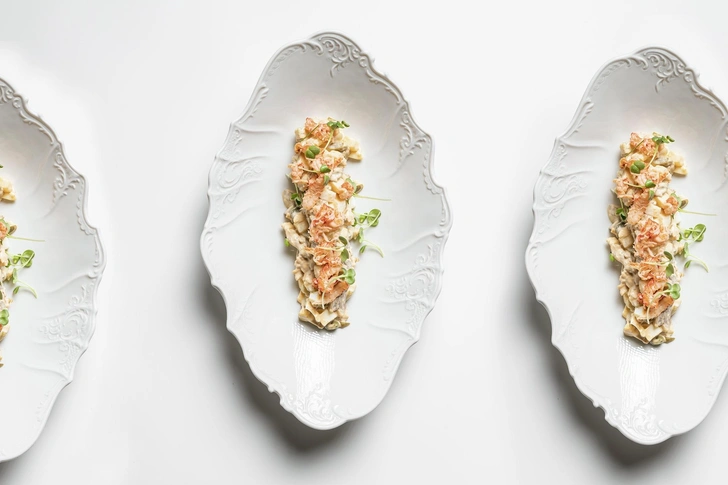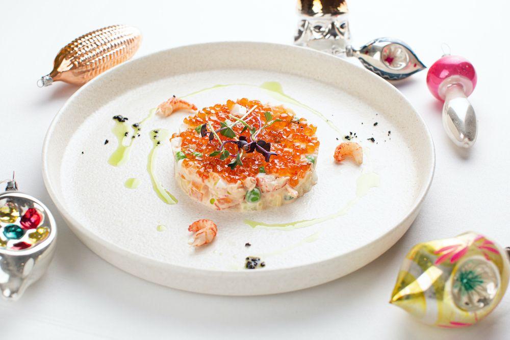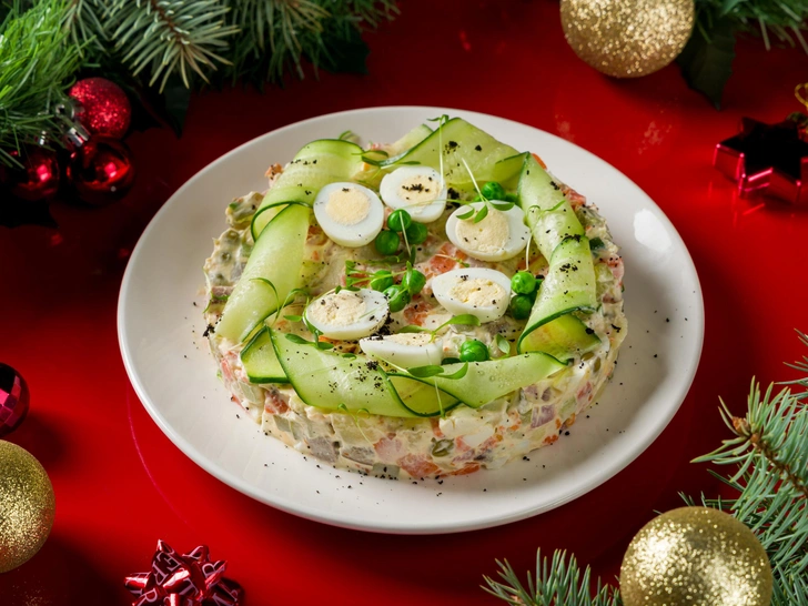Особенность этого варианта оливье - запеченая перепелка и раковые шейки, придающие насыщенный вкус