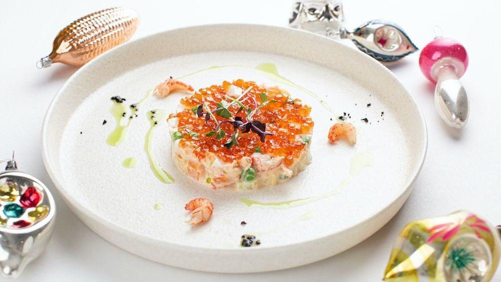 Вместо привычного мяса в этой версии оливье - обжаренные креветки