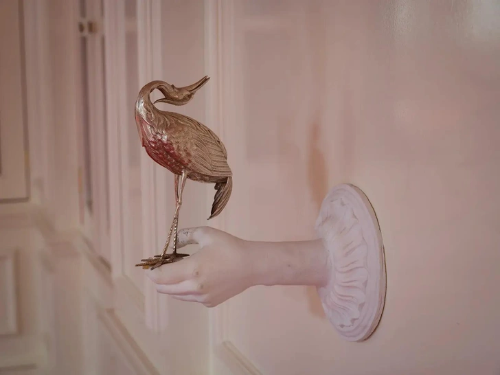 Самый сюрреалистичный элемент — так называемая «кожаная комната», спальня Катрин в Трашкросс-Грейндж. Дэвис напечатала фотографию руки Марго Робби на ткани, покрыла латексом и превратила в настенные панели. На них видны вены, родинки и даже веснушки — каждая панель уникальна. Туалетный столик и балдахин кровати украшены прядями блондинистых волос — деталь, которая одновременно отталкивает и притягивает.