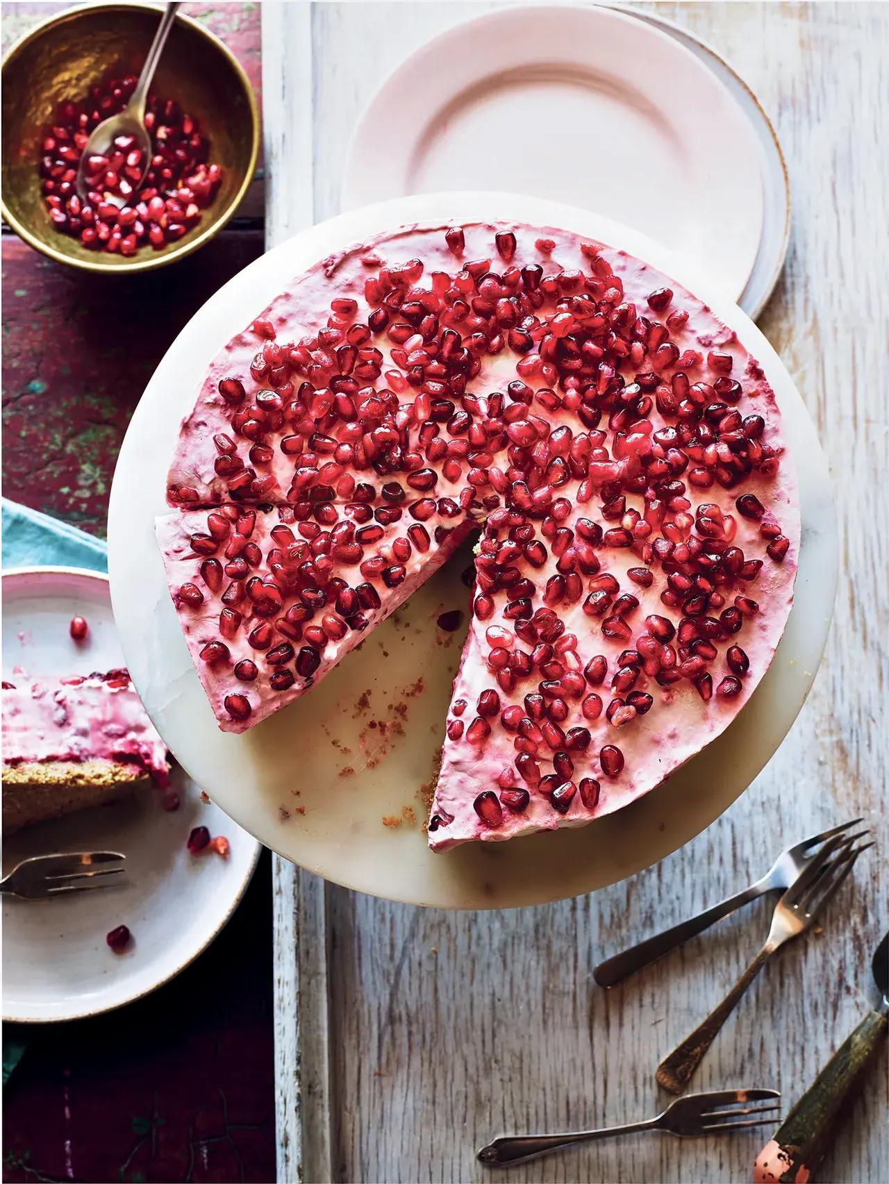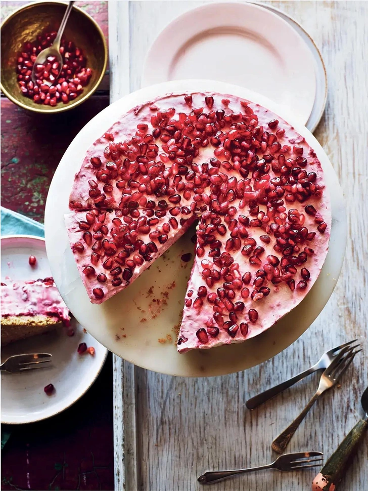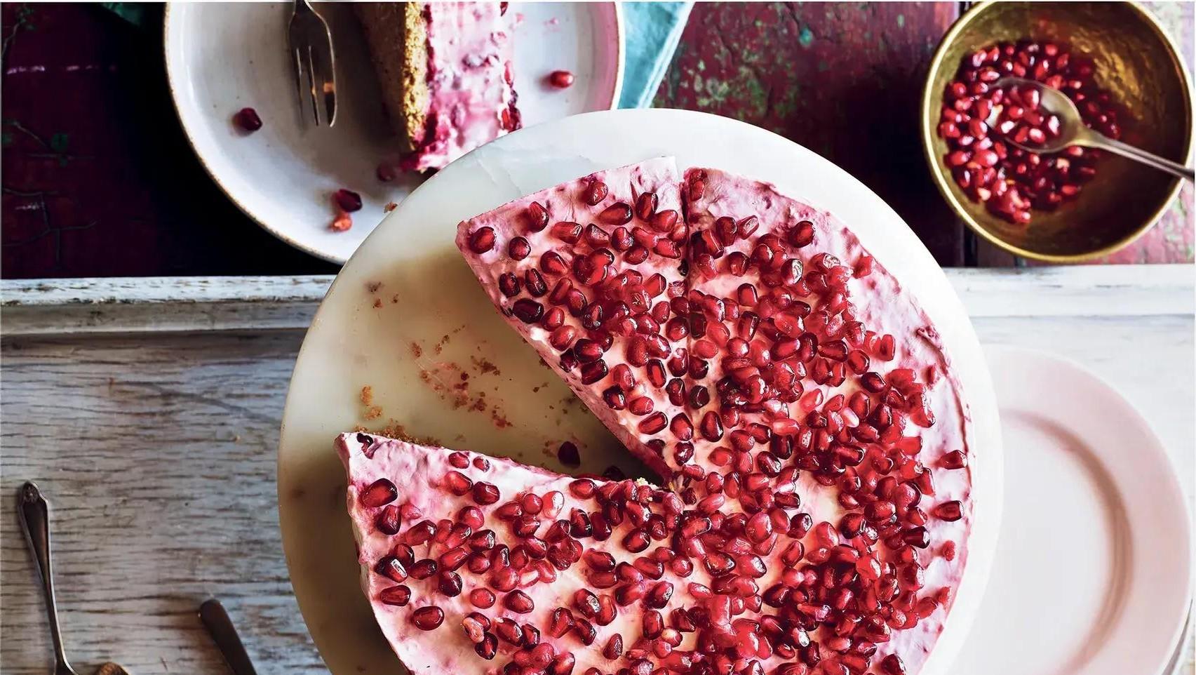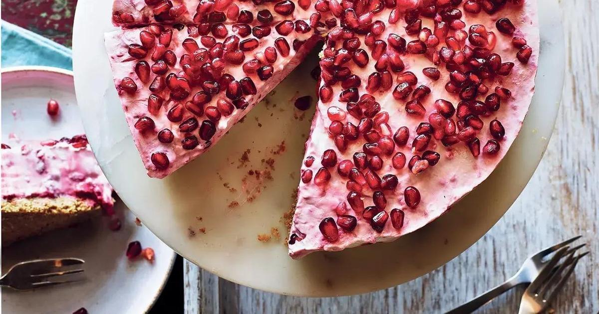 Достаньте из холодильника основу из печенья и смесь сливочного сыра и аккуратно выложите смесь на дно формы, заполняя её. Разровняйте поверхность лопаткой. Убедитесь, что зёрна граната сухие, затем выложите их на верх чизкейка слоем так, чтобы они покрывали смесь сливочного сыра. Поставьте в холодильник на 8 часов или на ночь.