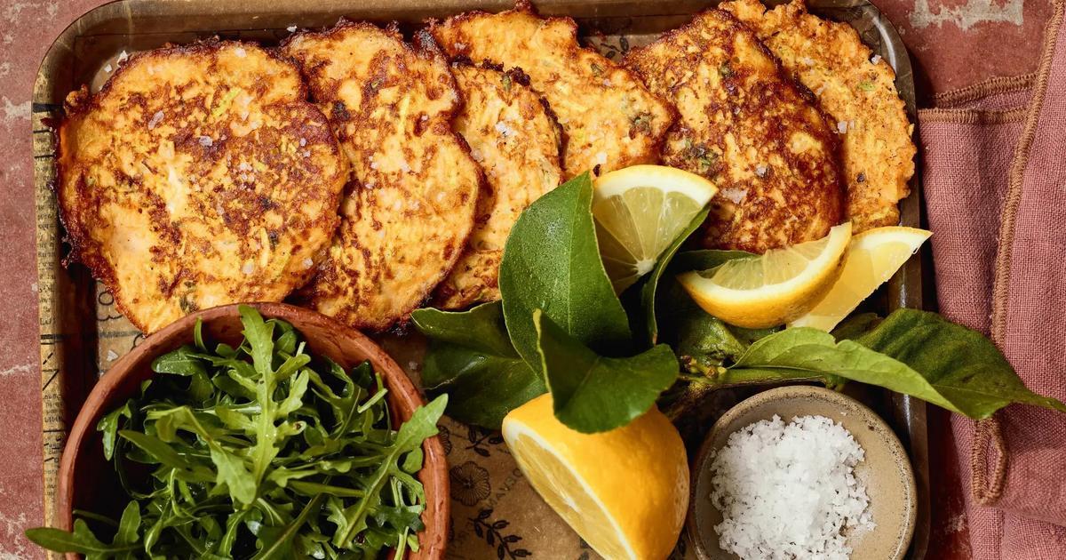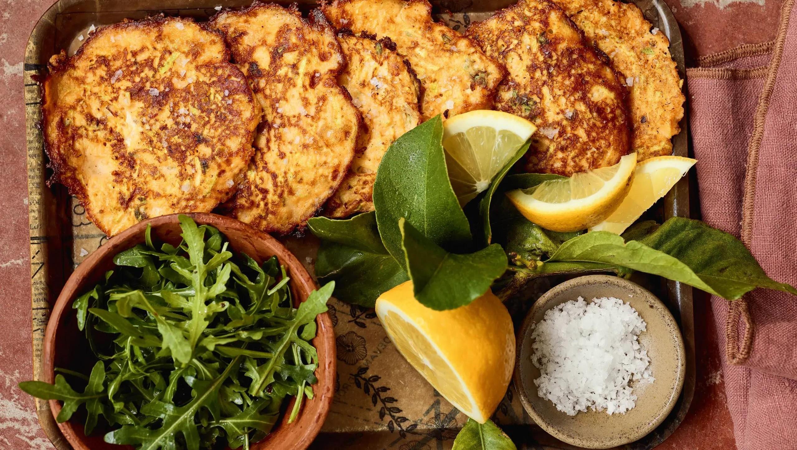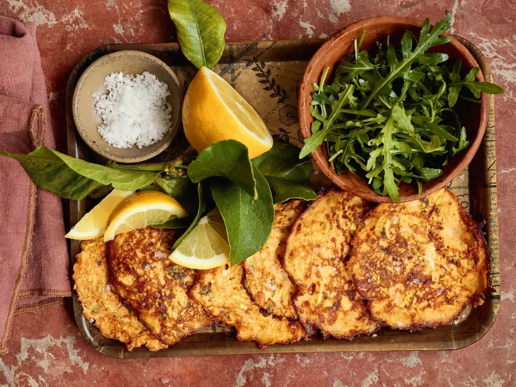Полейте рукколу небольшим количеством масла, добавьте немного лимонного сока и щепотку соли и подавайте с оладьями.