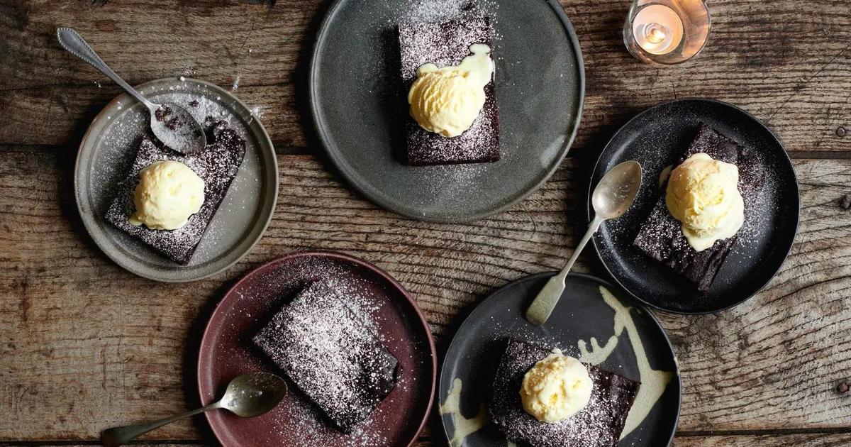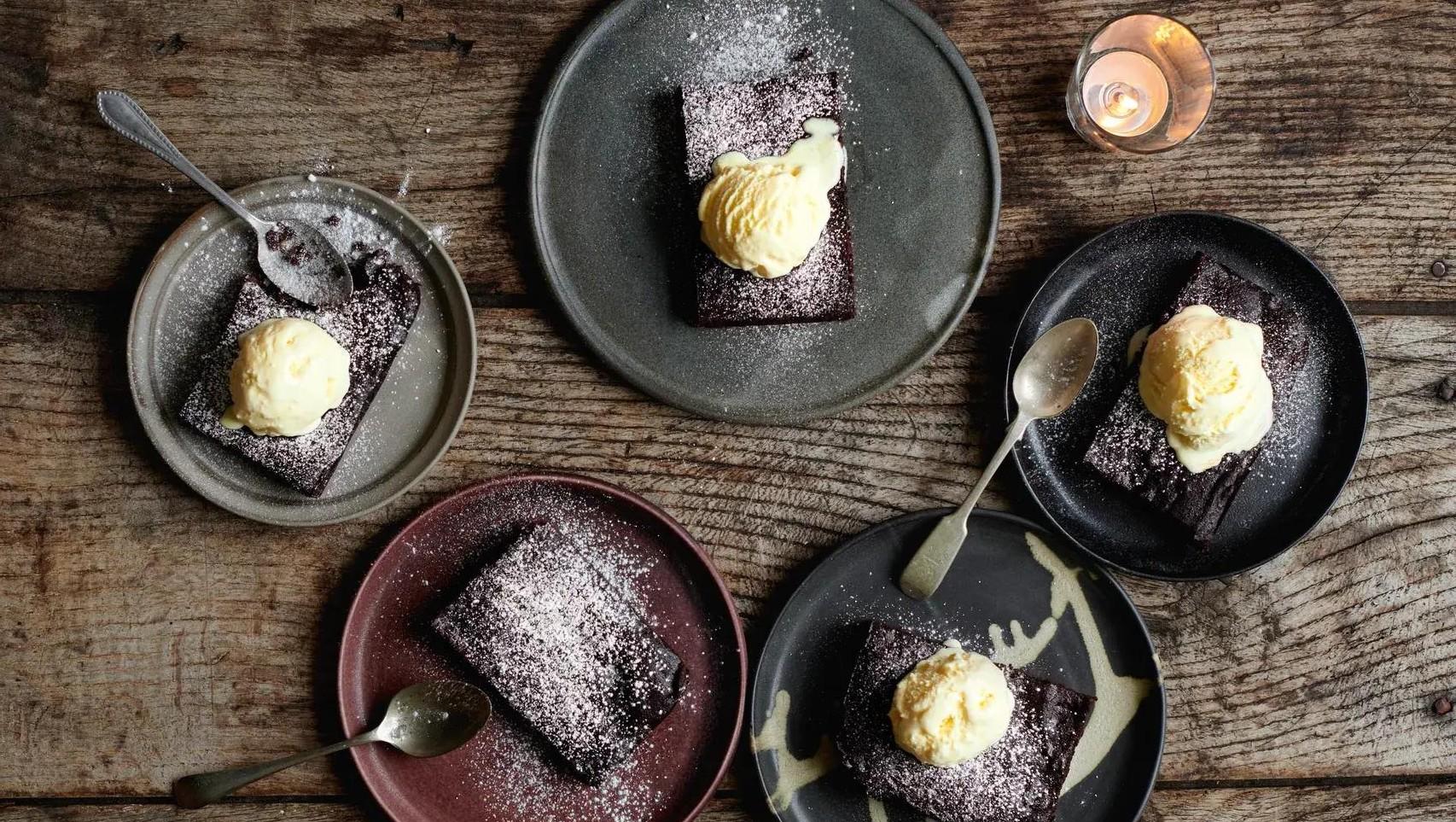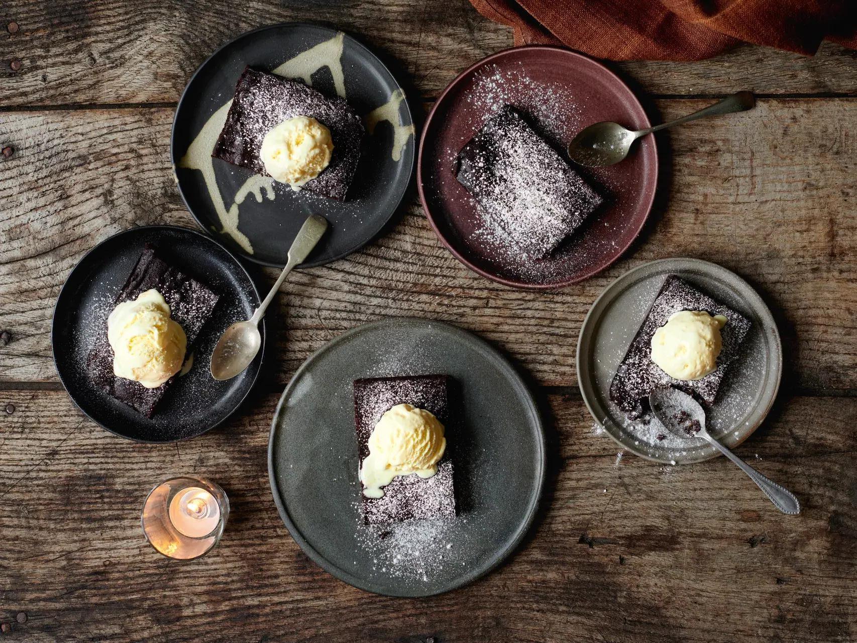 Выньте из духовки и дайте брауни полностью остыть в форме, затем аккуратно переверните и нарежьте на порции. Посыпьте сахарной пудрой и подавайте с шариками ванильного мороженого.